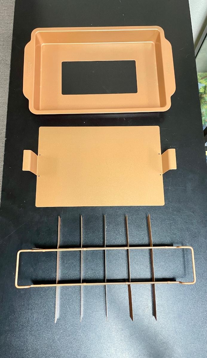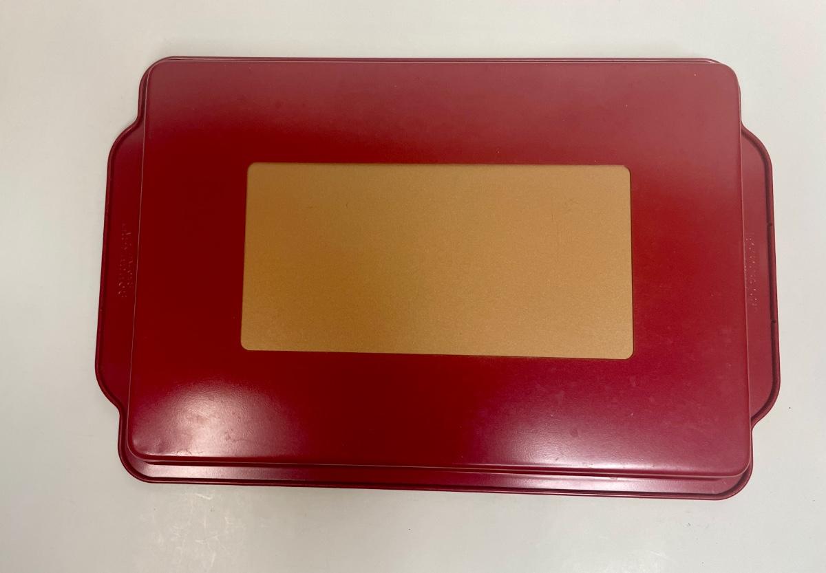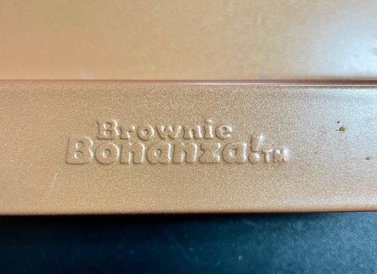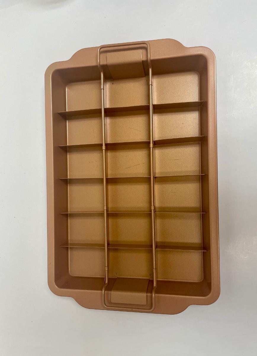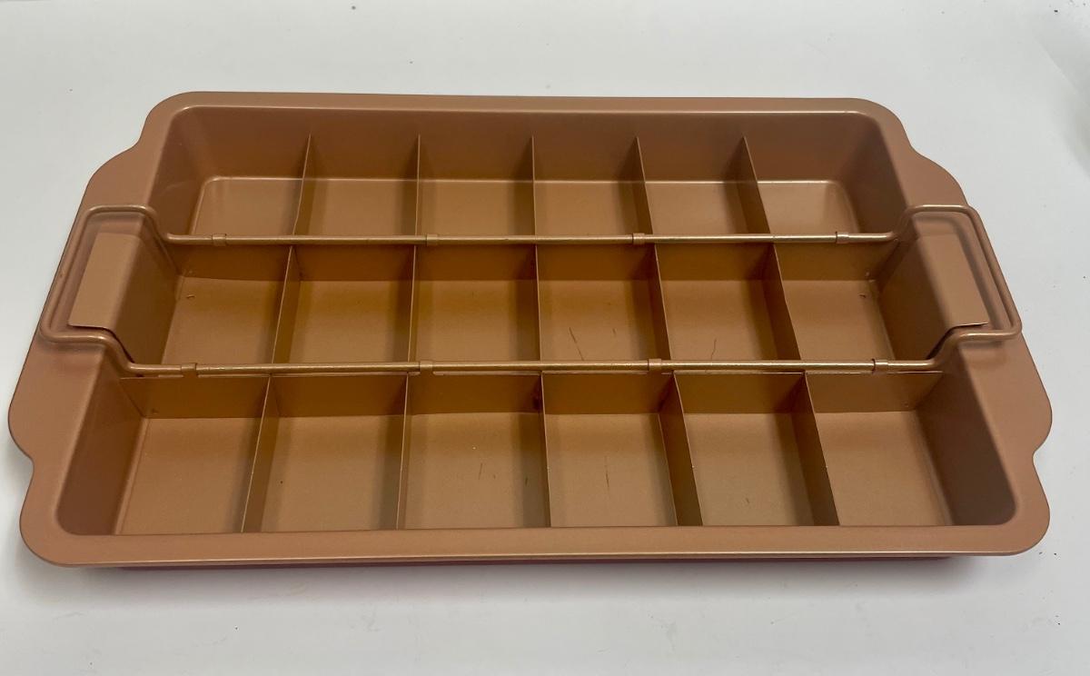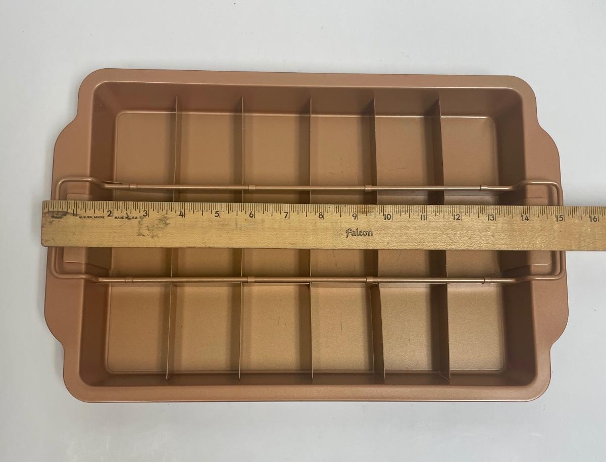 Approx. 9" x 12". Includes pan, lift-out bottom, and grid brownie drop-in cutter. In very good shape.