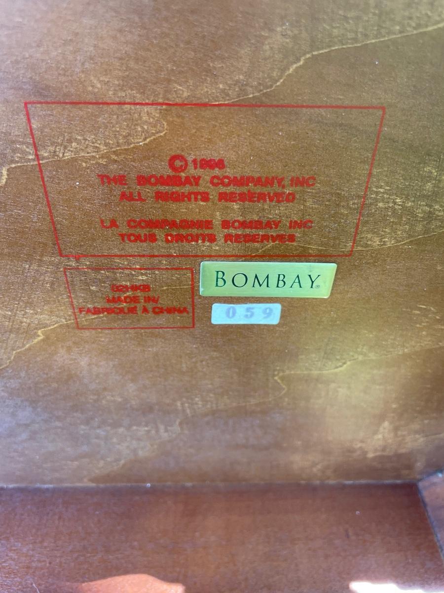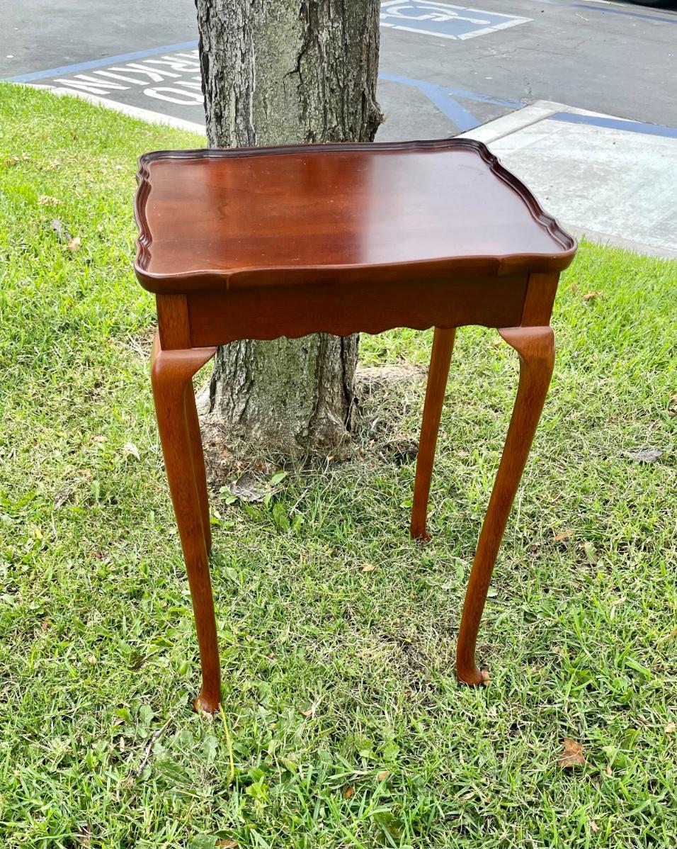Mahogany end table. Modern, but in a vintage style (made in China in 1996 for the Bombay company). Fancy edge bead on table top edge. Approx. size 13" x 14" x 21" tall.