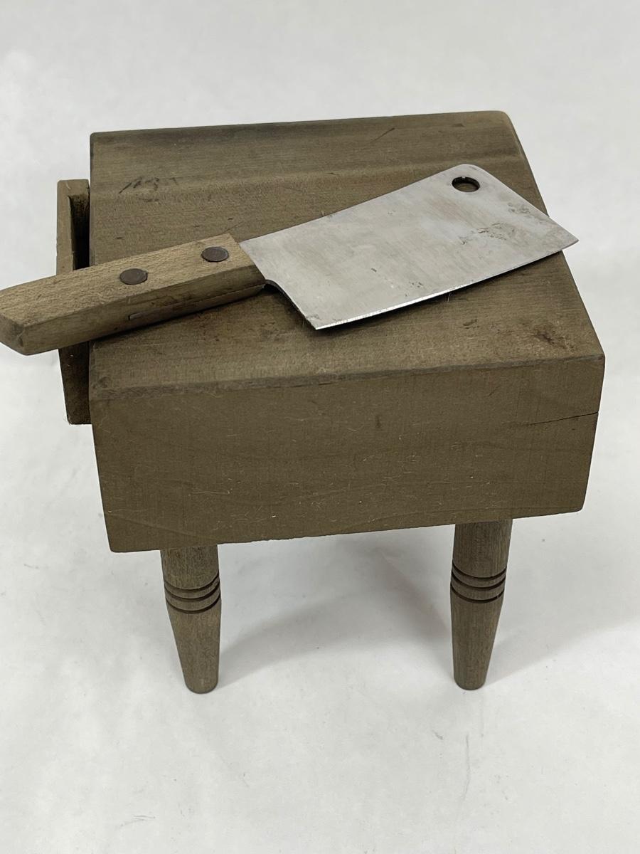 Vintage Dollhouse Butcher Block with Meat Cleaver stamped Stainless Steel JAPAN