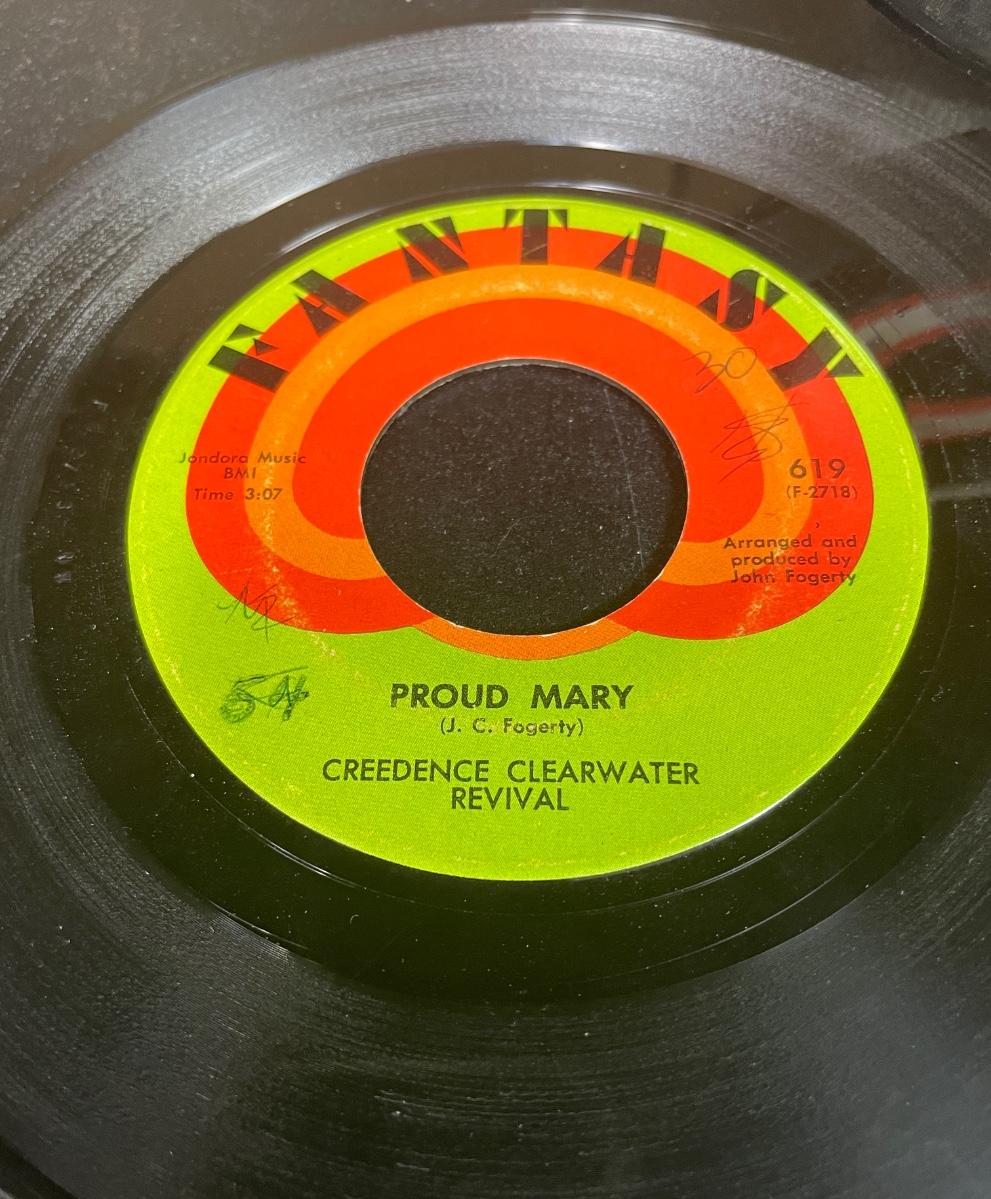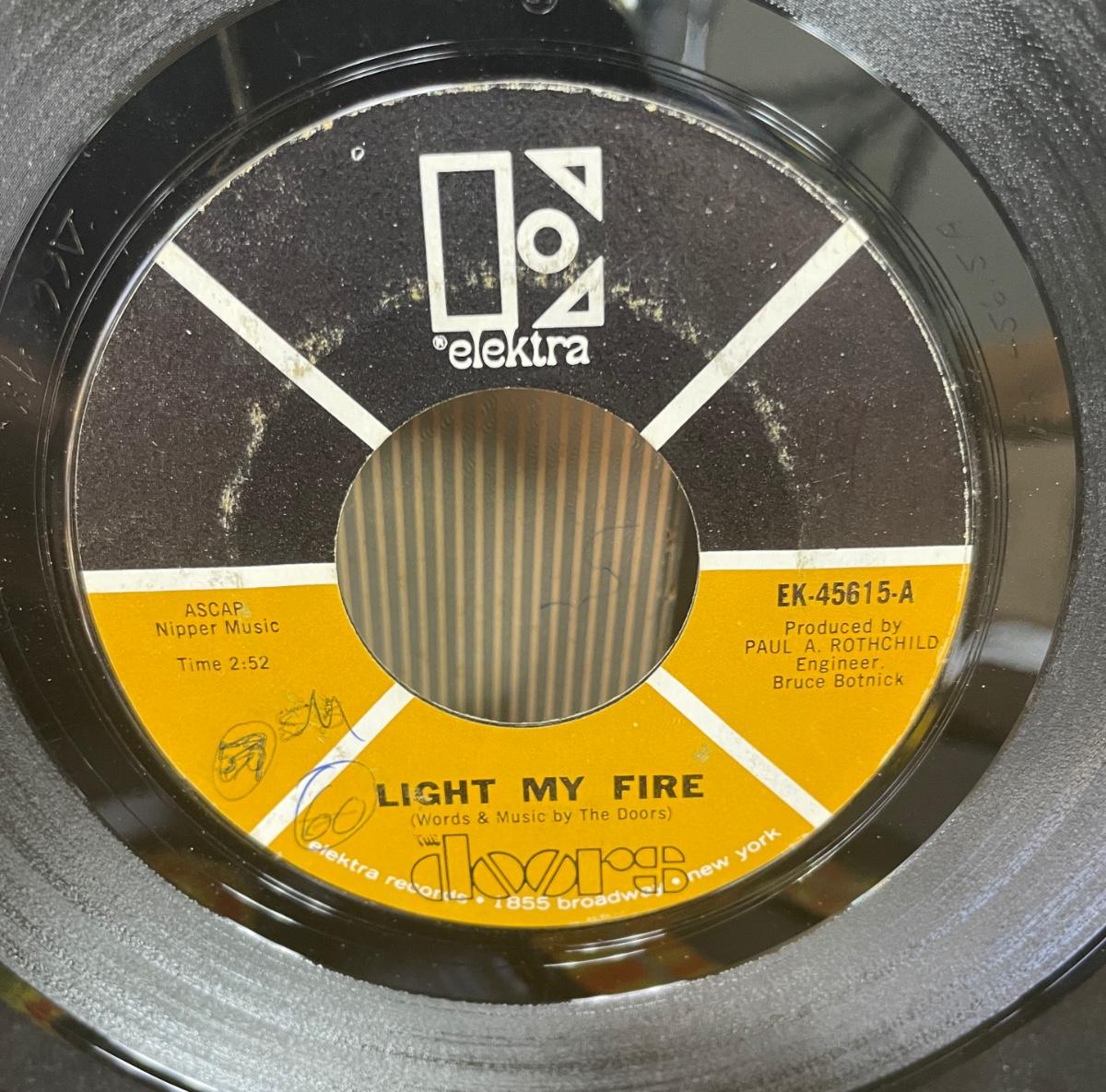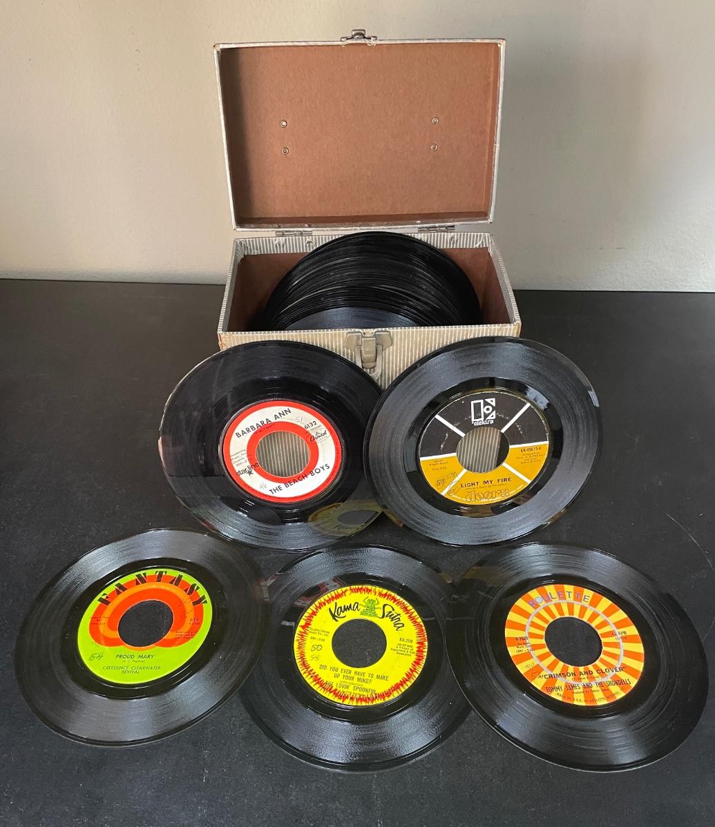 Case is in good condition. Includes 50 records, all in good to fair condition. Examples include: "Proud Mary" by Creedence Clearwater on Fantasy Records, "Did You Ever Have to Make Up your Mind" by The Lovin' Spoonful on Kama Sutra Records, "Crimson and Clover" by Tommy James and the Shondells on Roulette Records, "Light My Fire" by the Doors on Elektra Records, and "Barbara Ann" by The Beach Boys on Capitol Records.