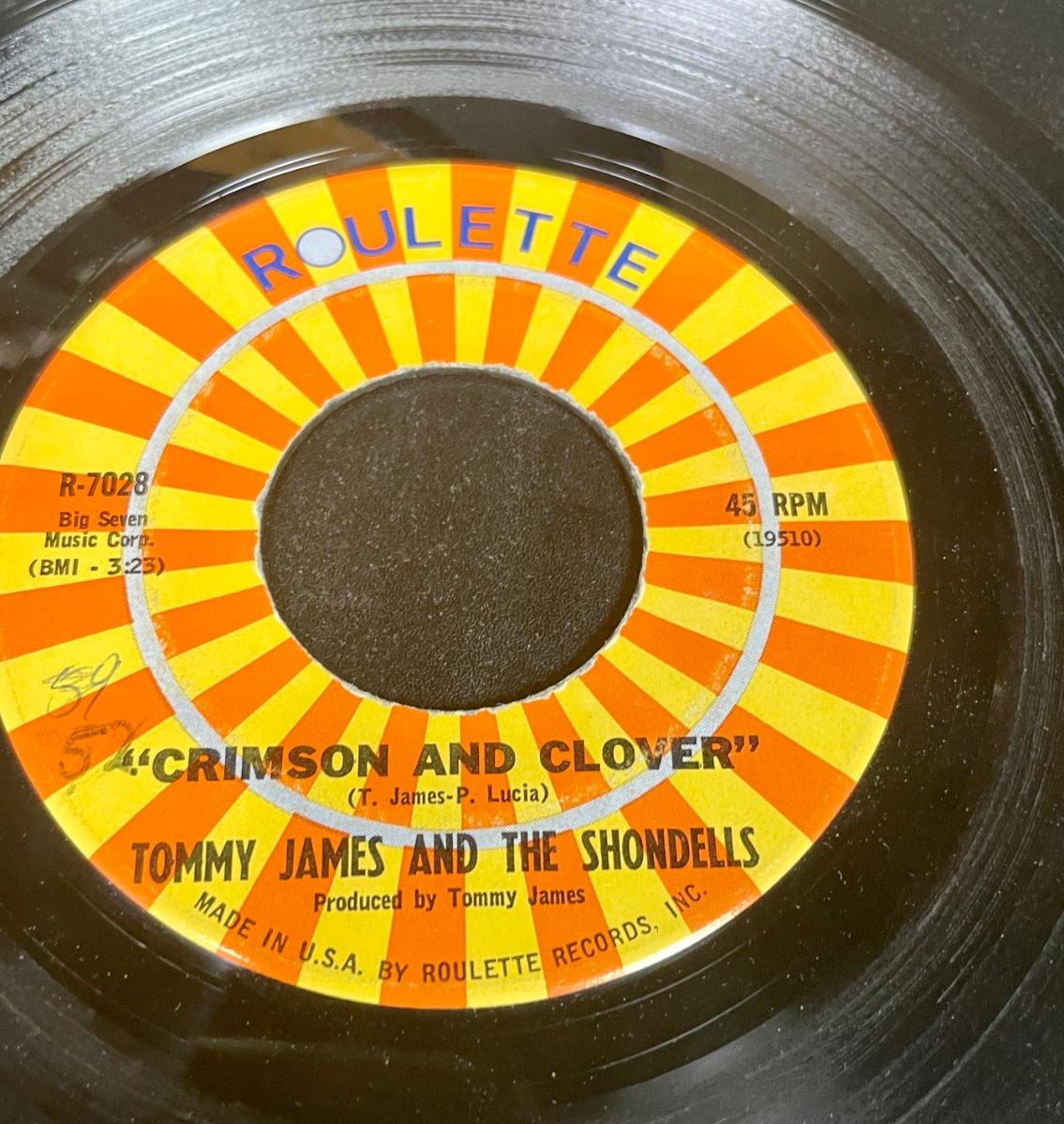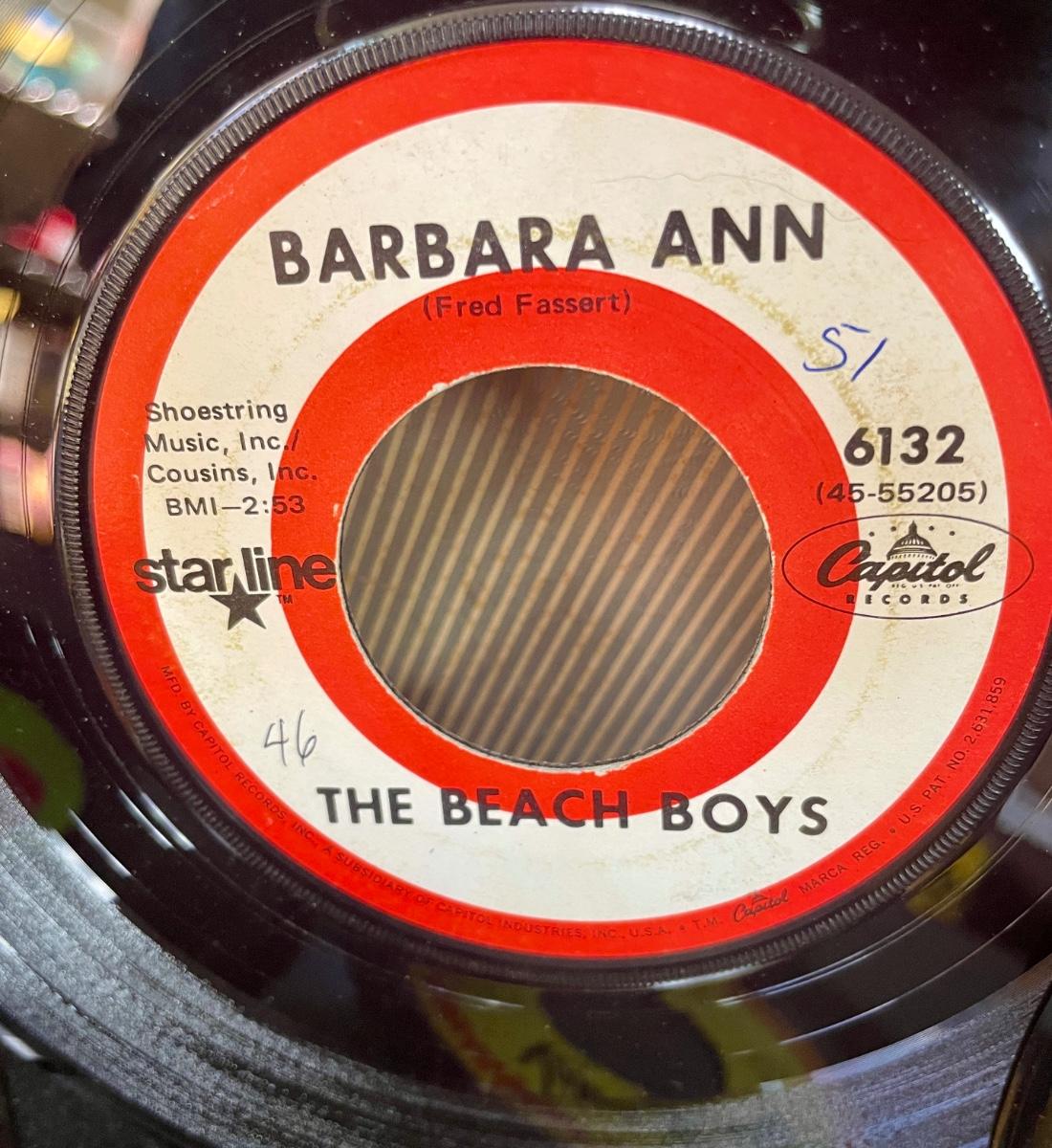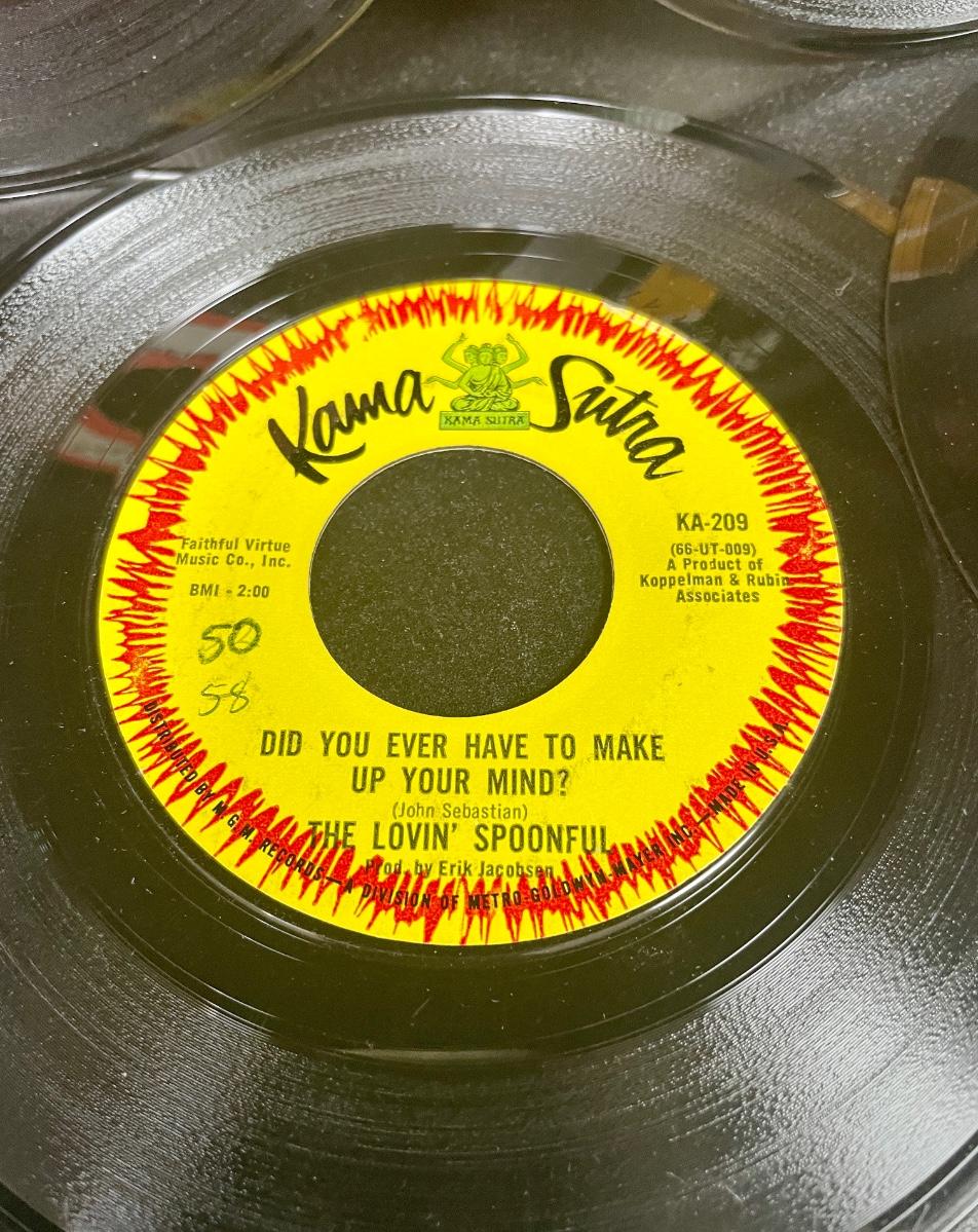Case is in good condition. Includes 50 records, all in good to fair condition. Examples include: "Proud Mary" by Creedence Clearwater on Fantasy Records, "Did You Ever Have to Make Up your Mind" by The Lovin' Spoonful on Kama Sutra Records, "Crimson and Clover" by Tommy James and the Shondells on Roulette Records, "Light My Fire" by the Doors on Elektra Records, and "Barbara Ann" by The Beach Boys on Capitol Records.
