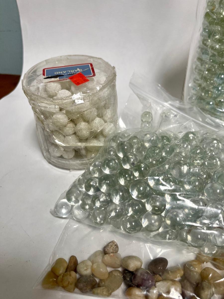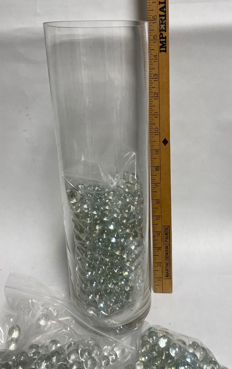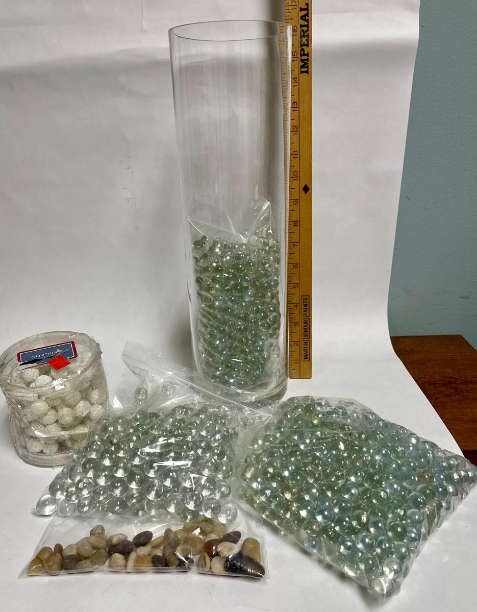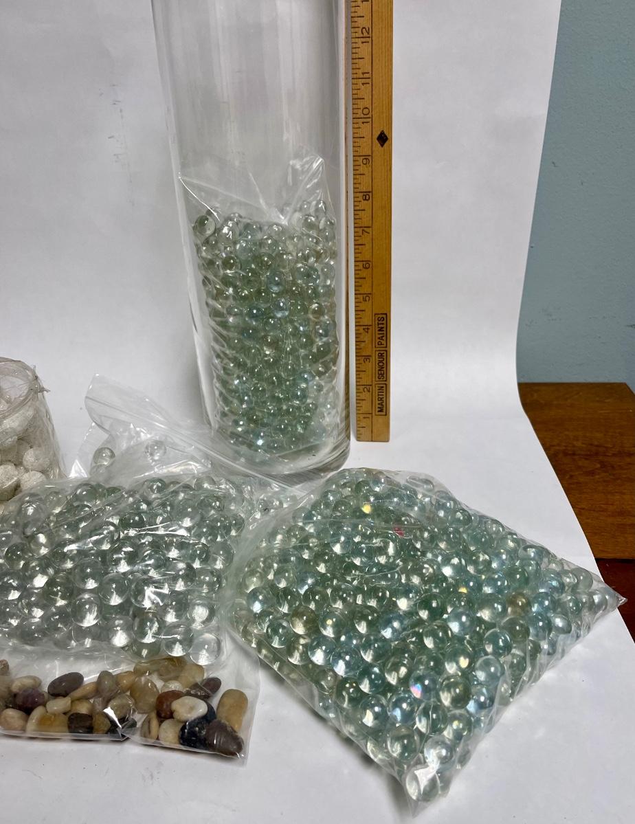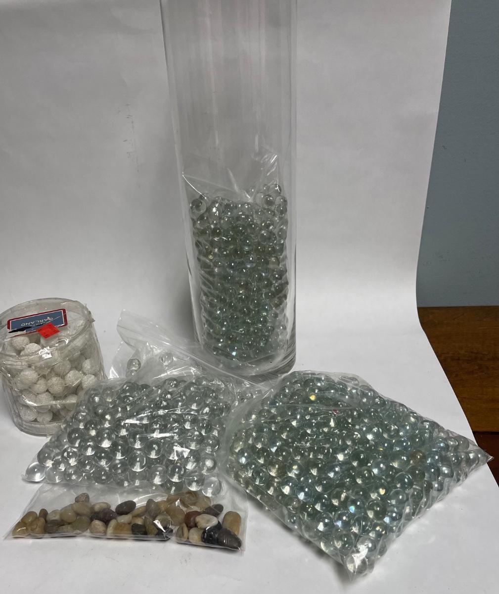 Cylindrical Clear Glass Vase with many types of filler marble and rocks
