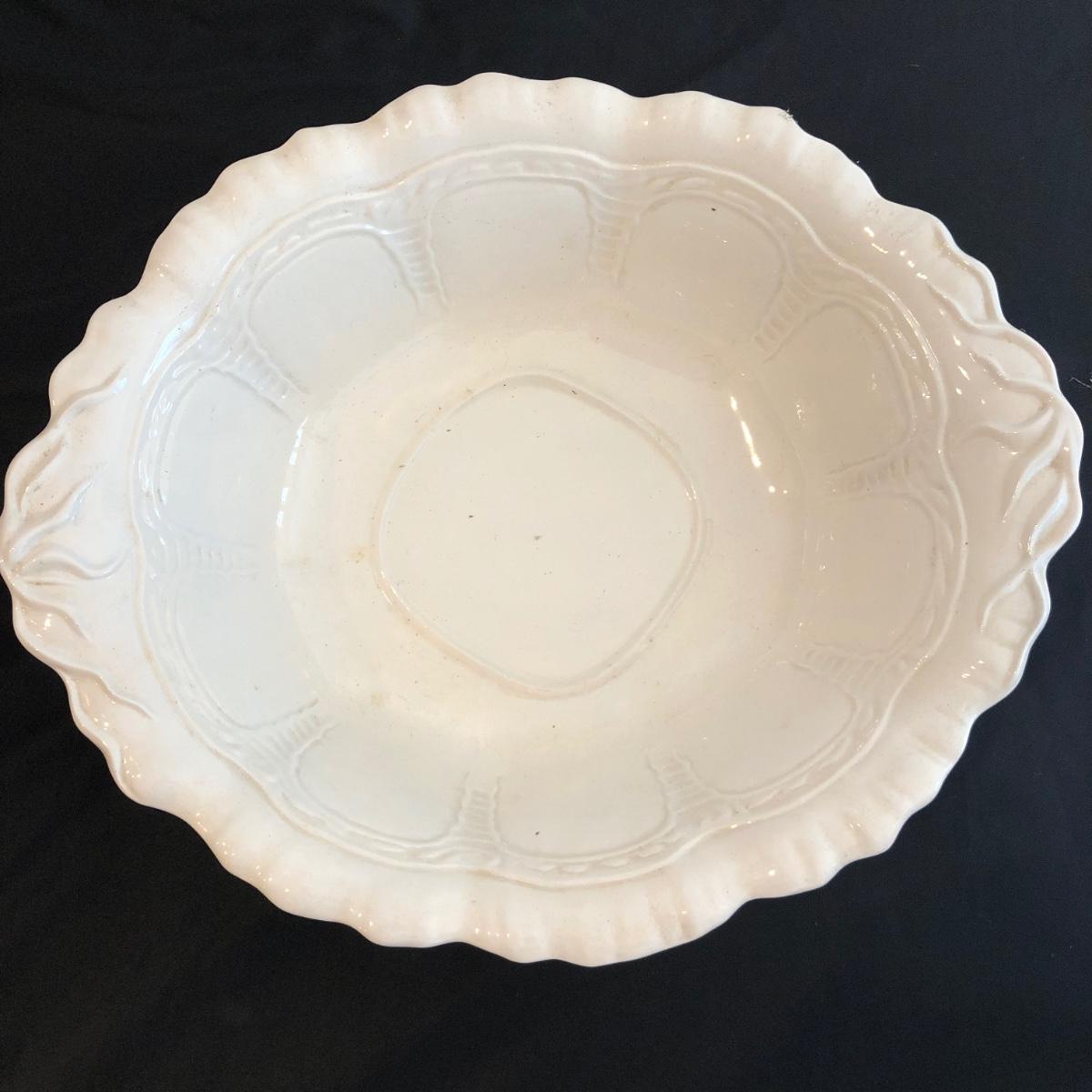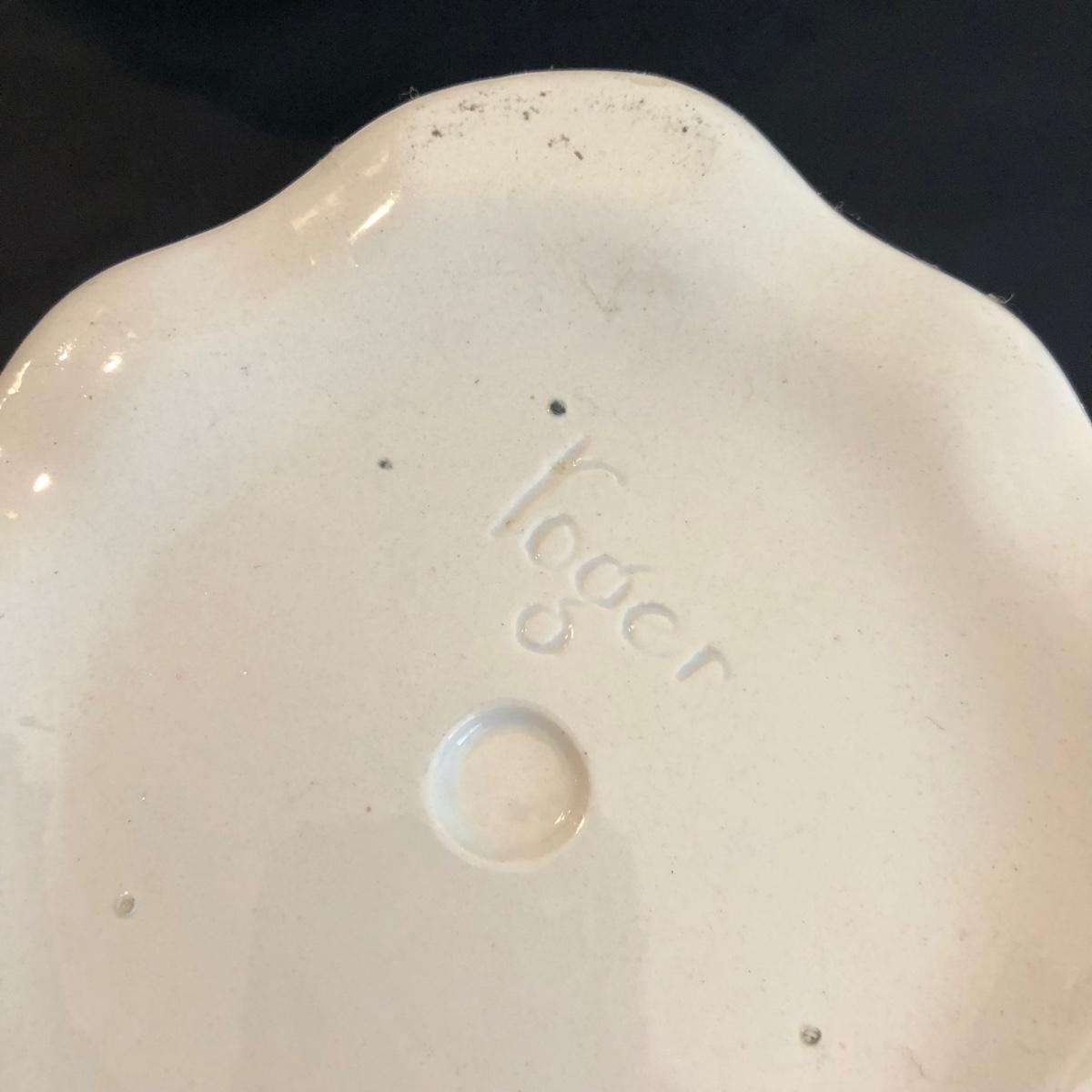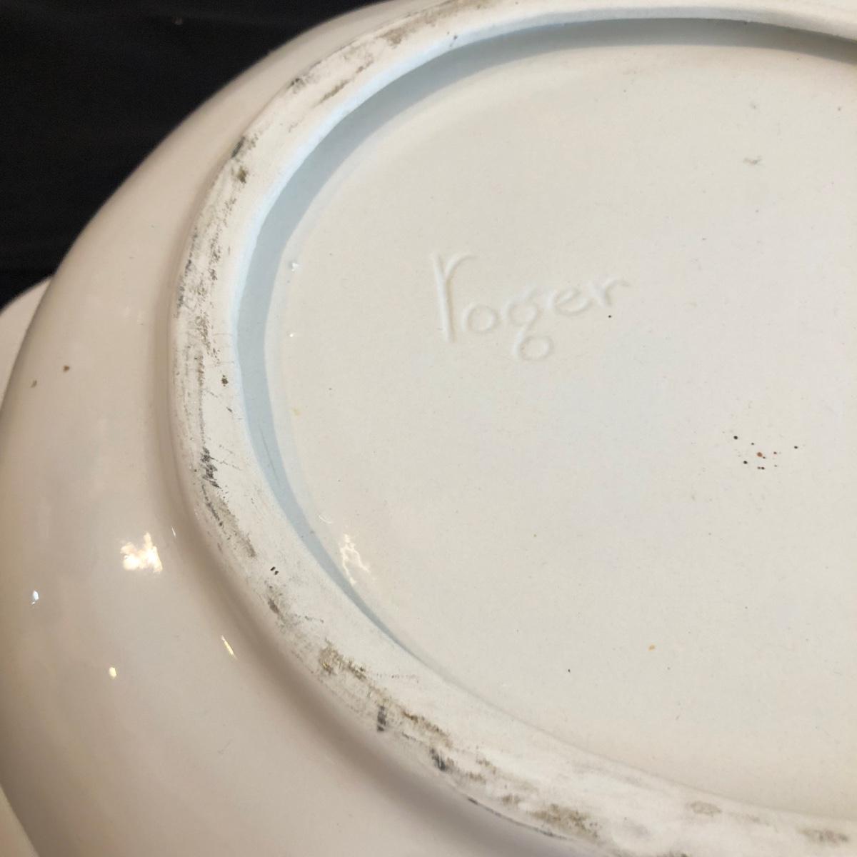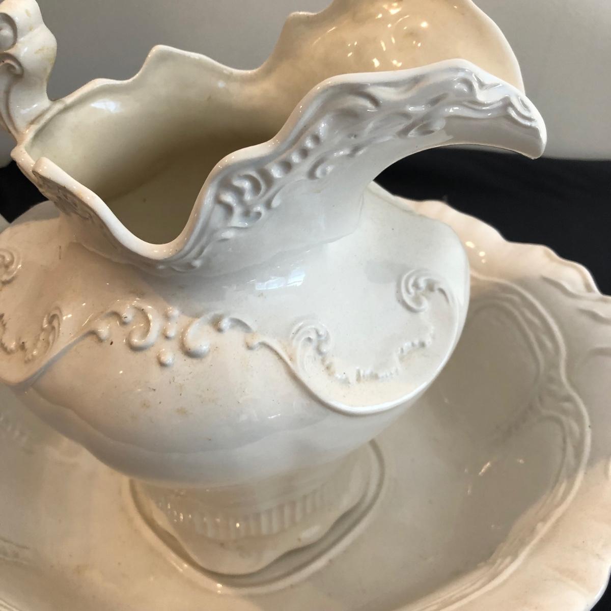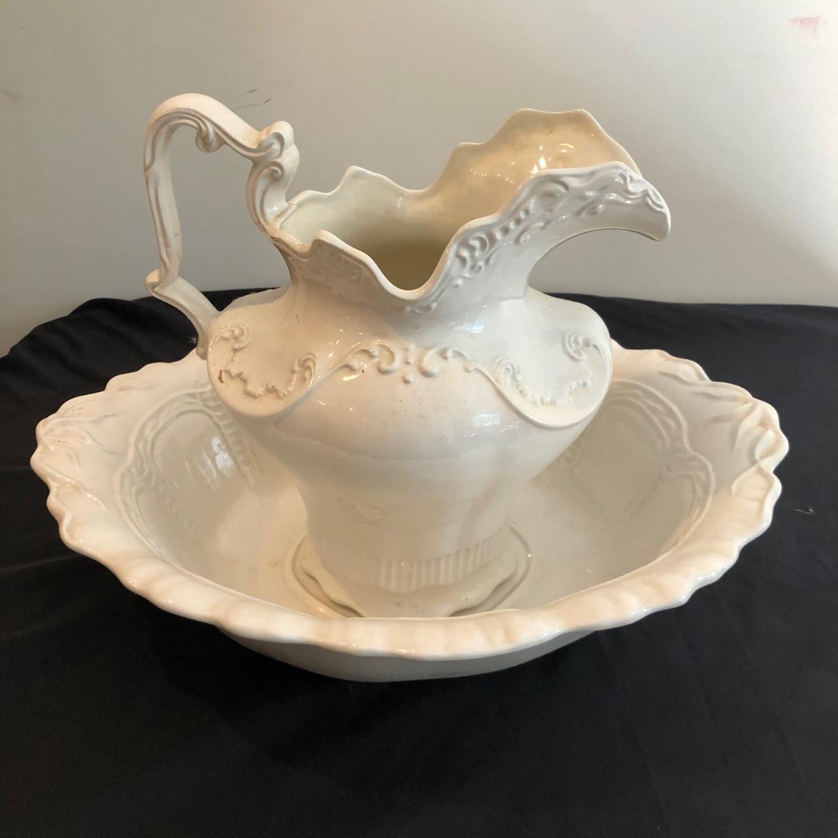 This ceramic washbasin and pitcher matching set by Roger is made of white ceramic. Swirling details decorate the pitcher and bowl. The pitcher measures 11” x 7.5” x 11”. Shipping available. Shipping pottery can be expensive. Please contact the local UPS store to get a shipping quote.