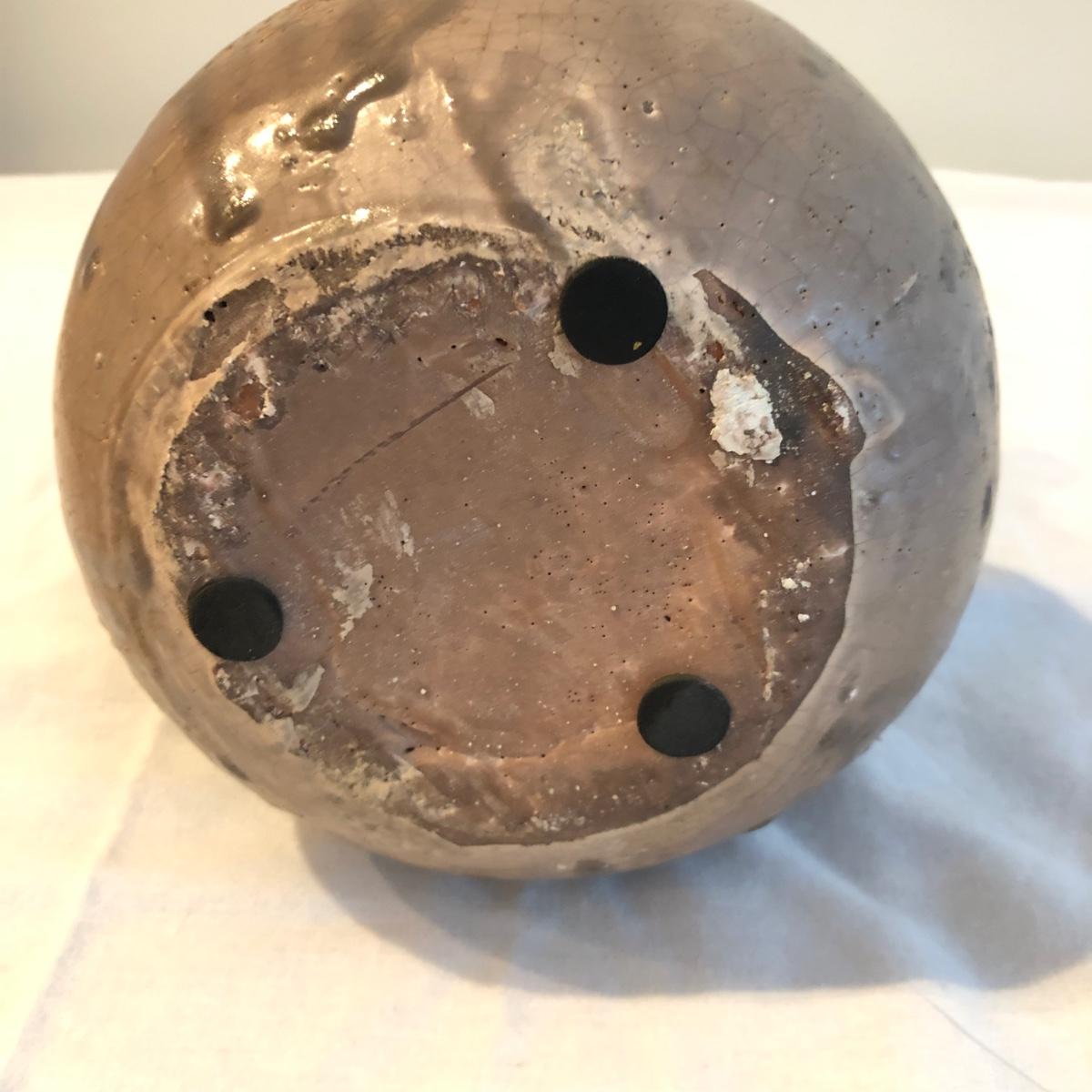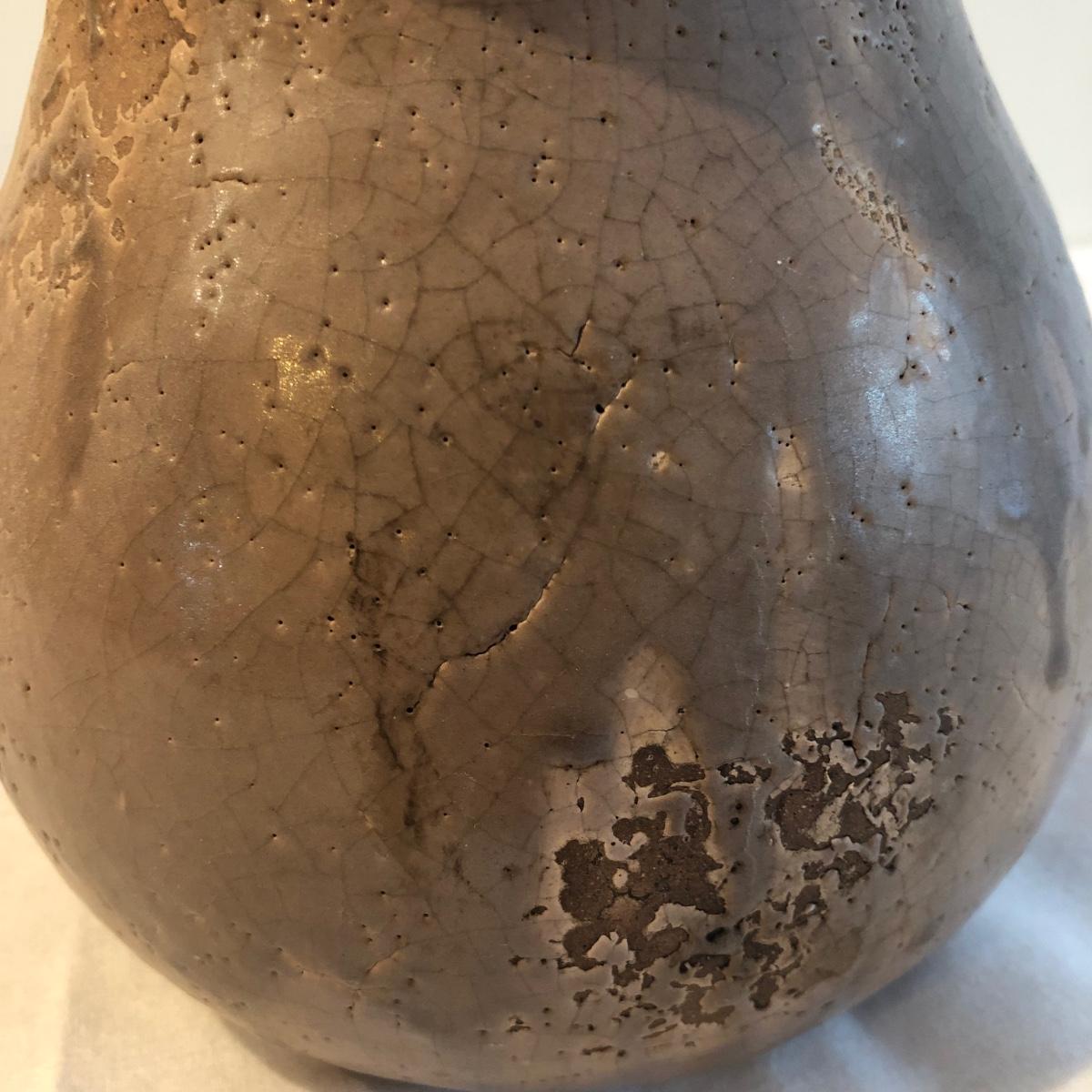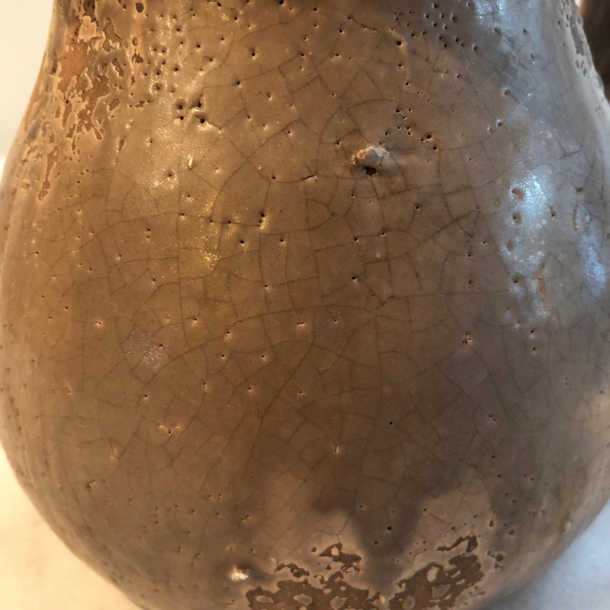 This brown pitcher is handcrafted in ceramic. The crackled glaze and missing glaze spots give the pitcher a rustic look. It measures 9” x 6.5” x 8”. Shipping available. Shipping art can be expensive. Please contact the local UPS store to get a shipping quote.