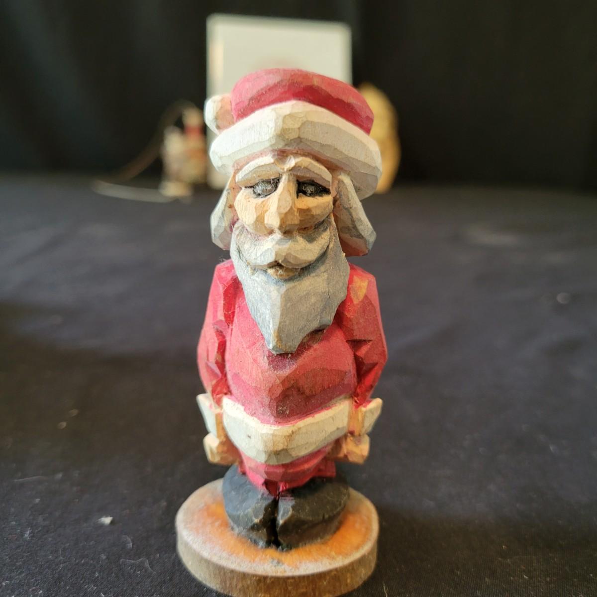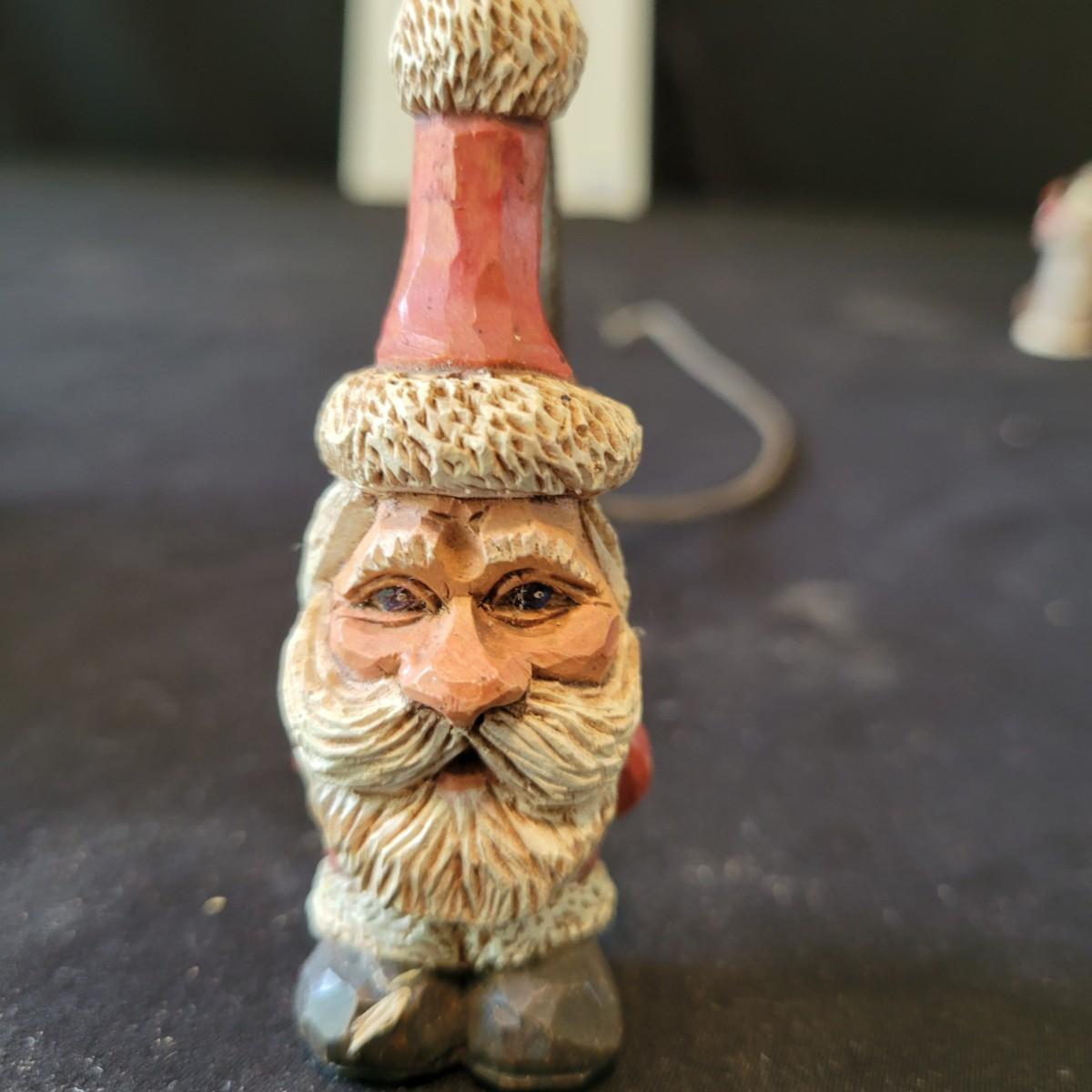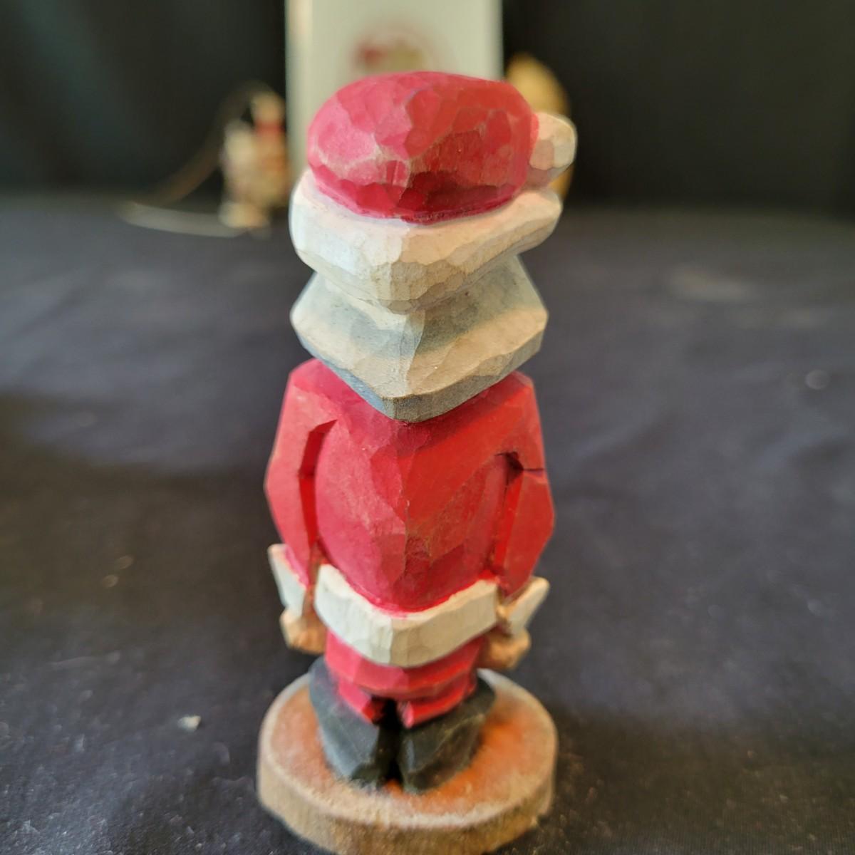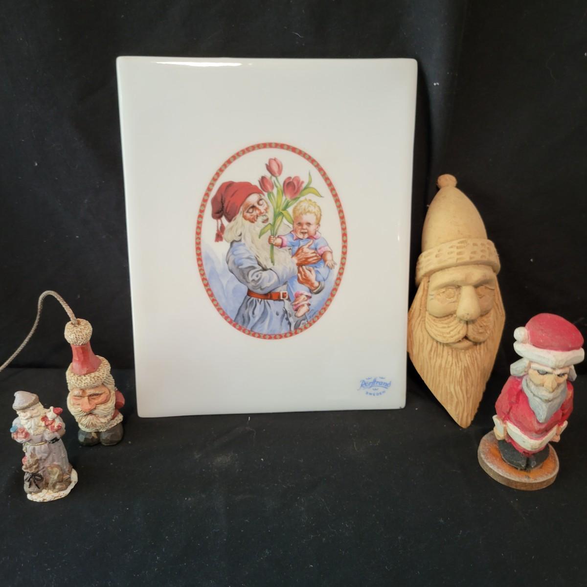 A Rörstrand Santa ceramic tile made in Sweden. Lot also includes 3 carved Santa figurines and 1 figurine, smallest grey colored Santa, made of cast lead and painted. Tile measures approximately 6.5" x 8" Shipping available