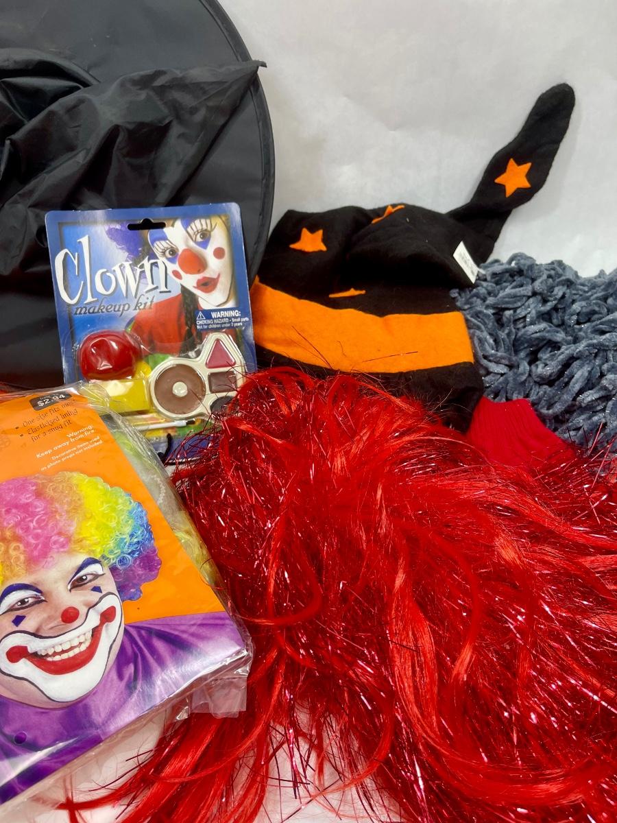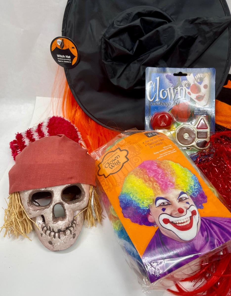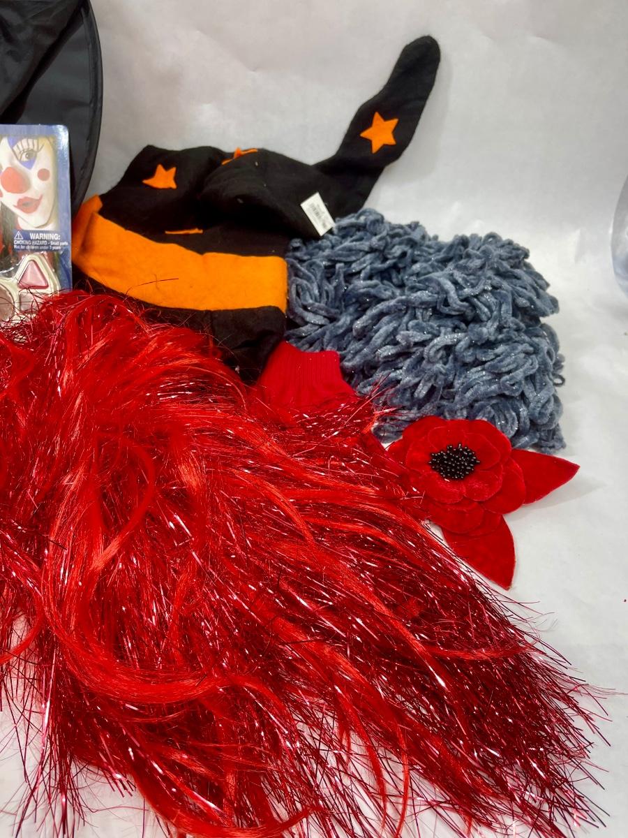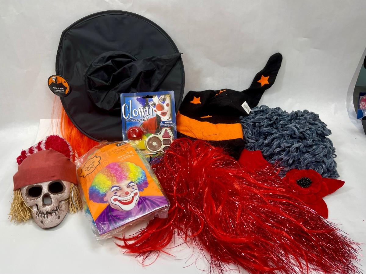 Halloween Costume Lot - With Hat with hair, Skull, black & orange velvet Witch Hat, scarf, wigs, etc