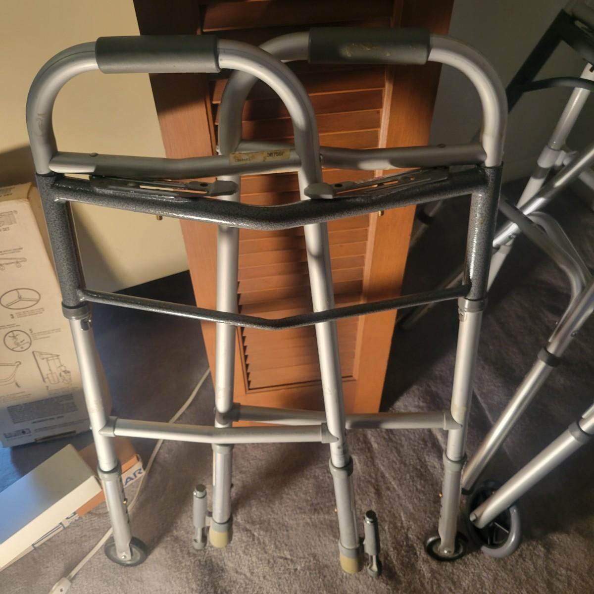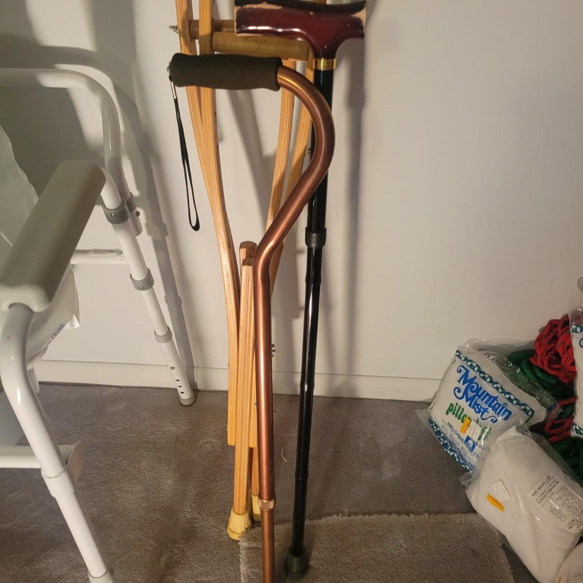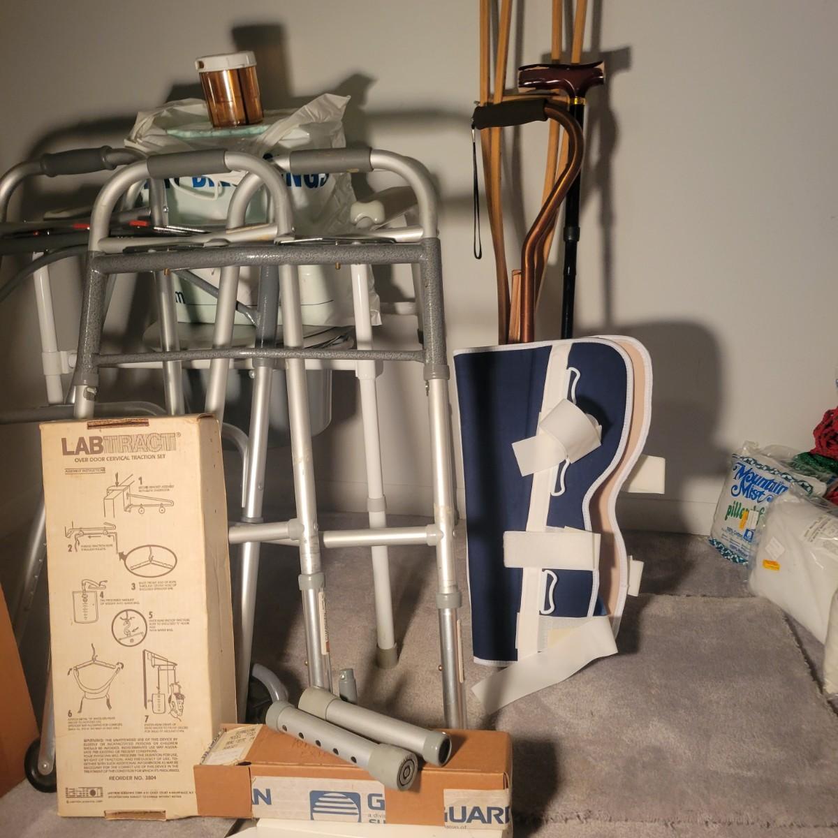 A variety of ambulatory equipment and a RS Medical tens unit all in good condition. Lot also includes two canes, a pair of wooden crutches, a leg immobilizer a portable toilet, two folding walkers and more. Portable toilet measures approximately 22" x 16" x 28". Seat height is adjustable. Local pickup only
