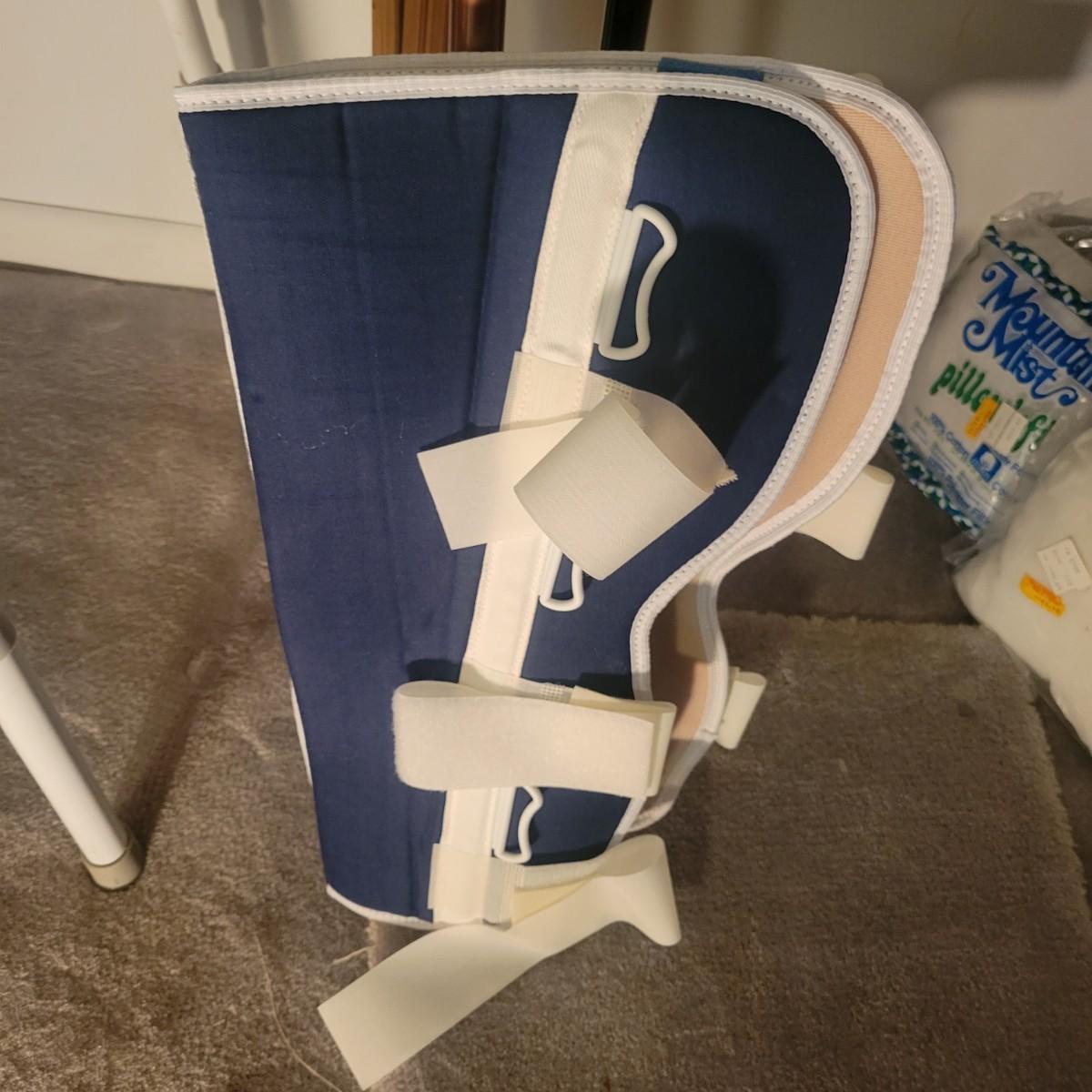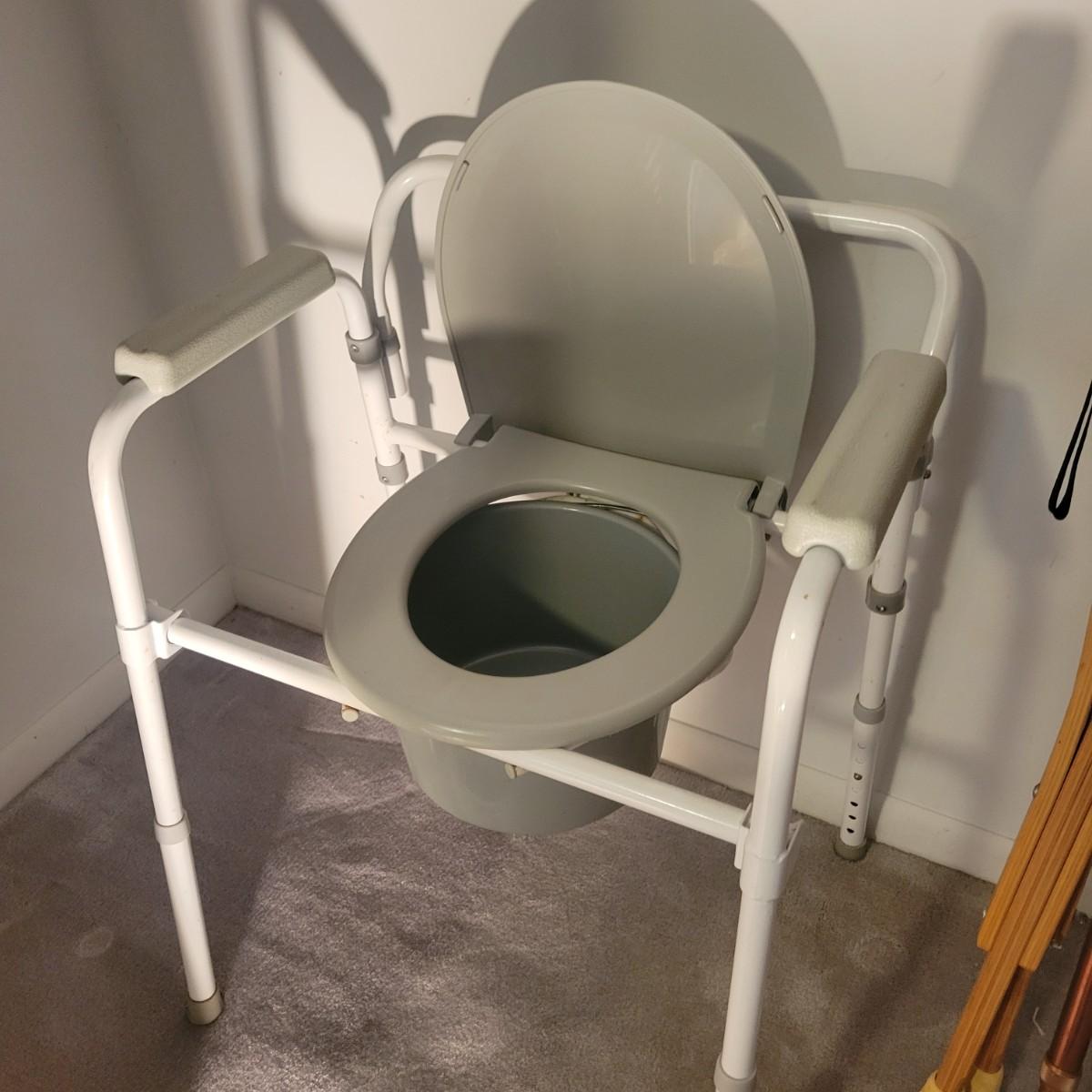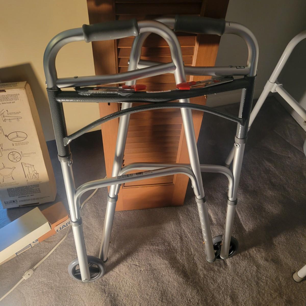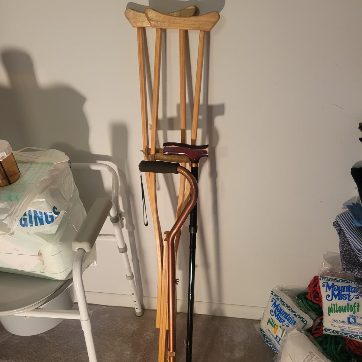A variety of ambulatory equipment and a RS Medical tens unit all in good condition. Lot also includes two canes, a pair of wooden crutches, a leg immobilizer a portable toilet, two folding walkers and more. Portable toilet measures approximately 22" x 16" x 28". Seat height is adjustable. Local pickup only
