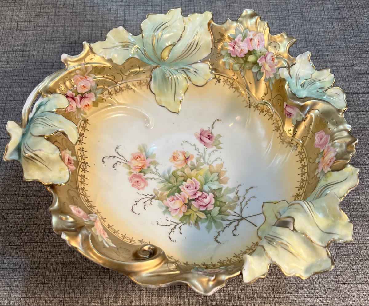 Beautiful RS Prussia serving bowl c 1900 floral design with gold accent. No chips or cracks. 11" diameter, 4" tall.