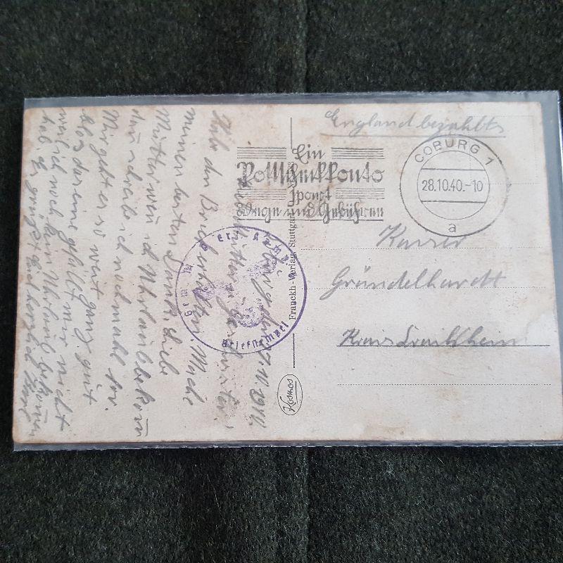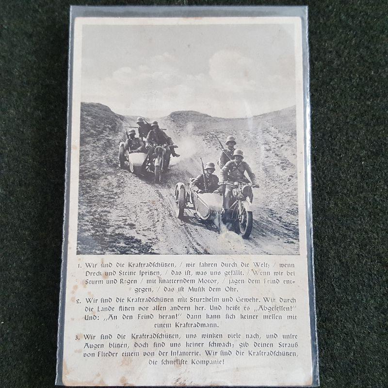 This aucction lot is for a very historical postcard showing a photograph of a WW2 Nazi Motorcycle Unit barreling down a small hill. The postcard hosts a very propagandish verse to foster the effort to peoples on the homefront. This postcard was sent from a soldier to his family (?) It is postmarked Coburg, Germany and dated October 28, 1940. In very good condition for its age.