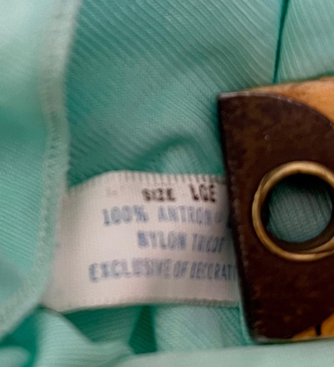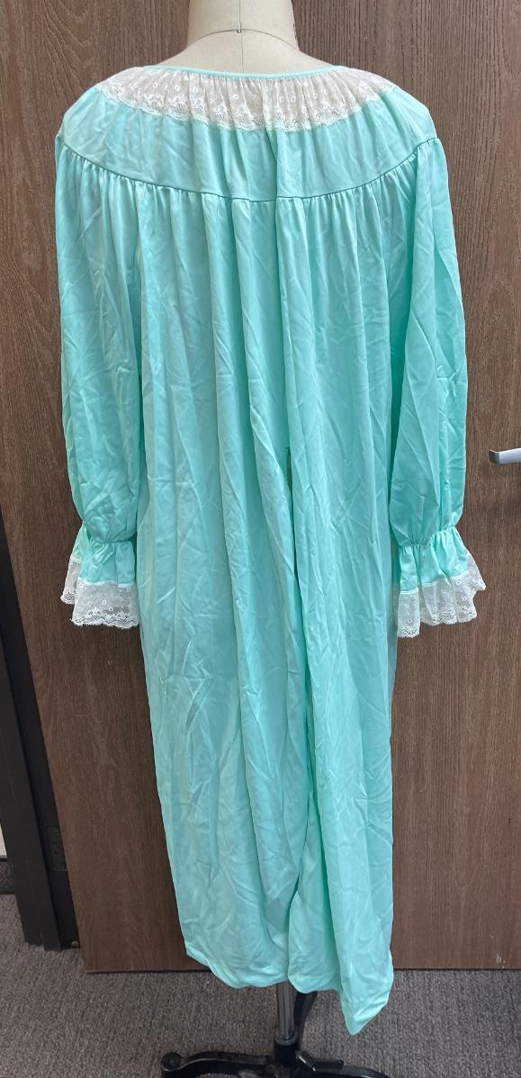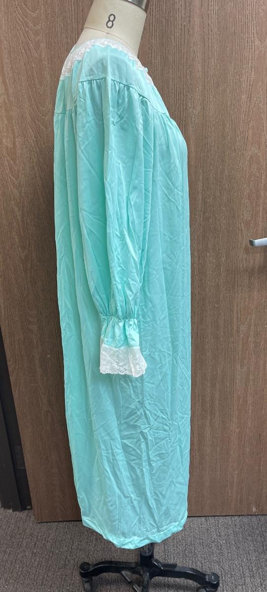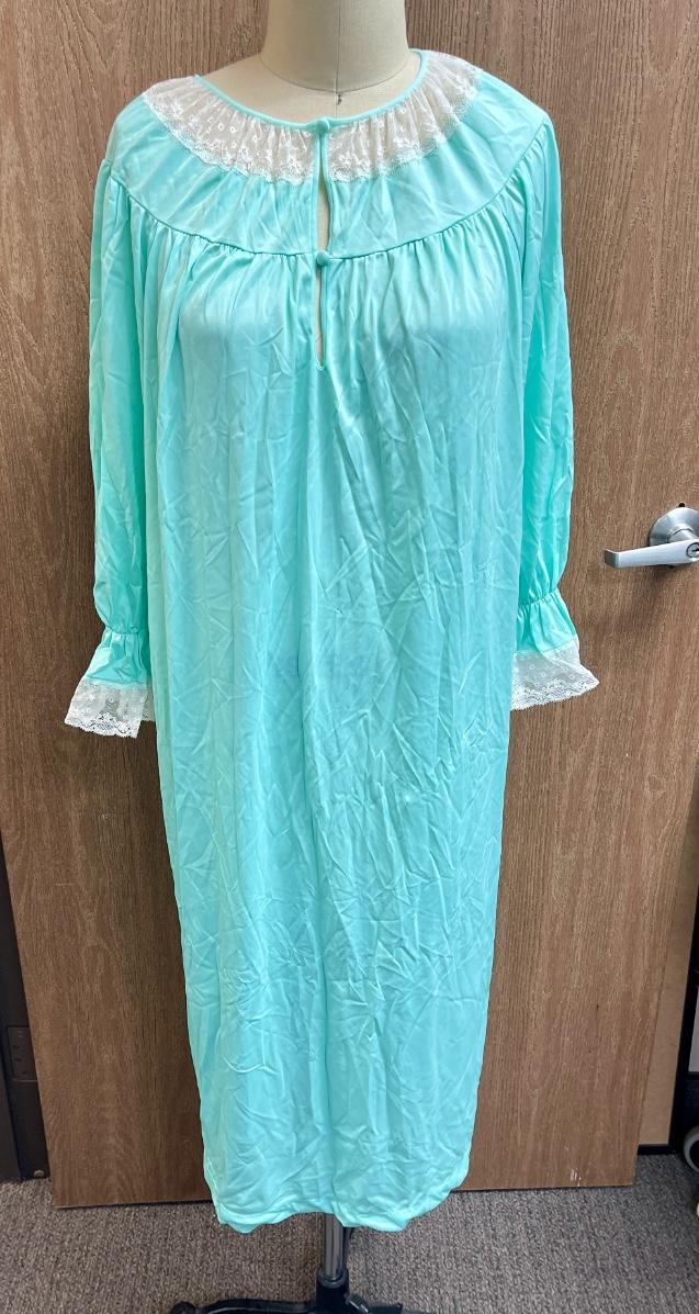 100% Tricot Nylon. Mint Green with white lace accents, single button at the neck. Good condition.