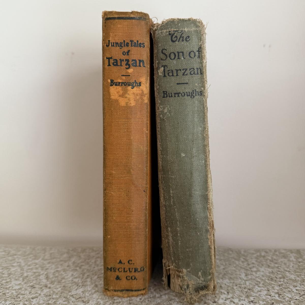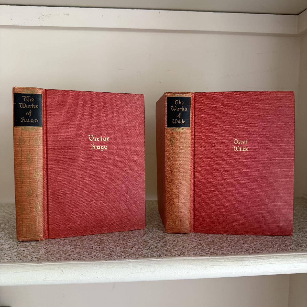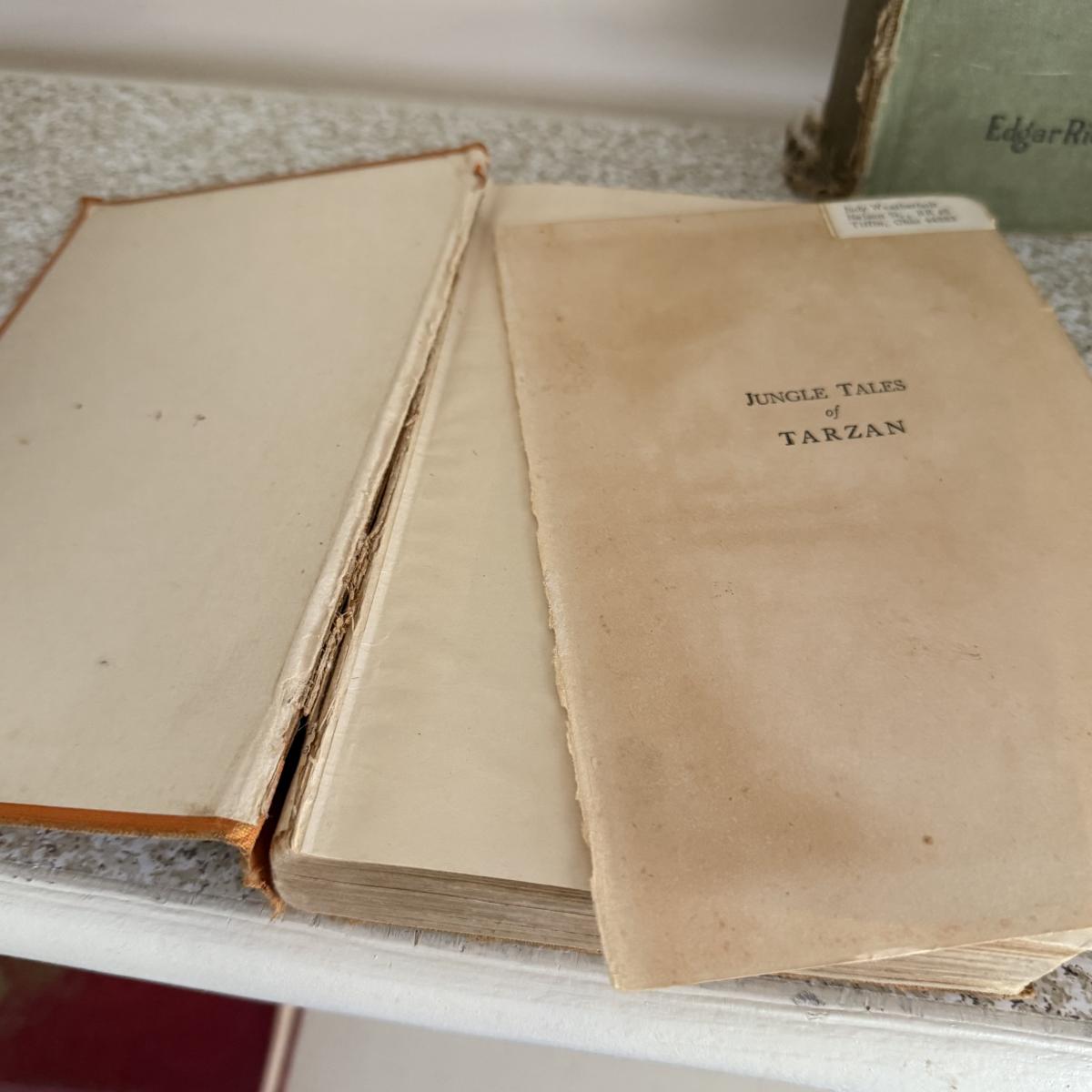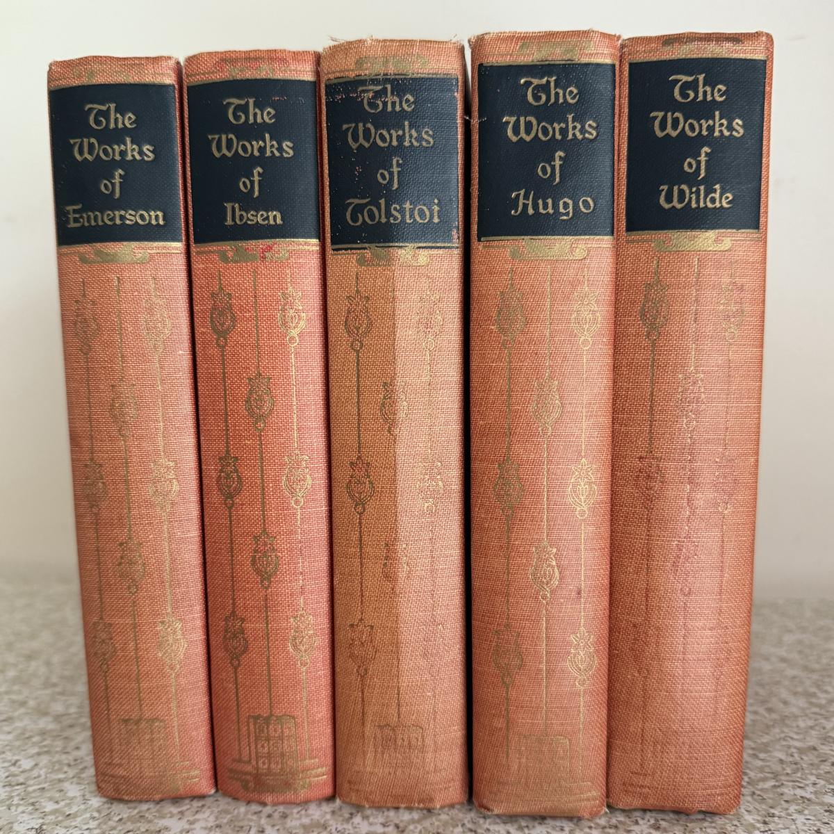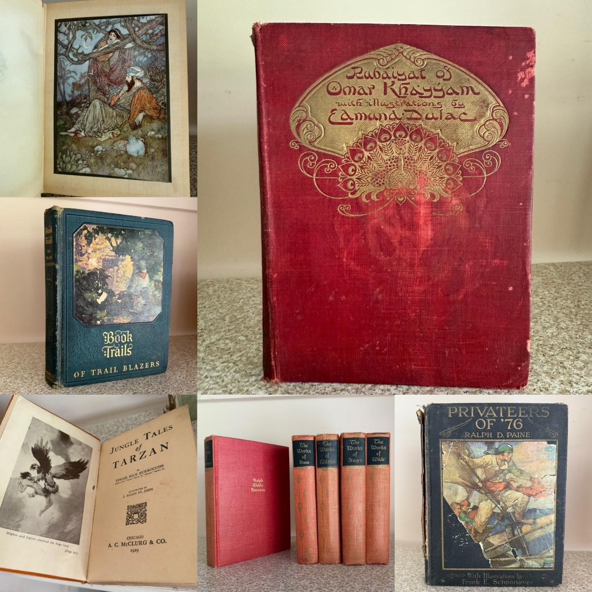 11 hardcover antique books. The collection includes the translation of the first and second editions of “Rubaiyat of Omar Khayyam”, a five book set of Black’s Readers Service Company books including The Works of Emerson, Ibsen, Tolstoi, Hugo, and Wilde, two “Tarzan” books, and more. Please see photos for inventory and details. The books do show some wear. Some have loose pages and damaged binding. “Book Trails” has crayon drawn inside.