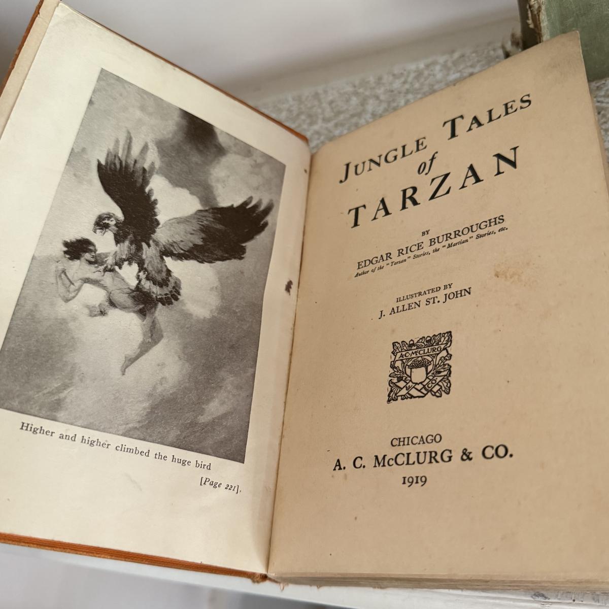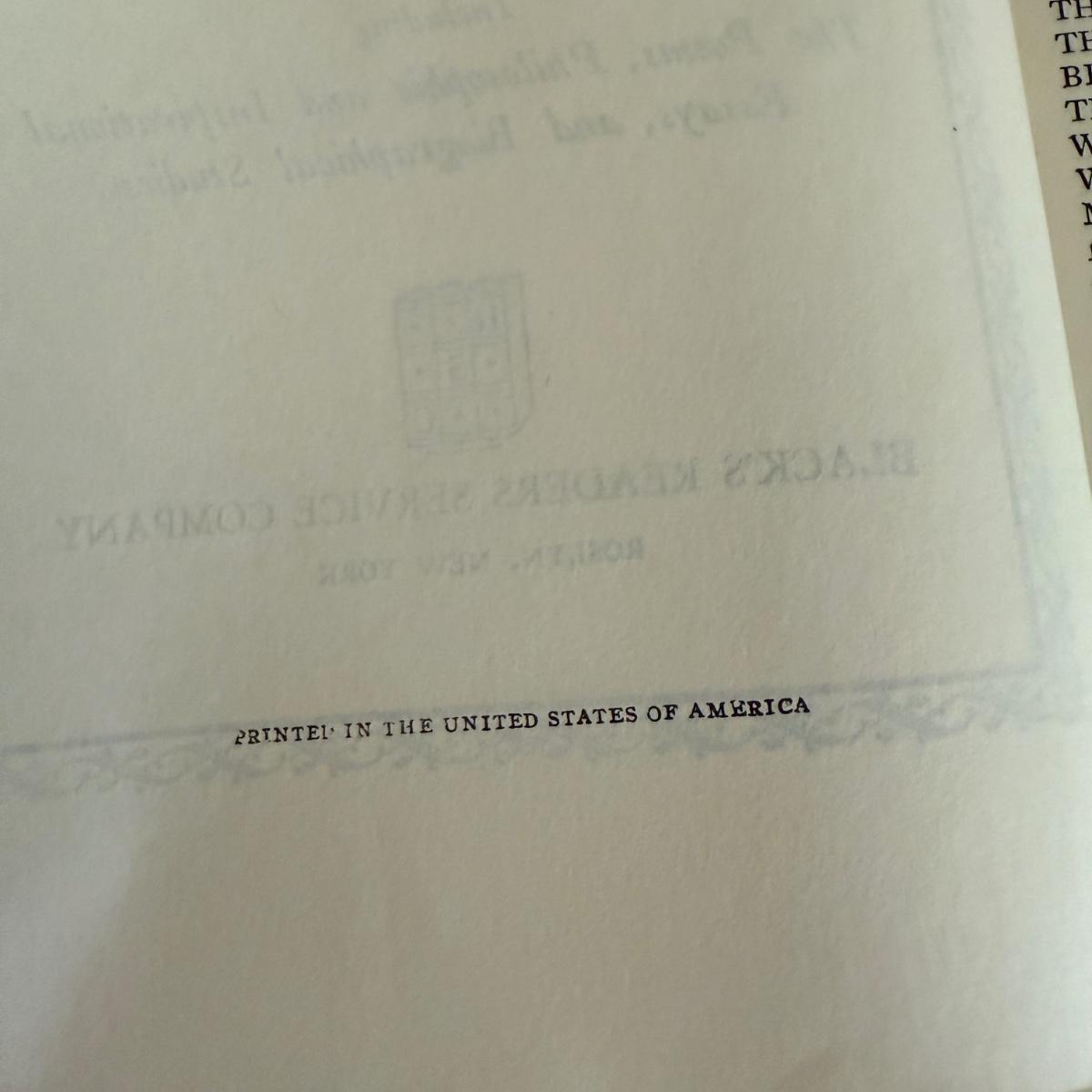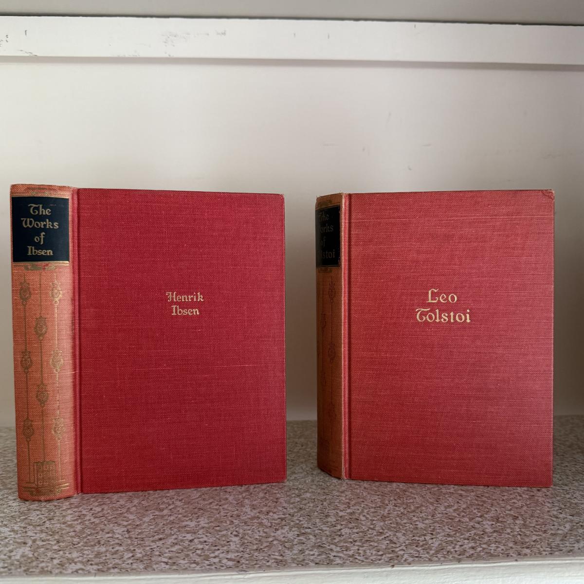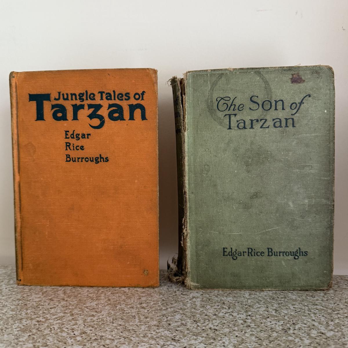 11 hardcover antique books. The collection includes the translation of the first and second editions of “Rubaiyat of Omar Khayyam”, a five book set of Black’s Readers Service Company books including The Works of Emerson, Ibsen, Tolstoi, Hugo, and Wilde, two “Tarzan” books, and more. Please see photos for inventory and details. The books do show some wear. Some have loose pages and damaged binding. “Book Trails” has crayon drawn inside.