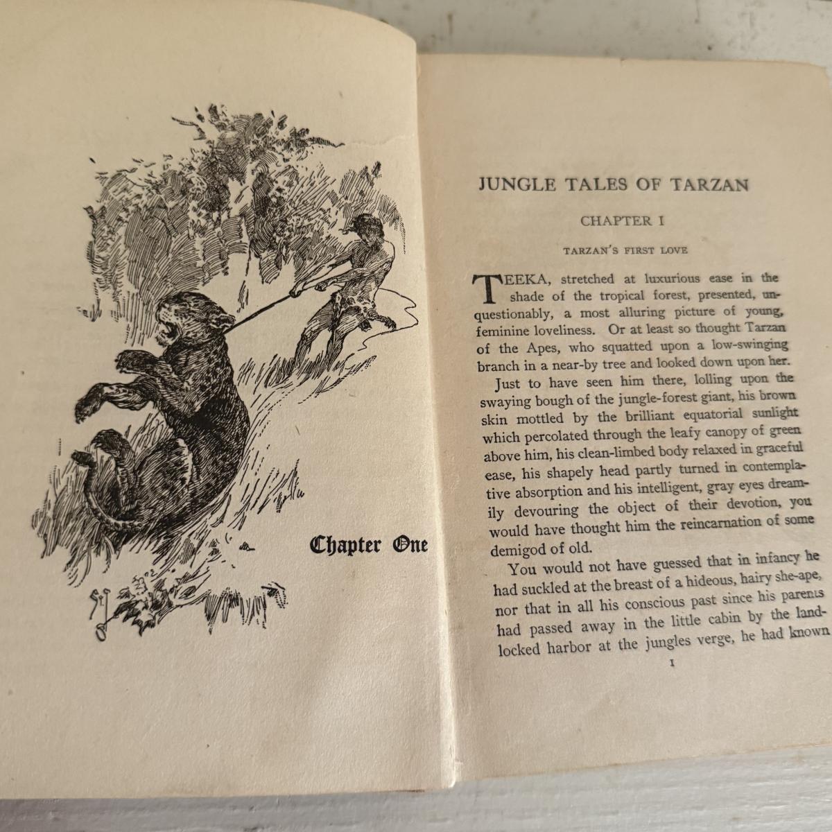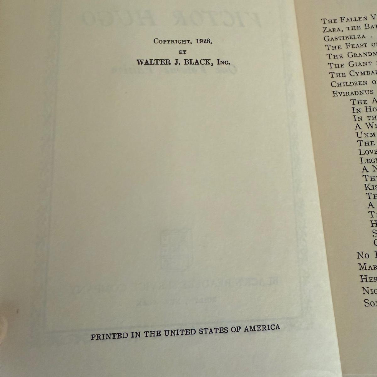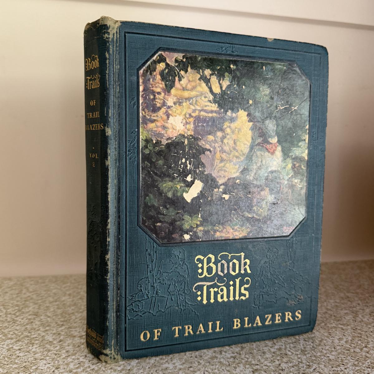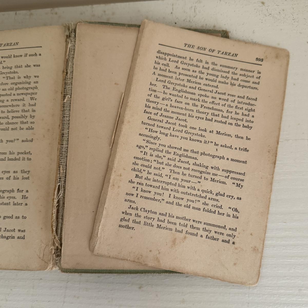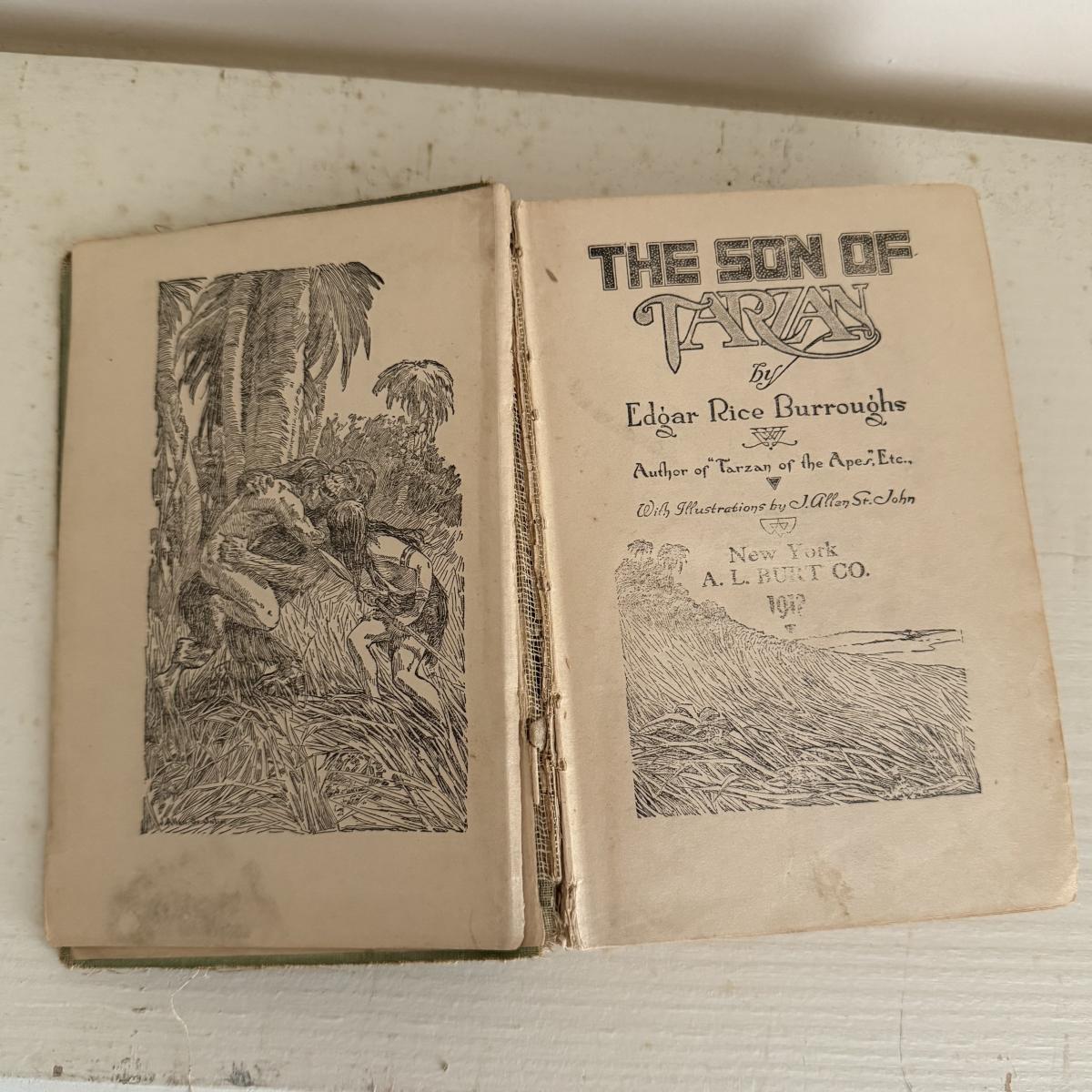 11 hardcover antique books. The collection includes the translation of the first and second editions of “Rubaiyat of Omar Khayyam”, a five book set of Black’s Readers Service Company books including The Works of Emerson, Ibsen, Tolstoi, Hugo, and Wilde, two “Tarzan” books, and more. Please see photos for inventory and details. The books do show some wear. Some have loose pages and damaged binding. “Book Trails” has crayon drawn inside.