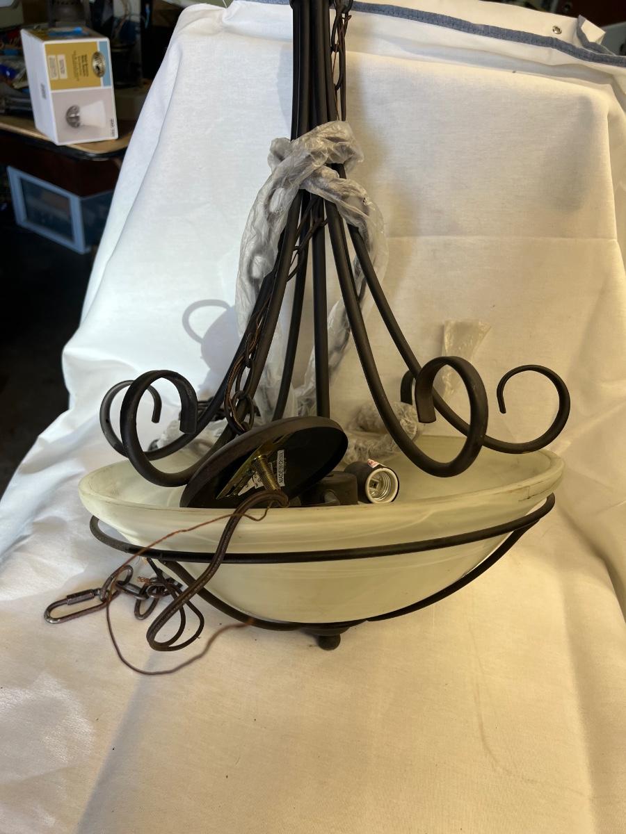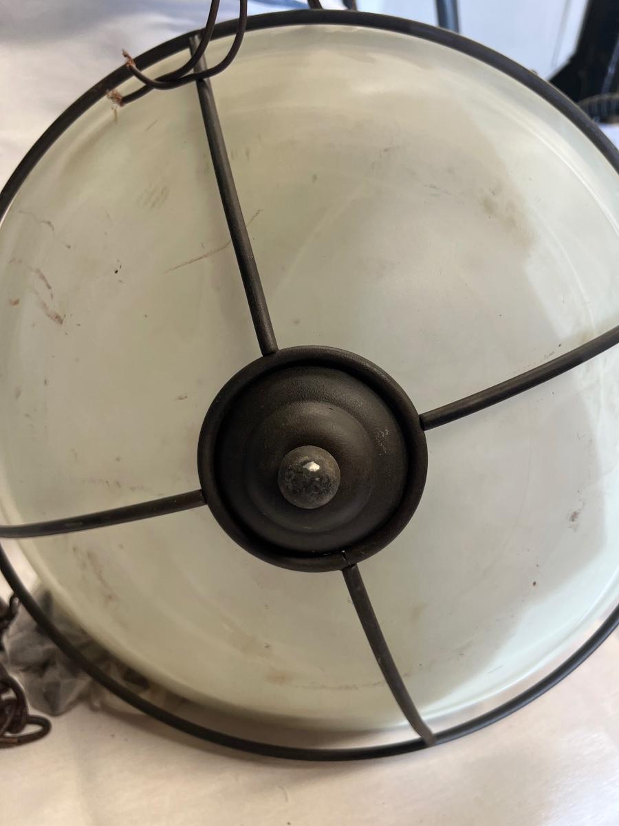 New pendant lamp with frosted glass shade and chain in oiled bronze color 16” diameter, holds two bulbs