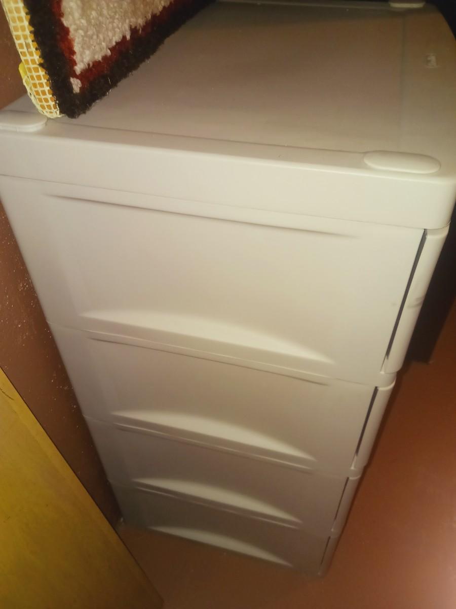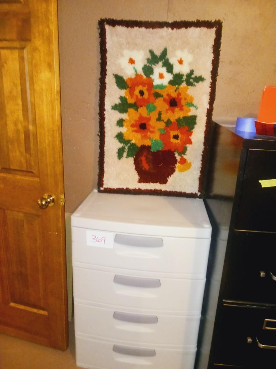 RUBBER MAID TYPE 4 DRAWER ORGANIZER, AREA RUG AND LATCH HOOK PICTURE