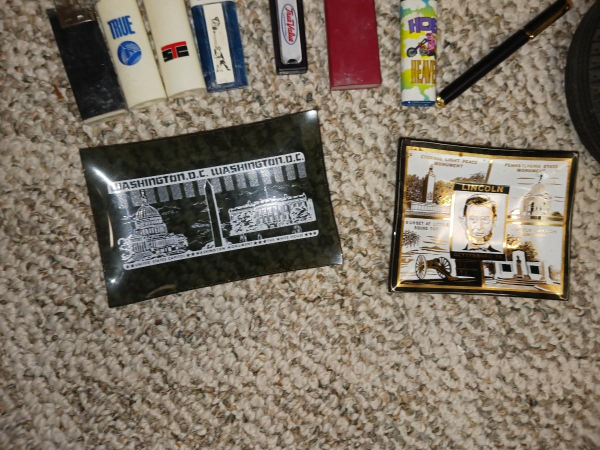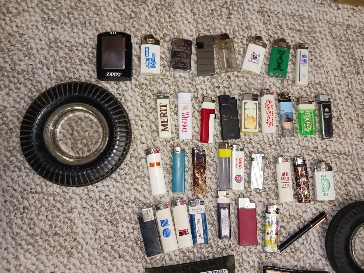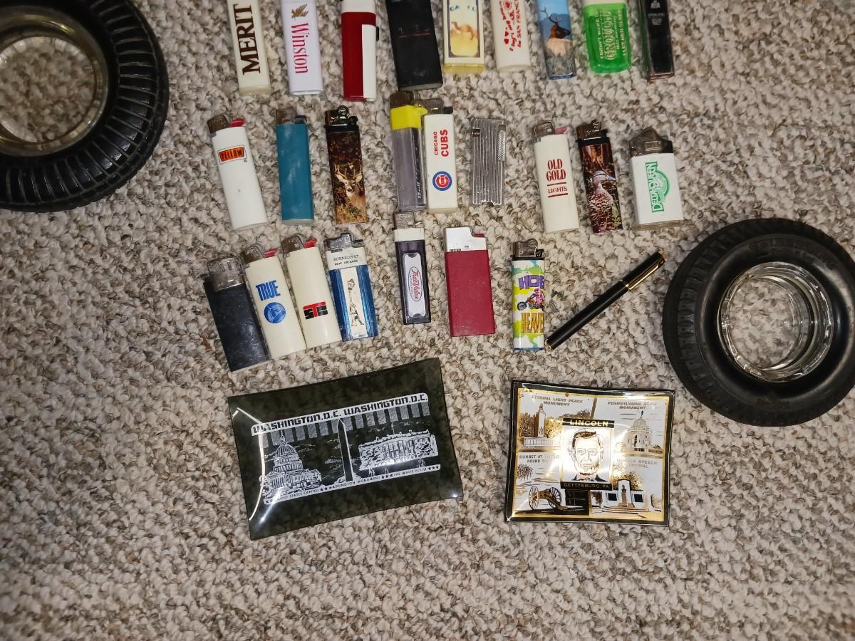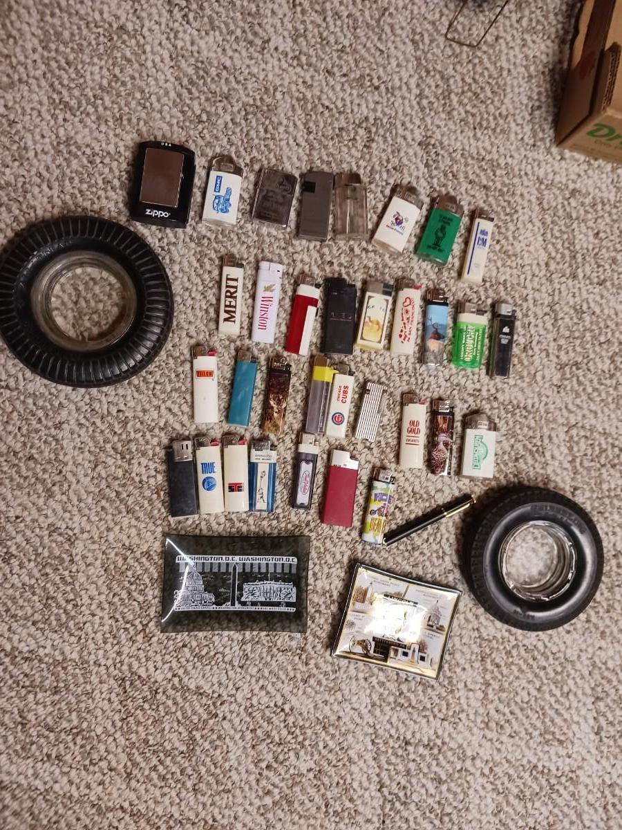 RUBBER TIRE AND GLASS ASHTRAYS PLUS MANY LIGHTERS