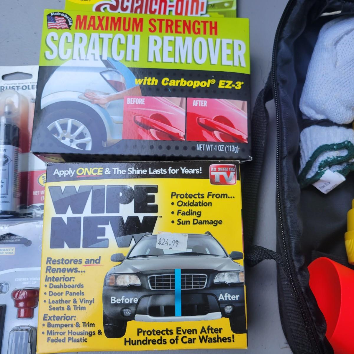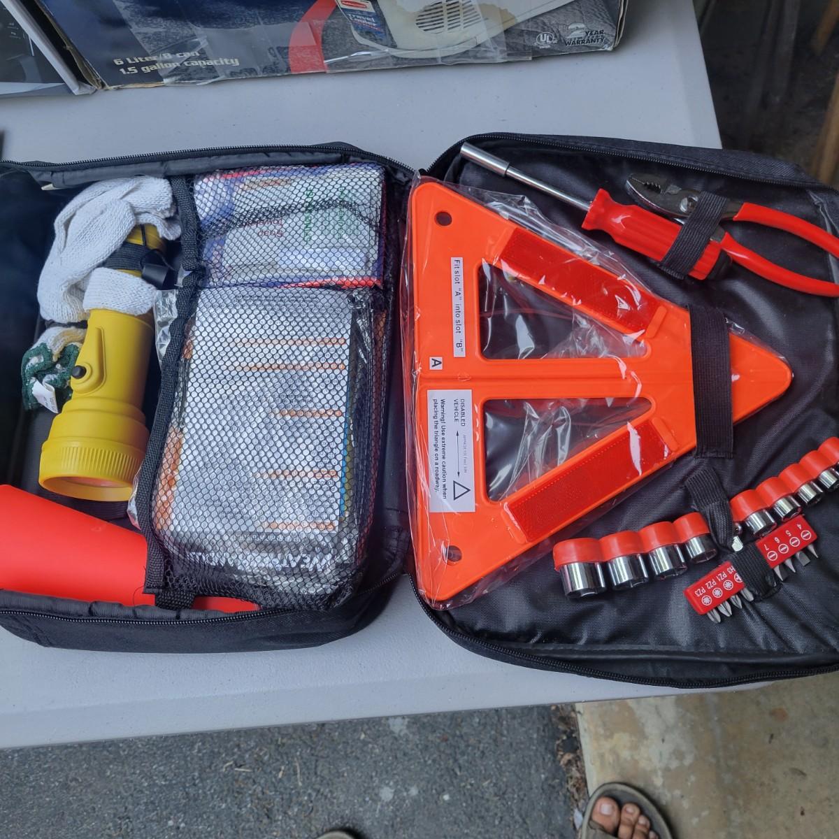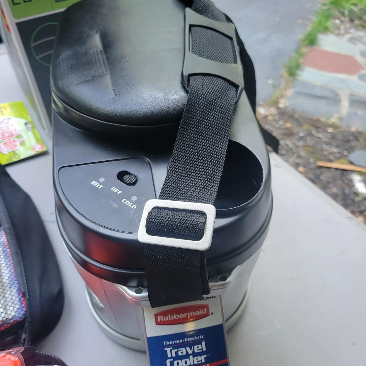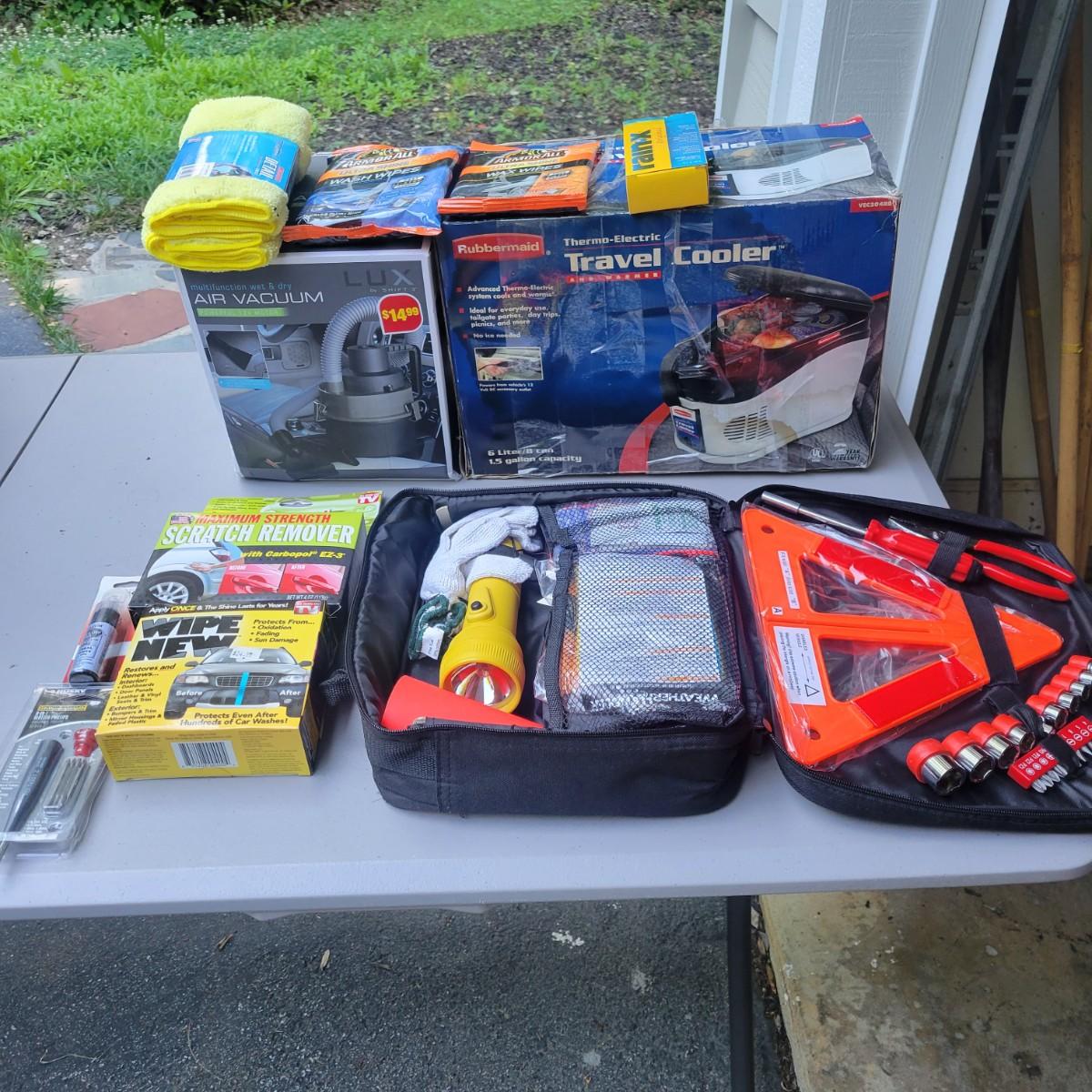 Rubbermaid 6 liter travel cooler and warmer. In original packaging but used. Did turn on when tested. Lux 12v multi function vacuum new and in original packaging. Weather Handler roadside emergency kit. New and unused. Lot also includes wipes, scratch remover and additional items. Local pickup only
