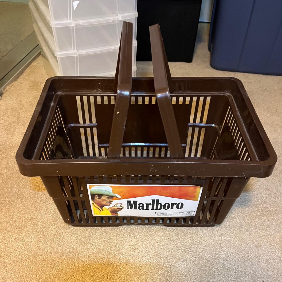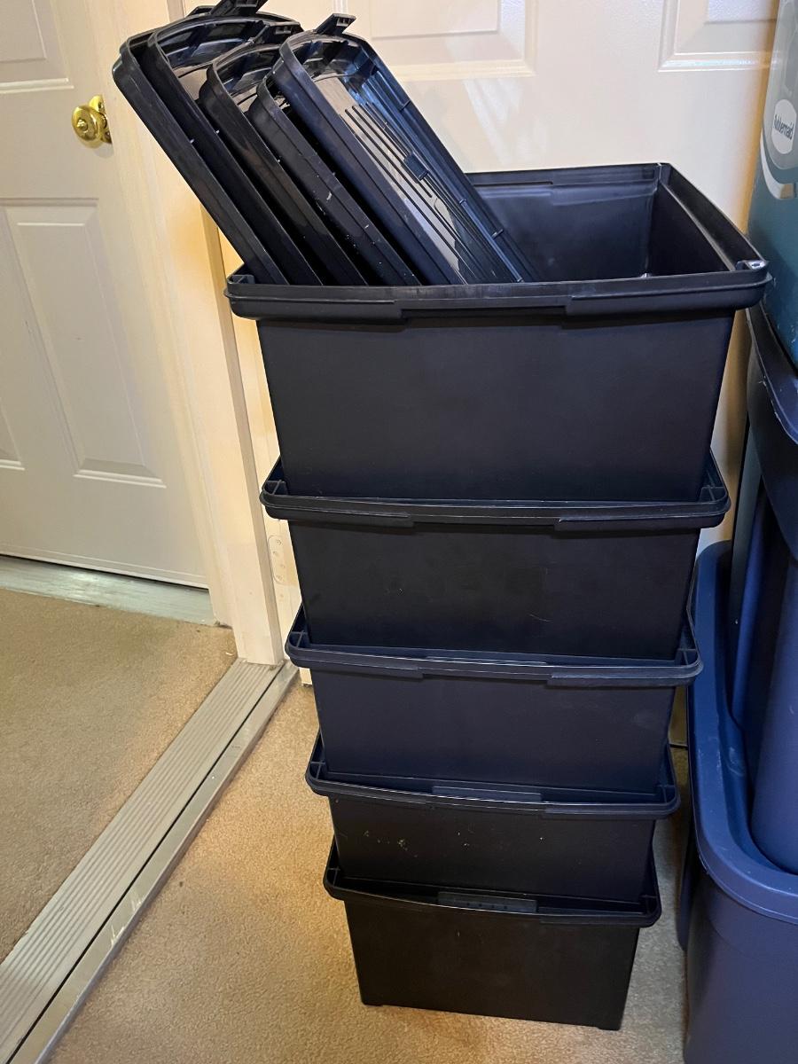 This group contains sixteen lidded bins and one small shopping basket. Largest bin is 15.5” x 24” x 16.5”H. Smallest is 9” x 18.5” x 7”H.