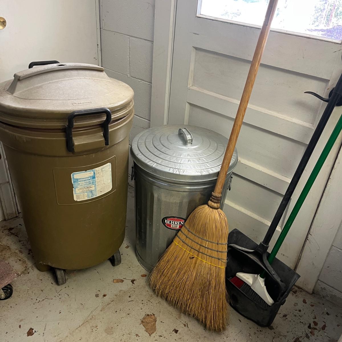 Lot includes a Rubbermaid 32 gallon plastic garbage can, Behrens galvanized garbage can, two brooms and a dustpan with long handle.