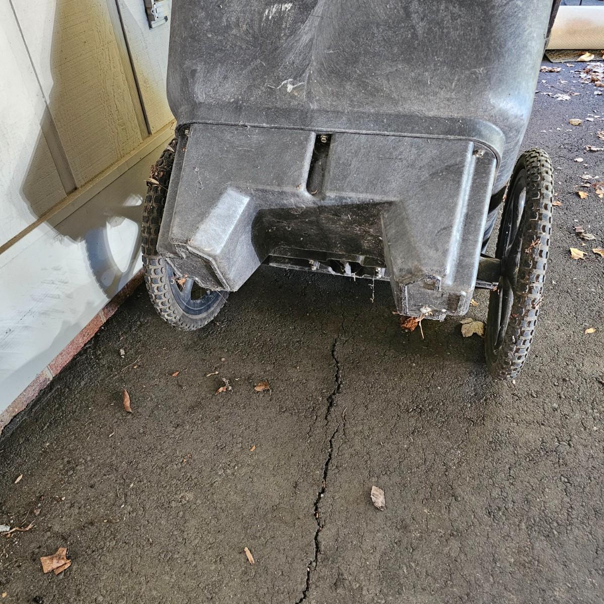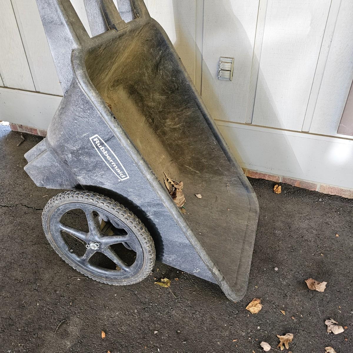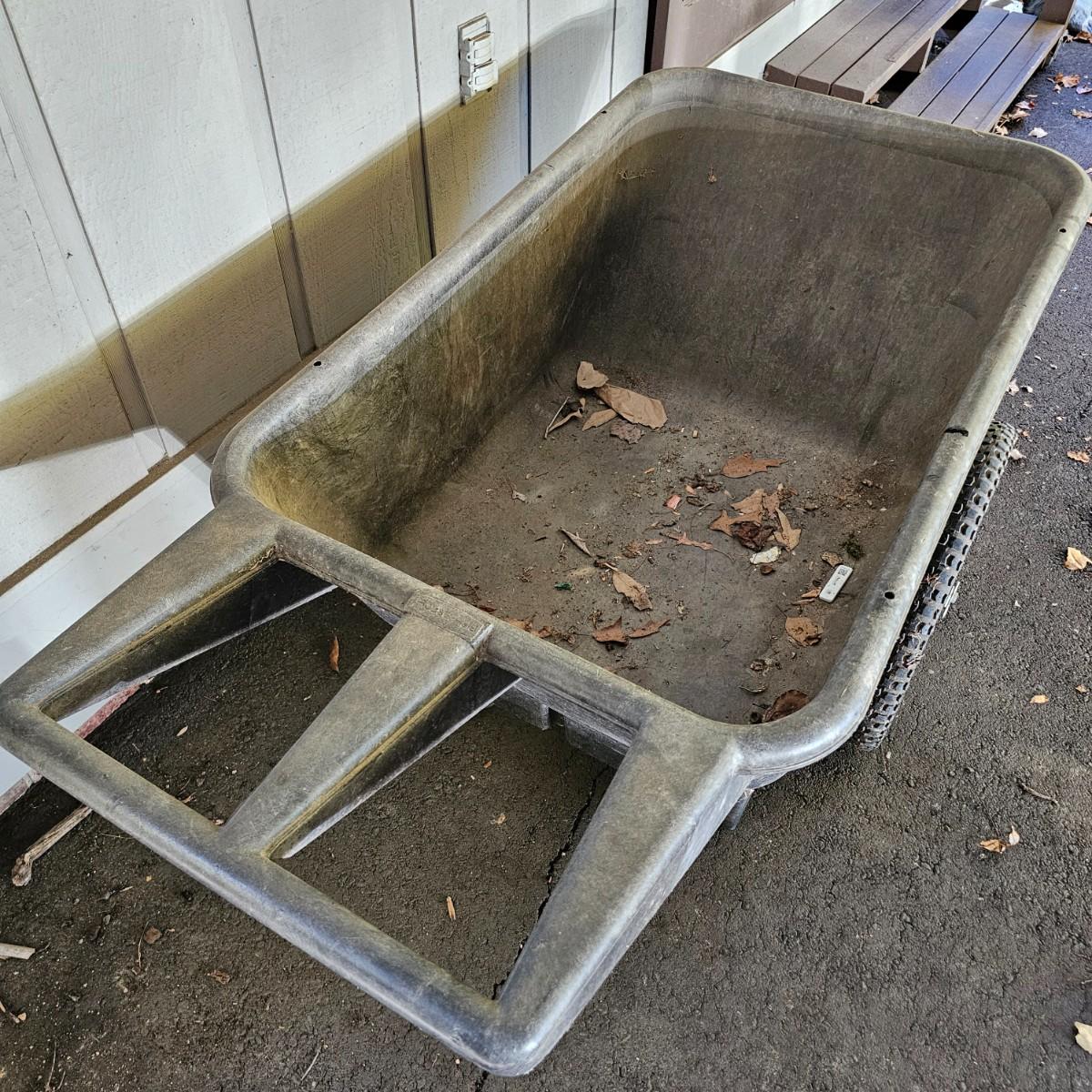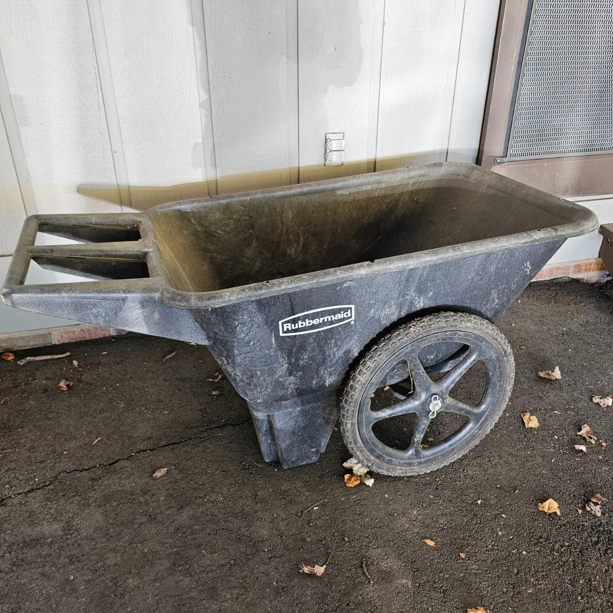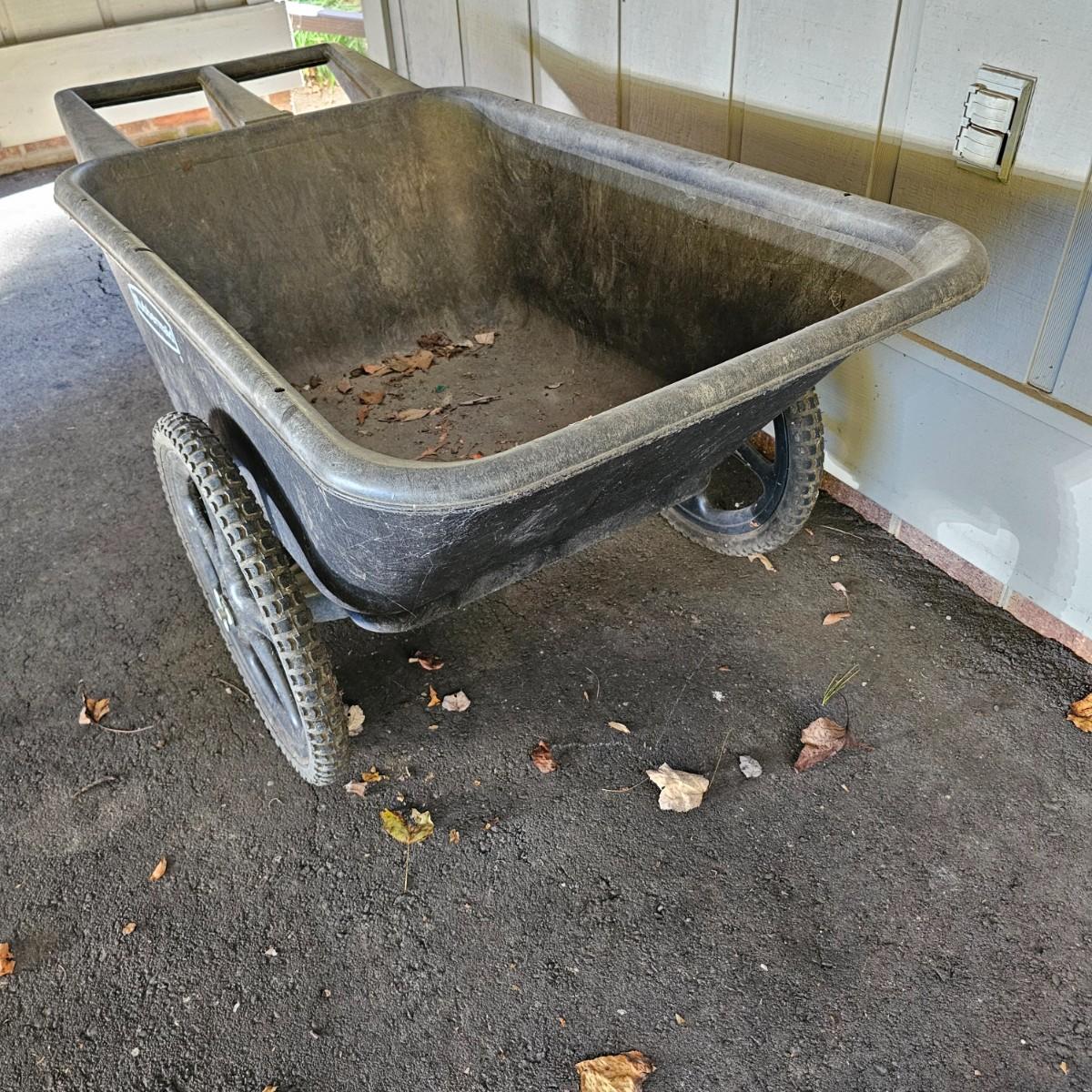 Two wheeled hard plastic garden cart with handles and dump capability. Pneumatic wheels with rubber tires. Cart measures 57" x 30" x 27"H. Tires currently need air. See photos for details.