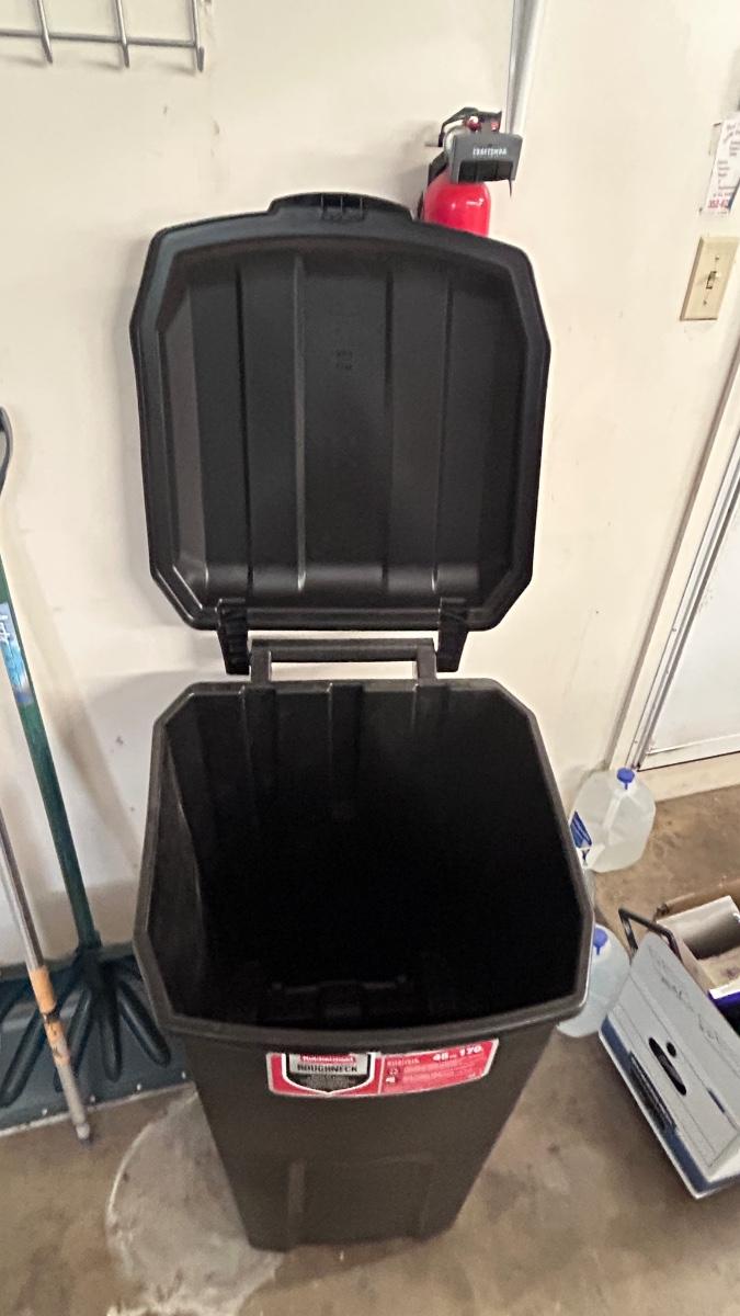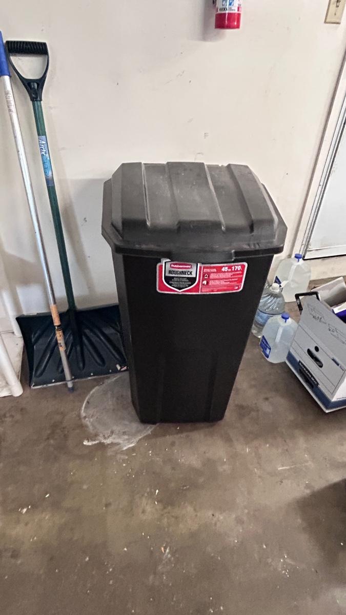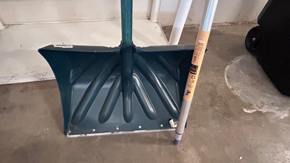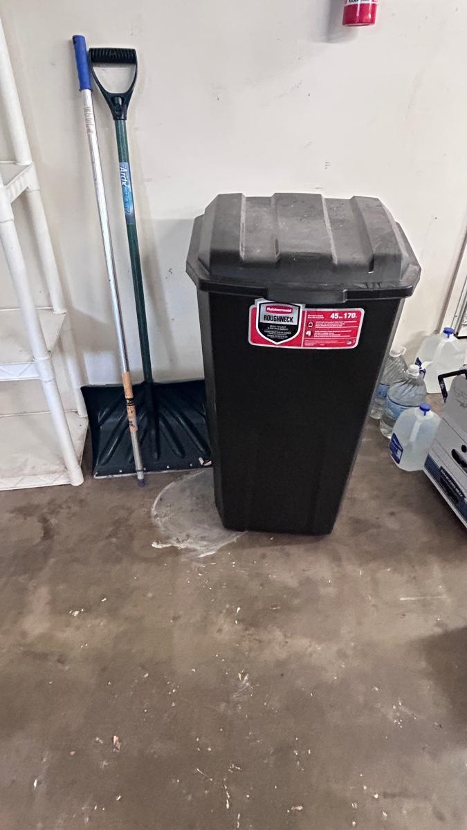 RUBBERMAID ROUGHNECK 42 GALLON TRASH CAN ON WHEELS, ARCTIC BLAST SNOW SHOVEL AND BLUE HAWK MULTI USE TELESCOPING POLE