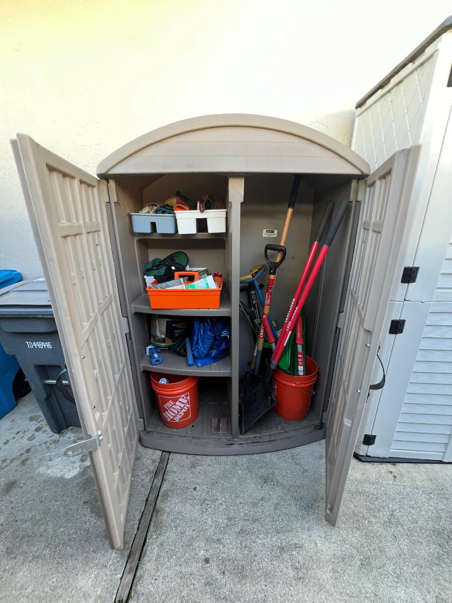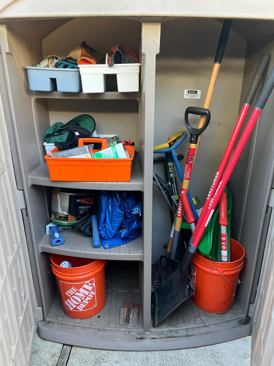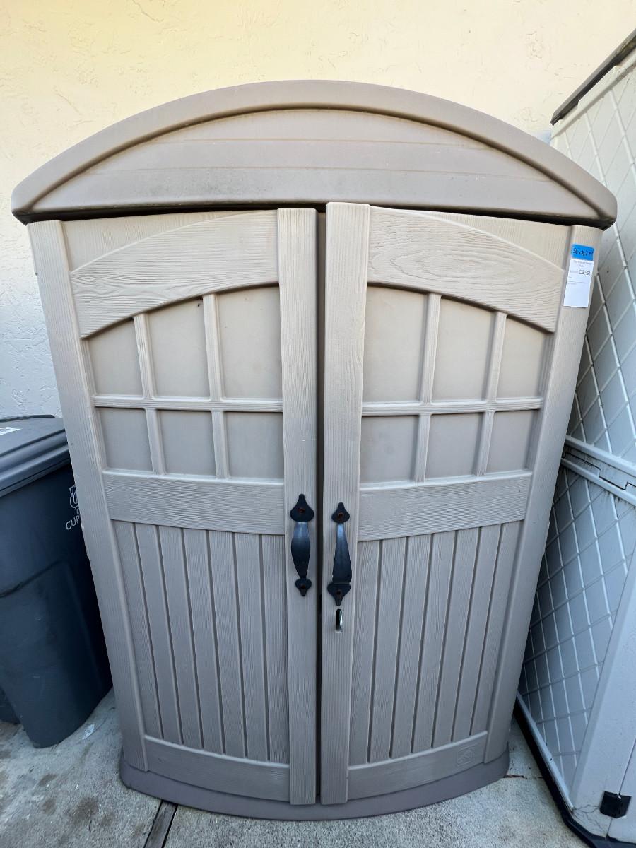 50X25X71 Contents NOT included. Shelving and storage area for garden toold.