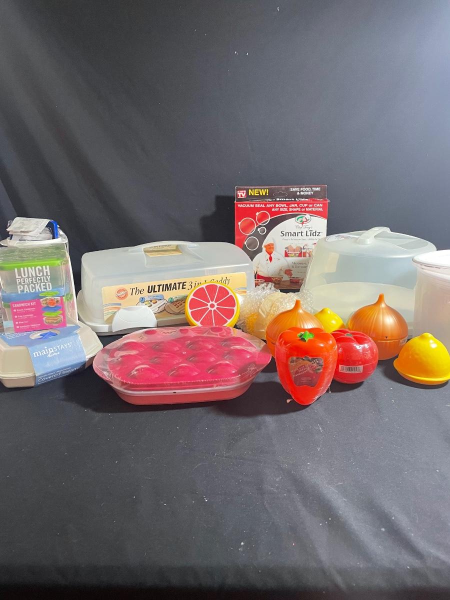 Lots of food storage options in this lot that are brand new items (Lidz and a few of the vegetable/fruit containers might have been used). Note that the larger of the Smart Lidz is a little dirty.