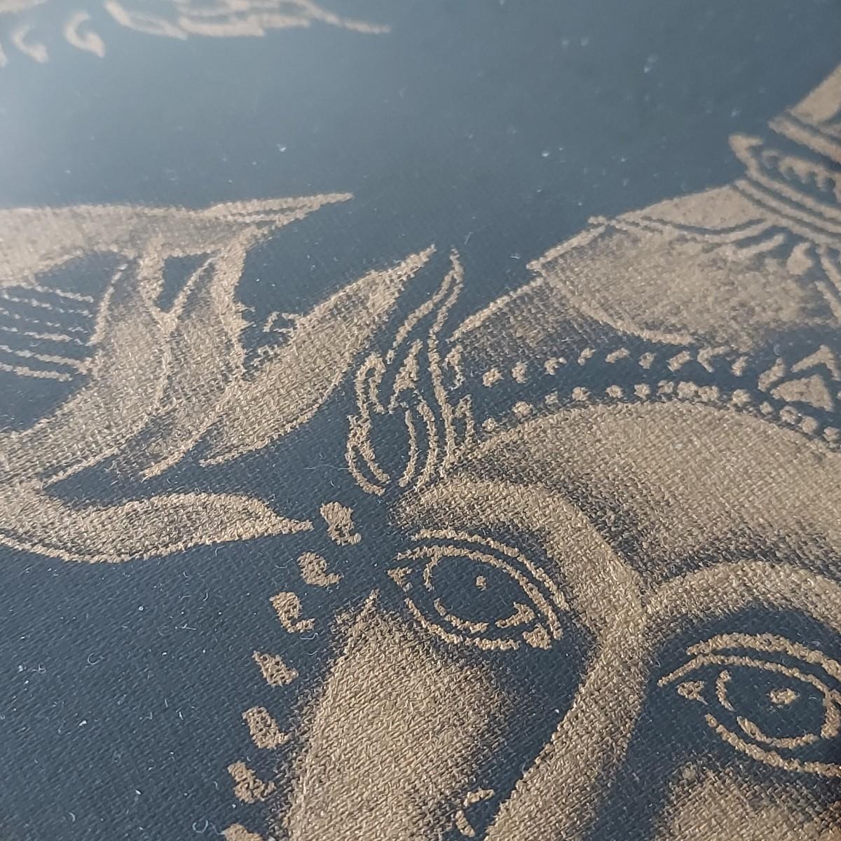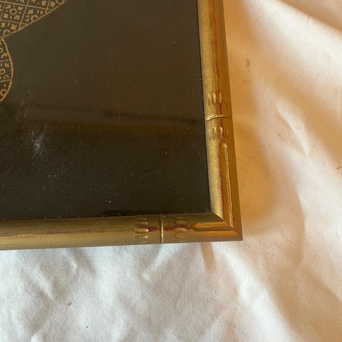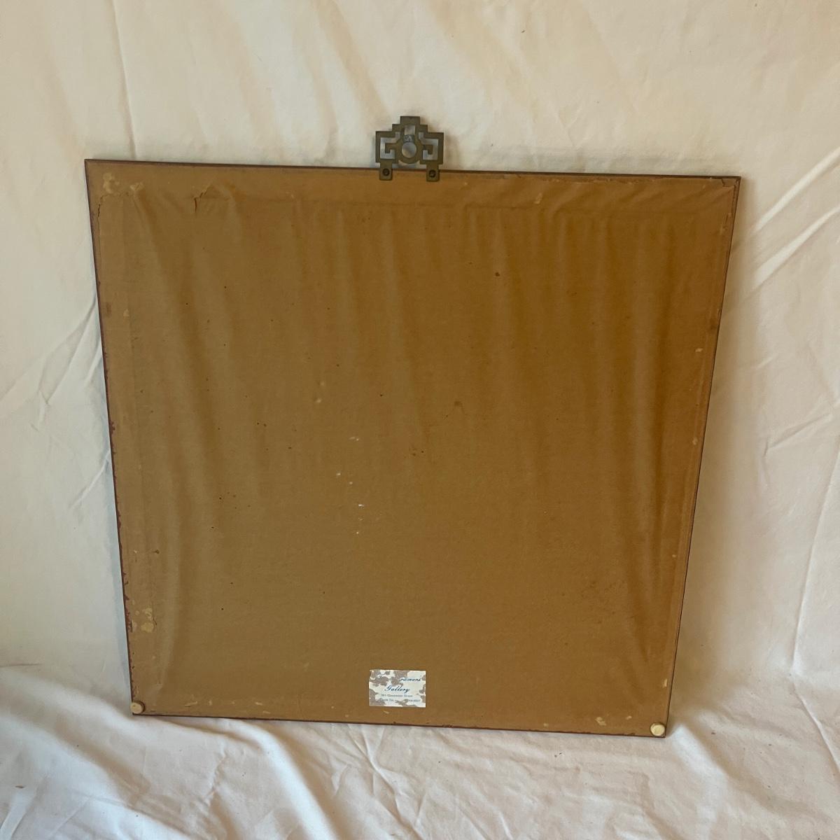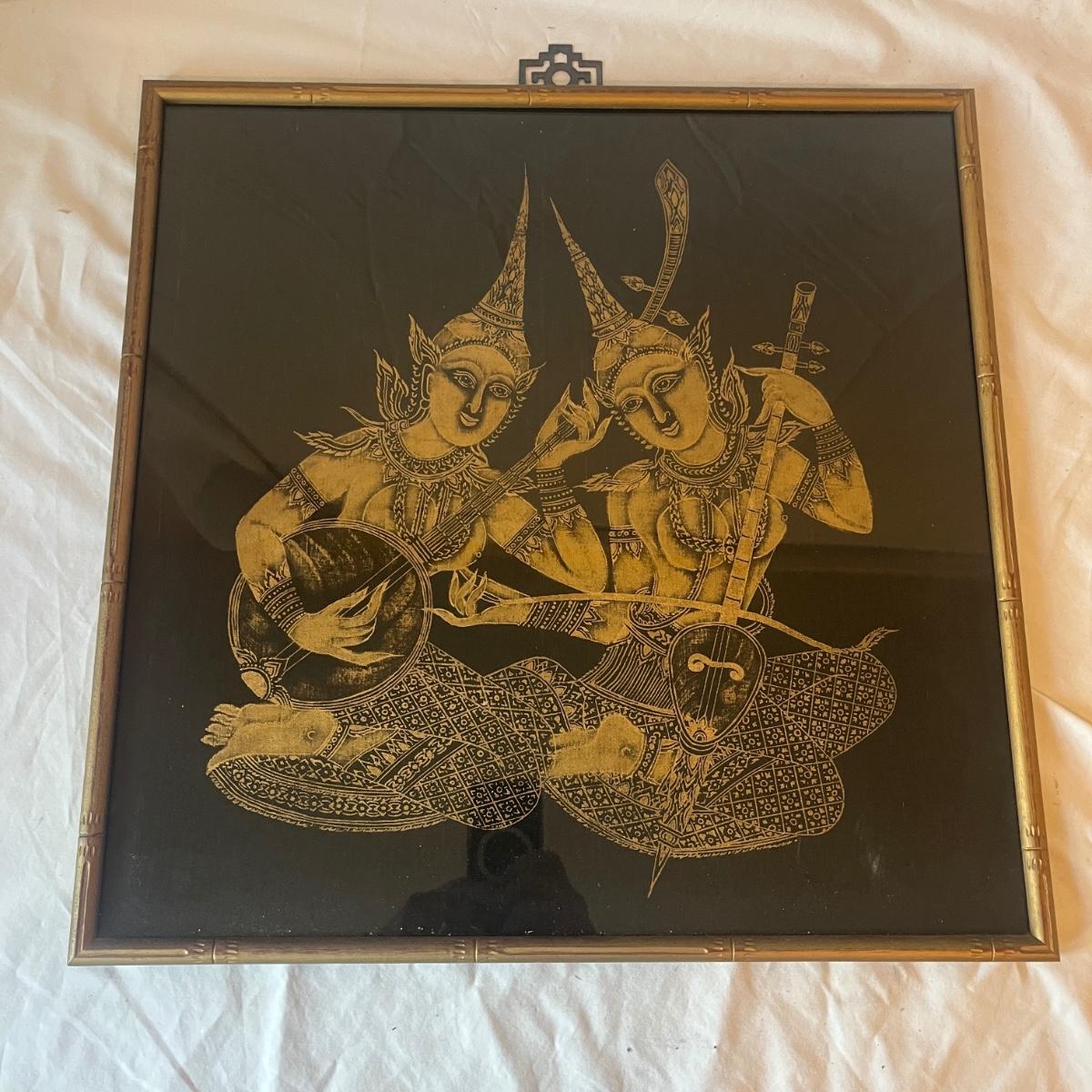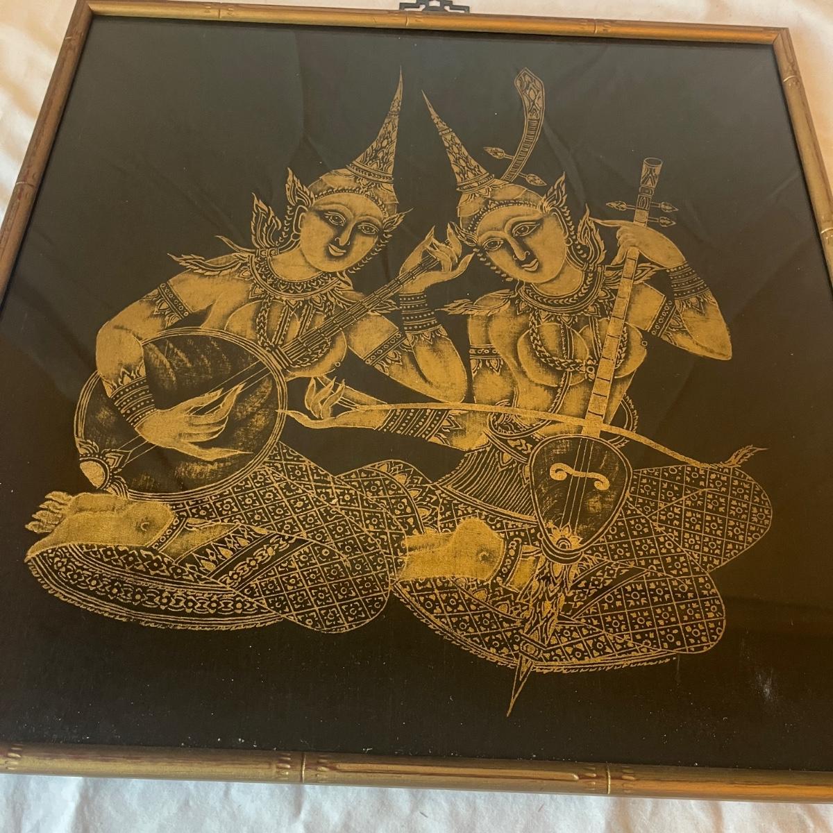 Lot includes what appears to be a silk screen print on fabric in a Southeast Asian style. The wooden frame is bamboo shaped and the piece is under glass. Frame measures 19” x 19”H.