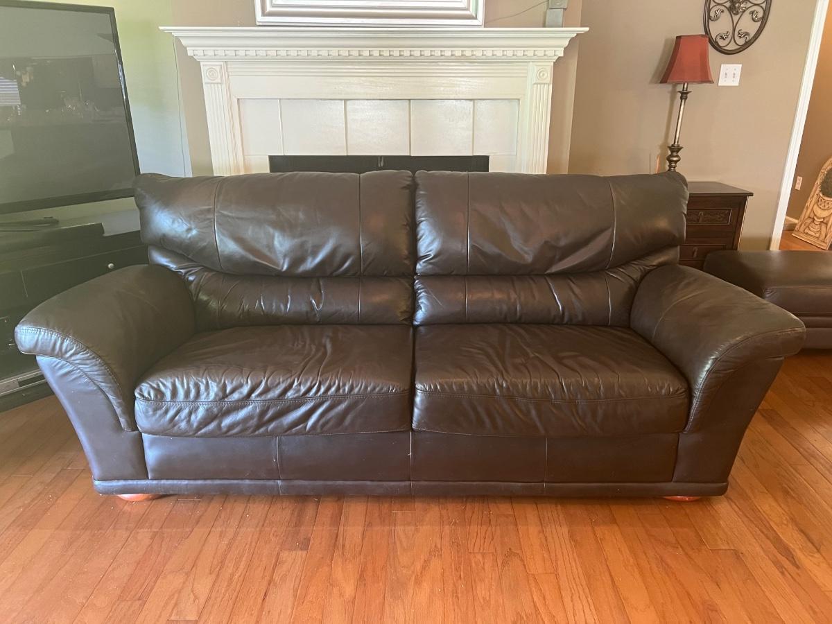 RUBELLI Italian Leather two seater Sofa. Color is Mocha. Should be wiped down with leather cleaner. Measures 37 inches tall, 88 inches long and 34 inches deep. Floor to seat measures 18 inches tall. *** We have two identical couches in this auction***