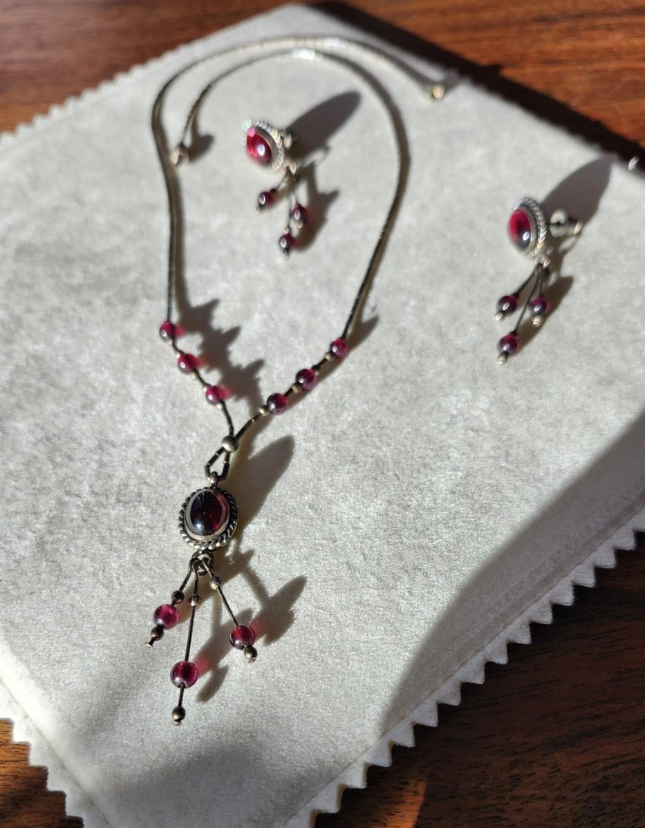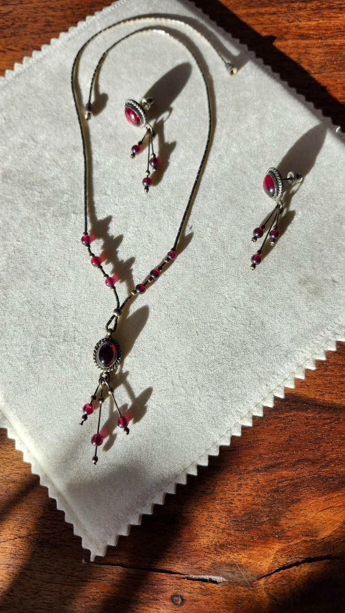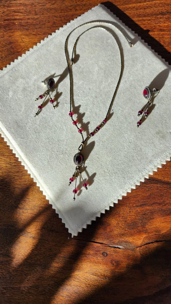 Petite Necklace of Liquid Silver and turmalite stones with matching earrings. Marked O.T. (copyright) 925.