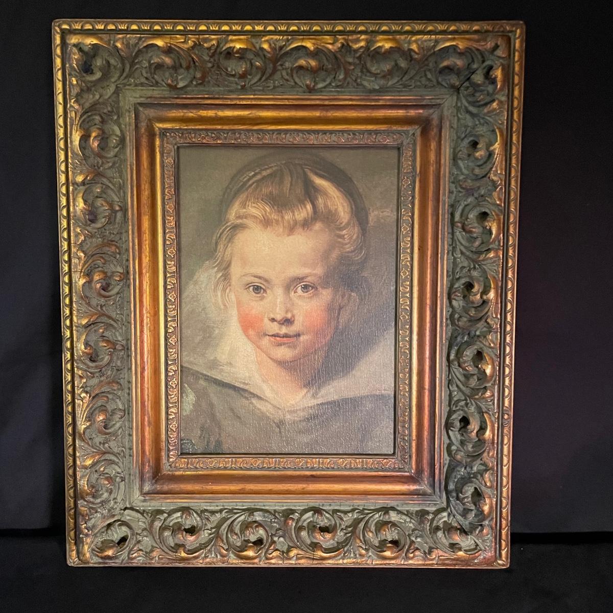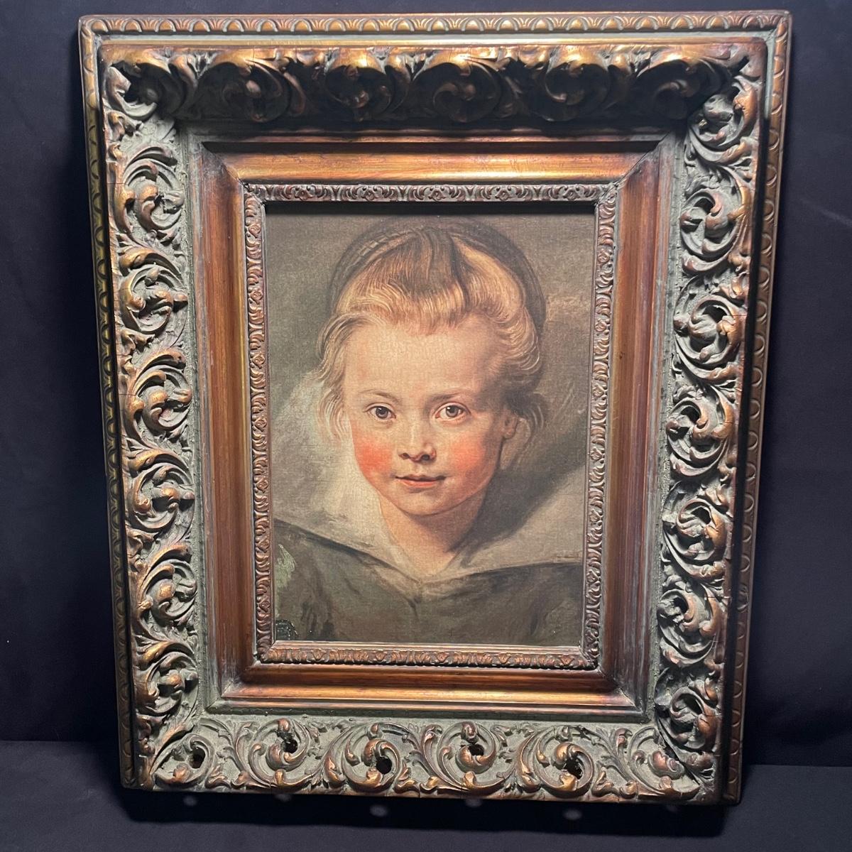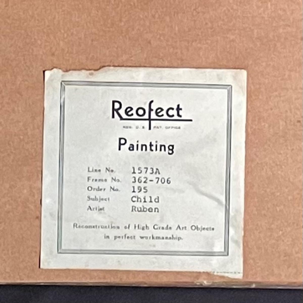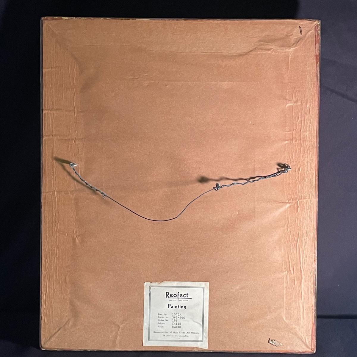 This painting is titled “˜Child’ by Ruben. It has no signature. The back of the frame states that this is a reconstruction. It is housed in an ornate quality wood frame ready to hang, that measures 18” x 15”.