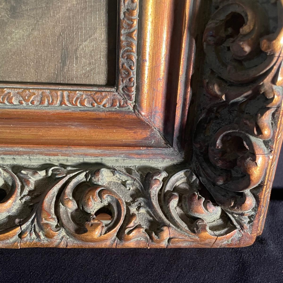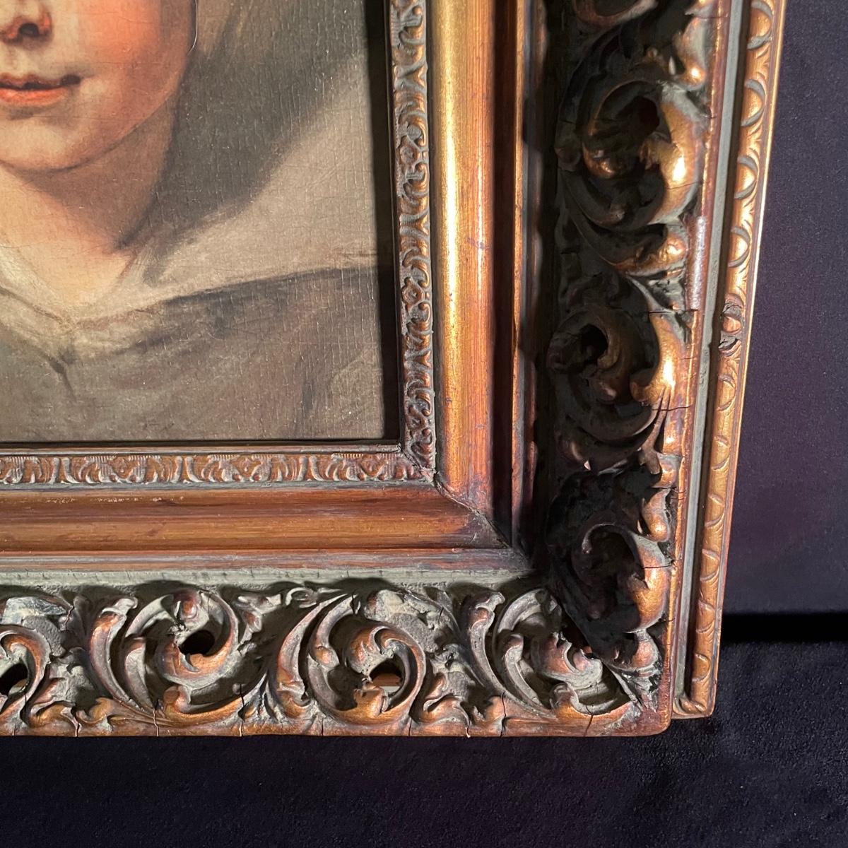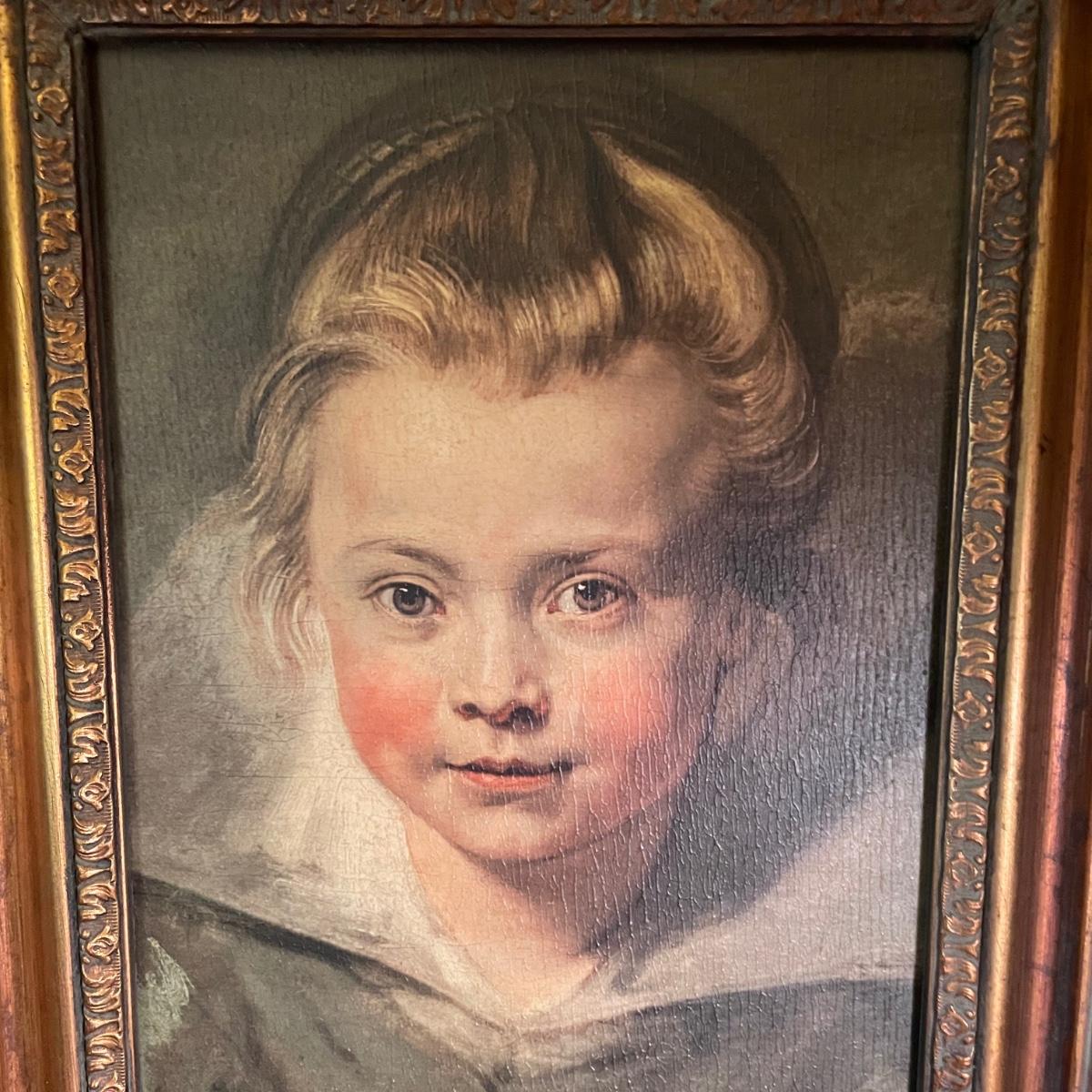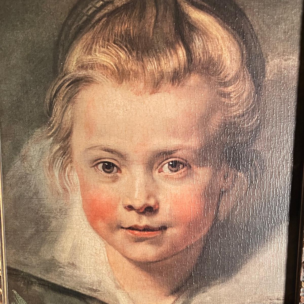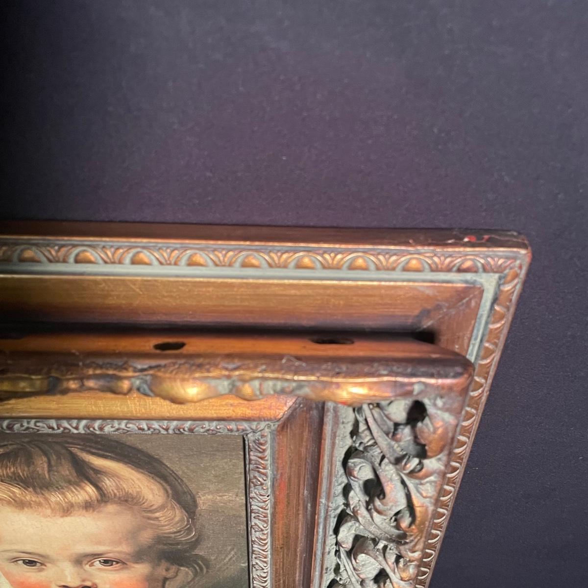 This painting is titled “˜Child’ by Ruben. It has no signature. The back of the frame states that this is a reconstruction. It is housed in an ornate quality wood frame ready to hang, that measures 18” x 15”.