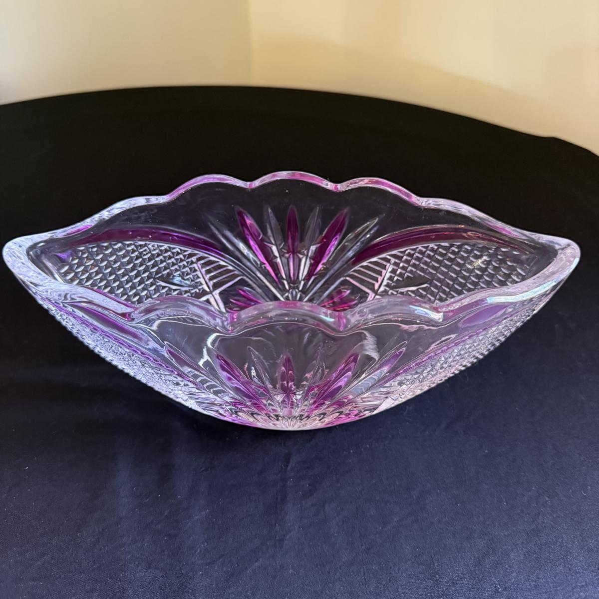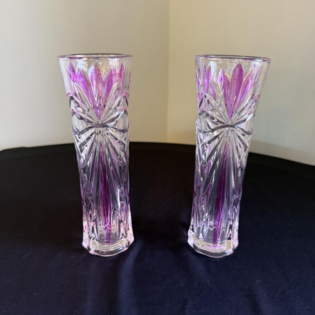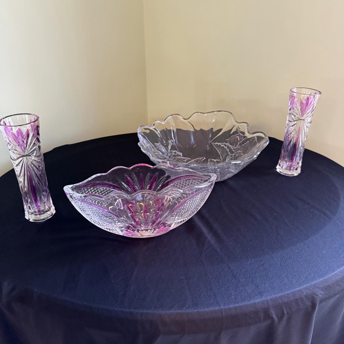 This lot contains a gorgeous collection of four crystal with a striking purple flash color. First we have a stunning soft lavender bowl with botanical details etched into it. This piece measures 11.5” x 13” x 3.75”H. Then we have a gorgeous oval bowl with scalloped edges and lovely detailing, of course featuring the purple flash of color. The last two are a set of narrow matching vases. These pieces both measure 2.5”D x 7.5”. Shipping available.