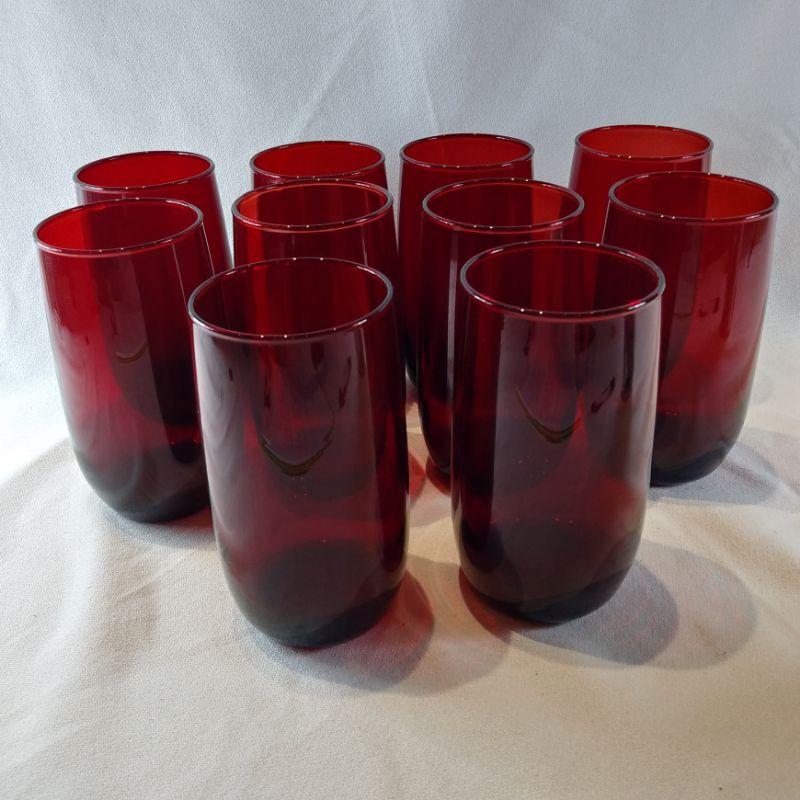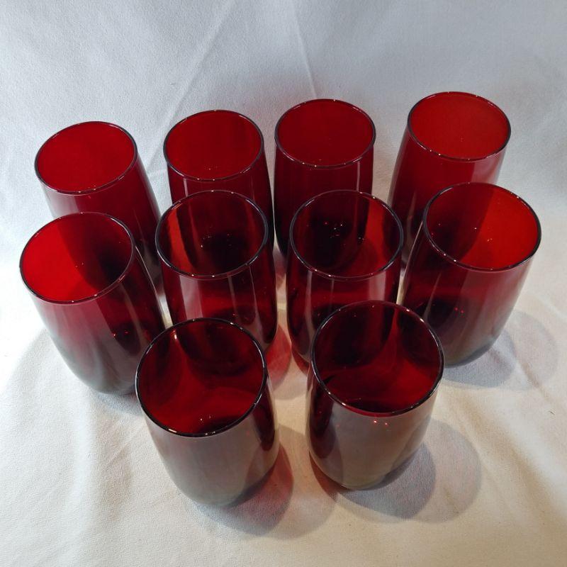 A great set of 10 Ruby Glass tumblers. Good size - 5-inches tall. Note: they match the Ruby Red Pitcher offered elsewhere in this auction. All are in very good condition - no chips or cracks. Ready to add to your Ruby Glass collection.