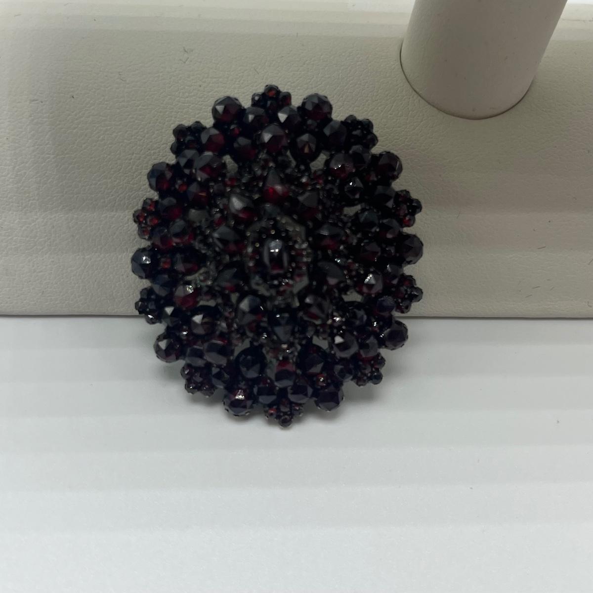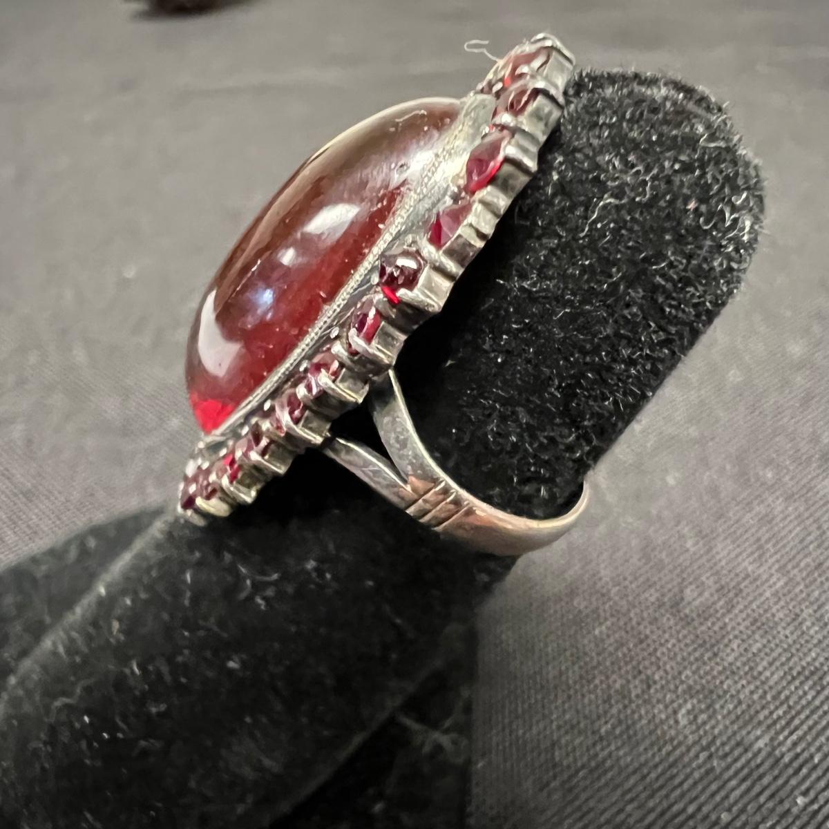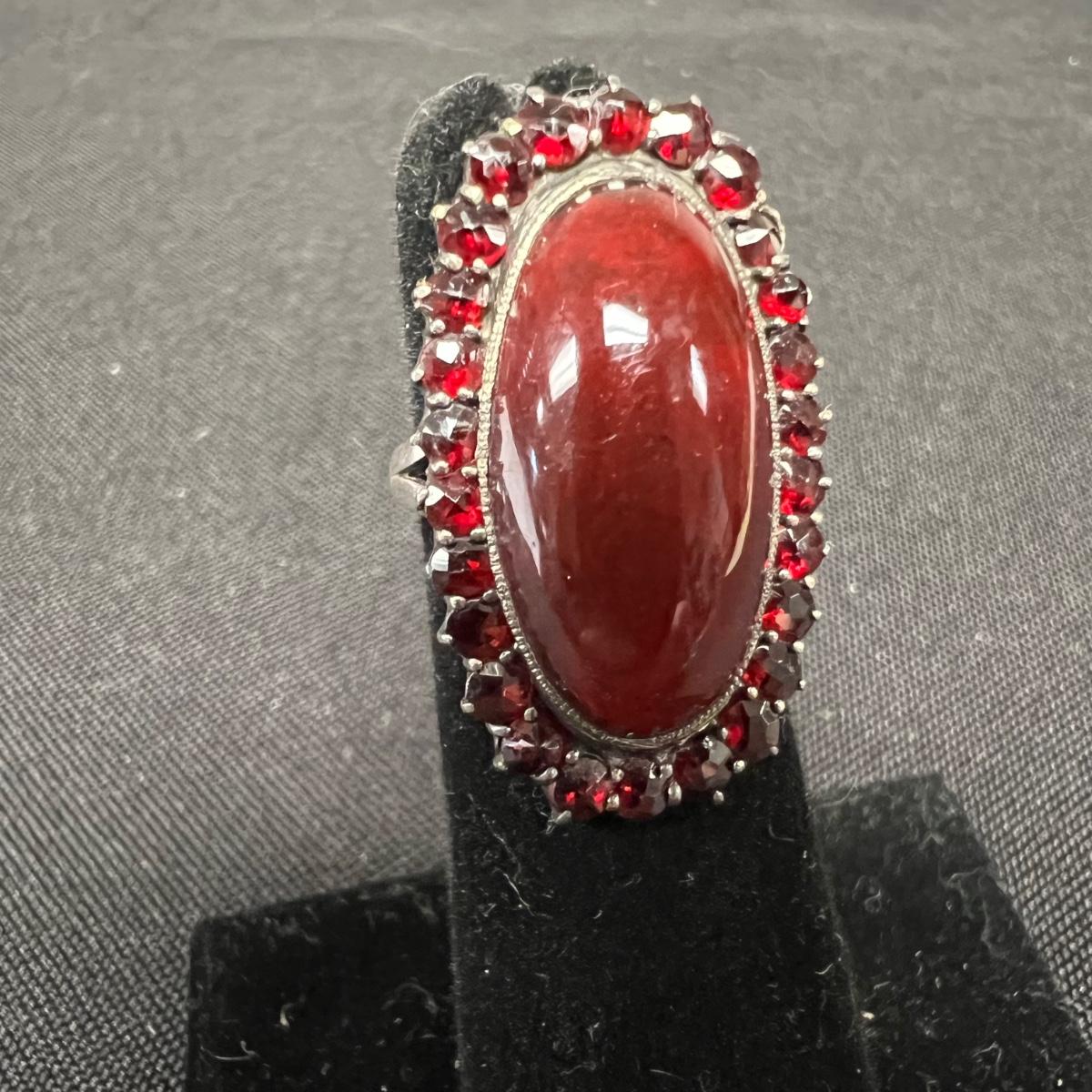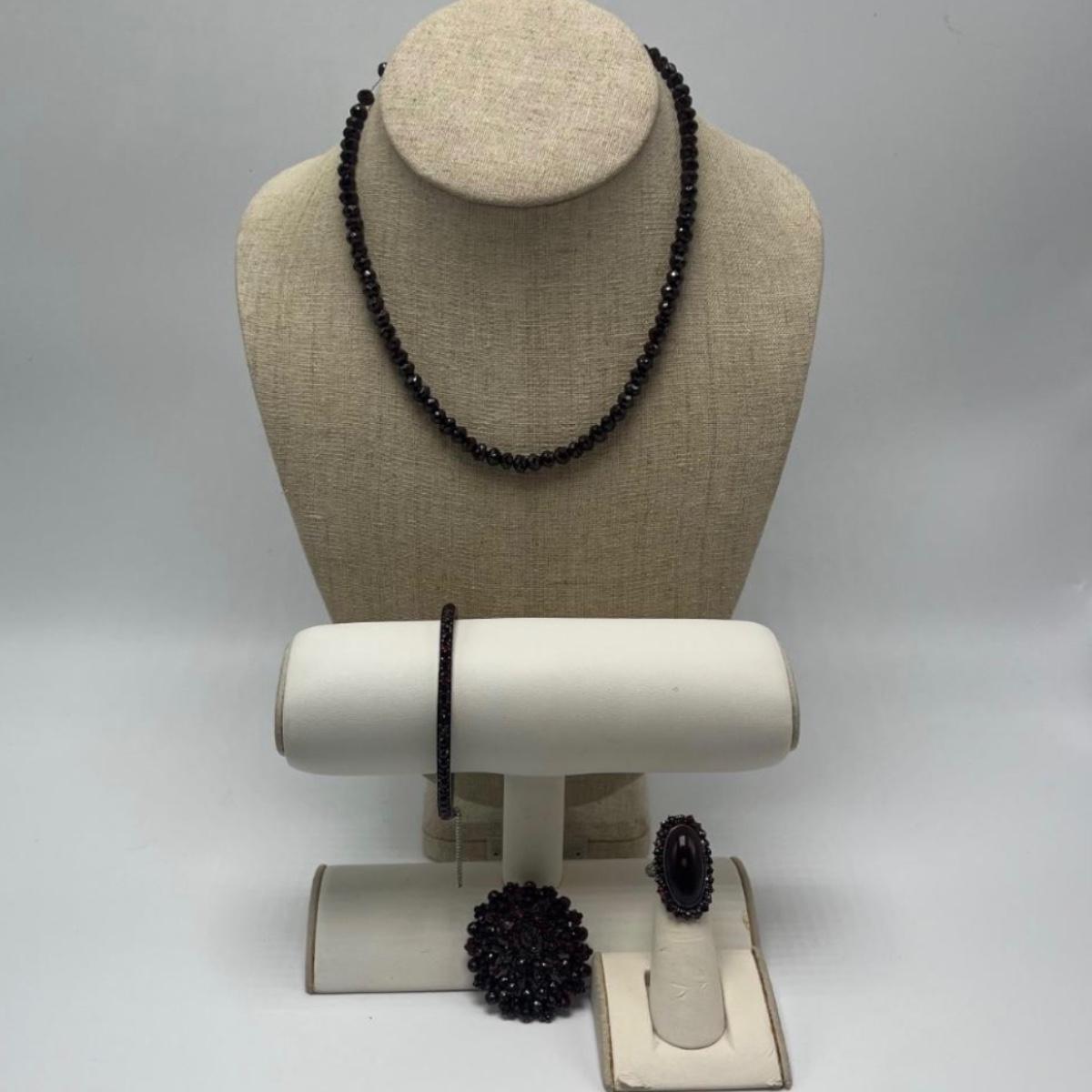 Lot includes a brooch, necklace, ring and bracelet that appear to be a set all with ruby colored stones. No markings were found on jewelry. The brooch has a unique back that opens up with a space to fit something small inside.