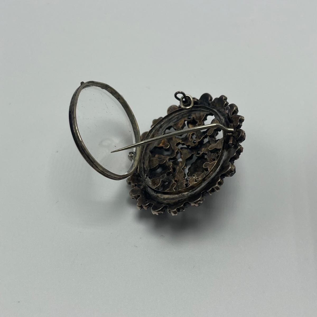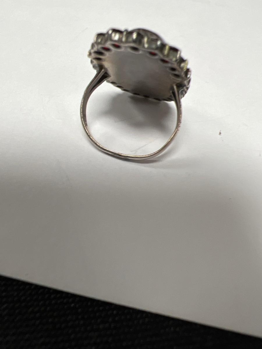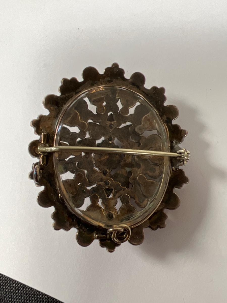 Lot includes a brooch, necklace, ring and bracelet that appear to be a set all with ruby colored stones. No markings were found on jewelry. The brooch has a unique back that opens up with a space to fit something small inside.