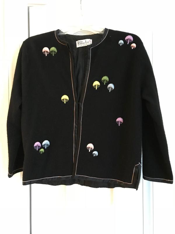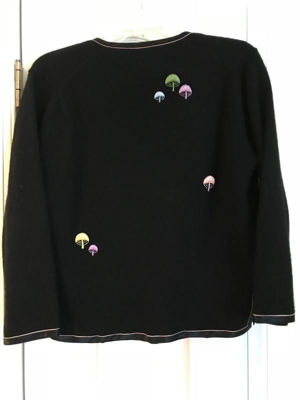 Fully line black fine wool cardigan, handmade by Ruby Ramsey Ltd of Hong Kong. Fully lined in black and edged in pink. All over groupings of embroidered mushrooms in various pastel colors done in heavy trapunto stitching (very 3-D). Hook and eye closure. Approximately size M- not labeled. Spectacular!