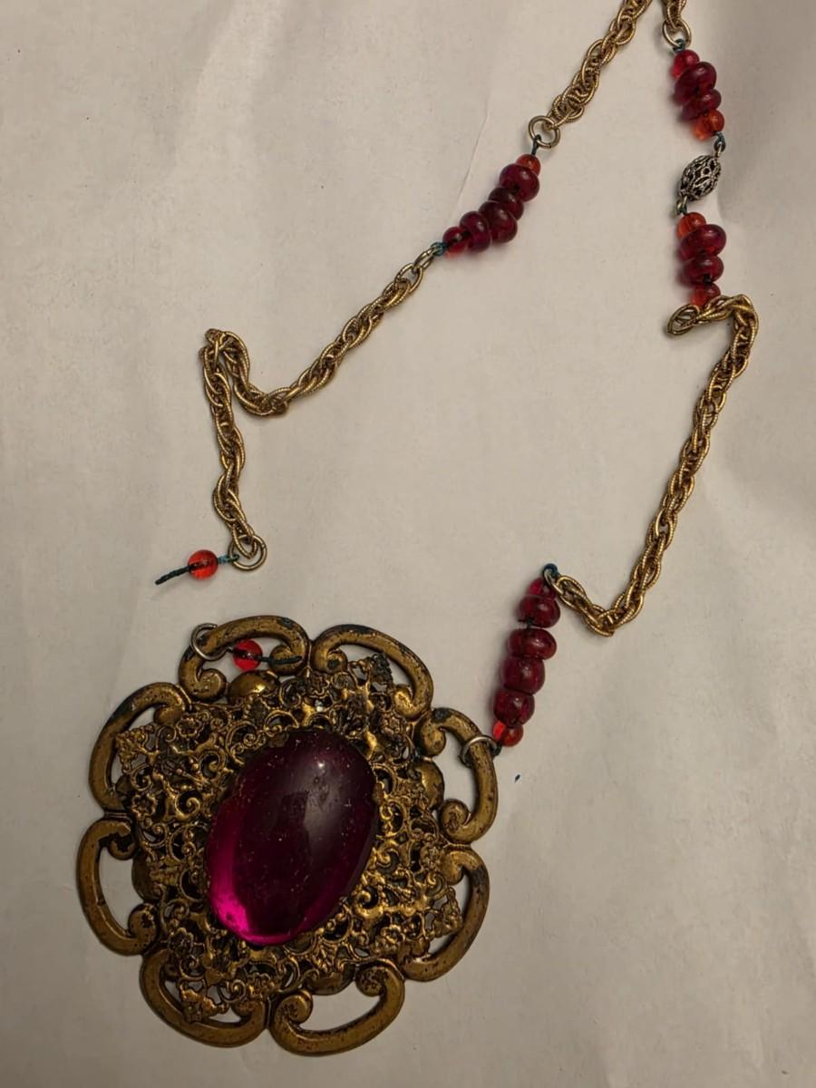 Large pendent about 4 inches tall. The chain has broke of the pendent on one side. 18 in strand