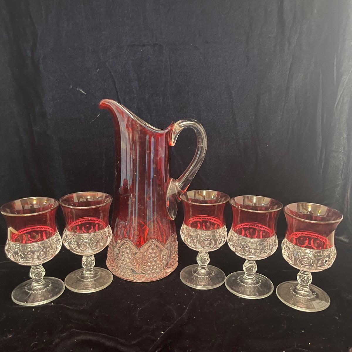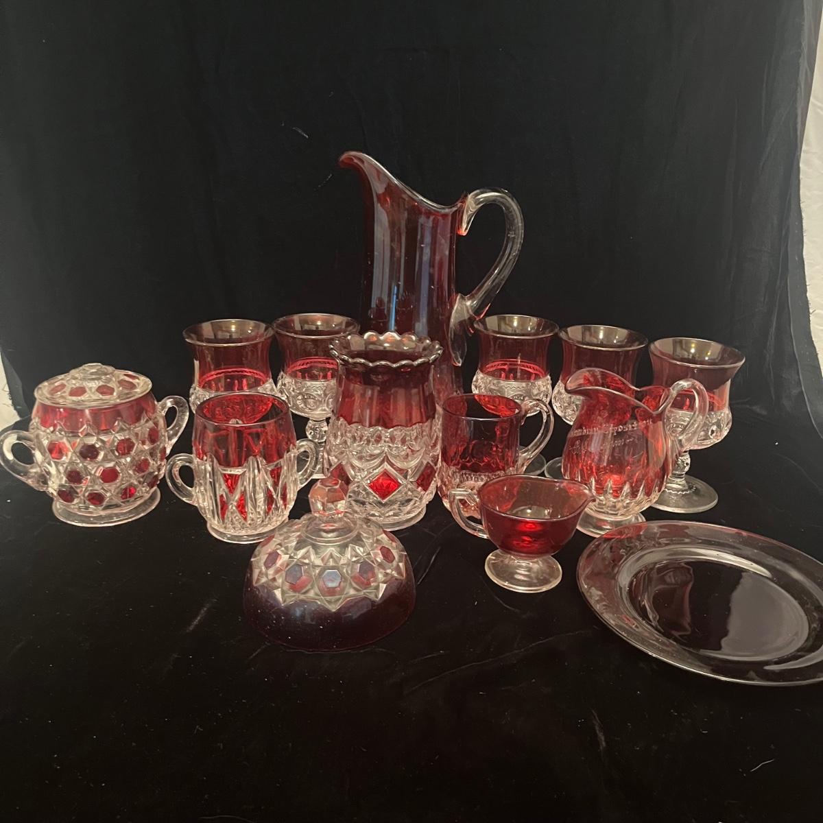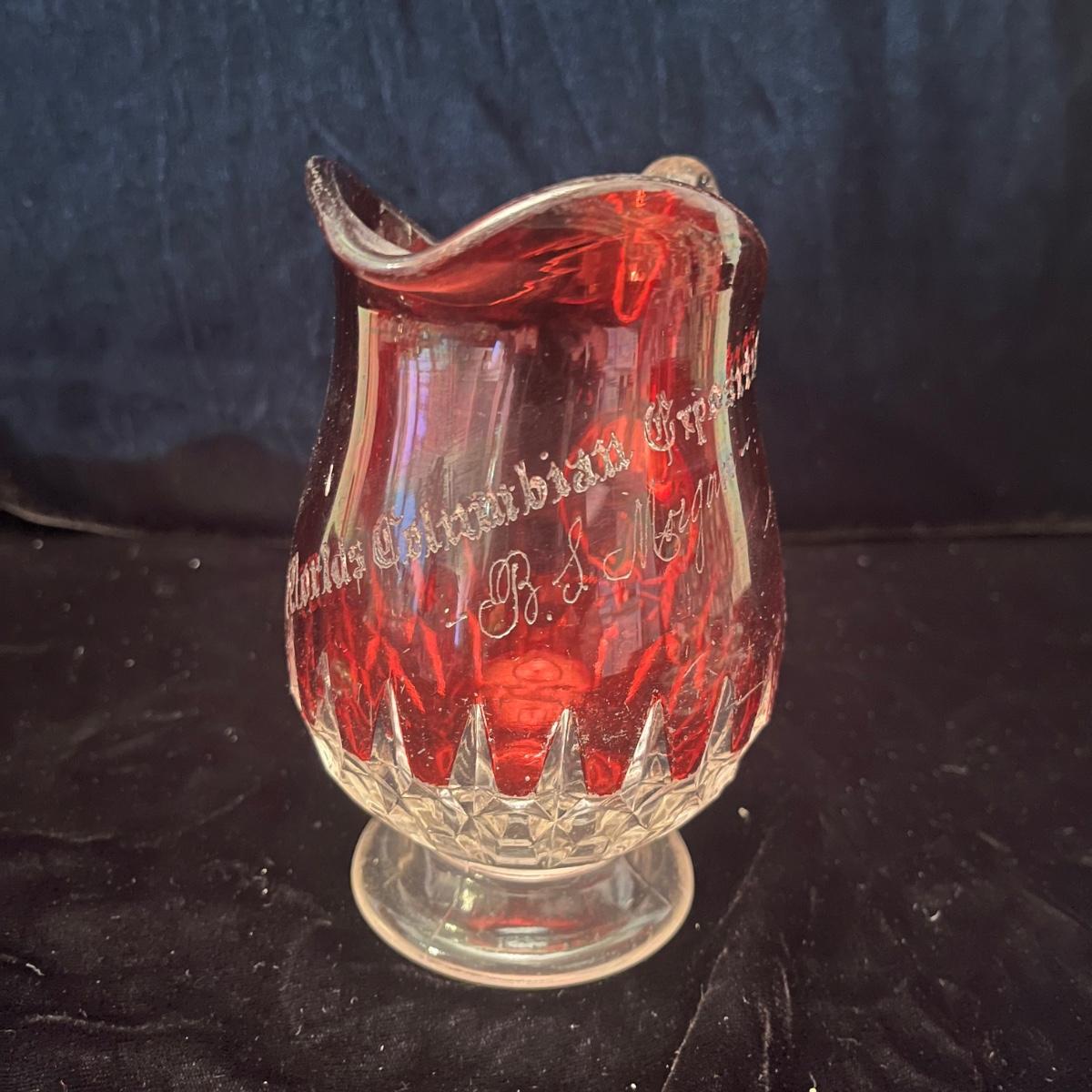 Lot includes five goblets, two pitchers, mug, two double handled cups, vase and more. Largest pitcher measures 5”D x 12”H. Small pitcher has "World's Columbian Exposition" engraved on it.