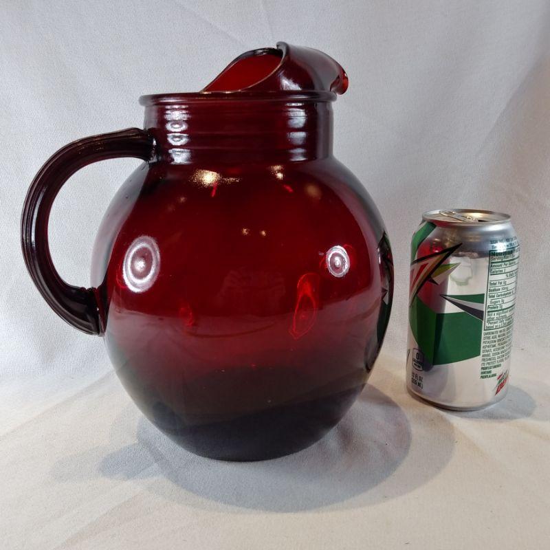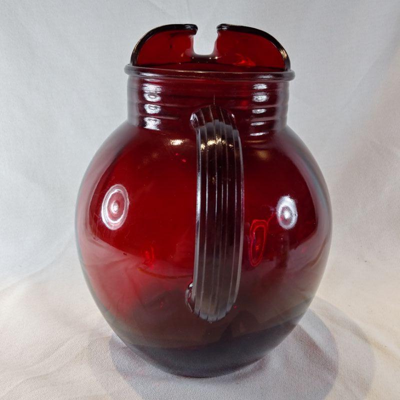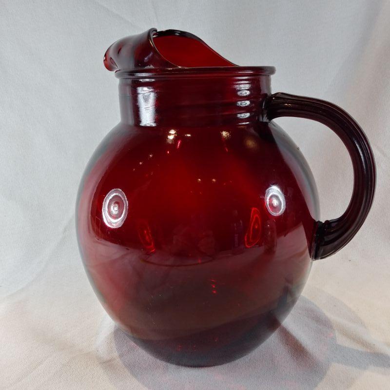 A wonderful, large Ruby Glass Pitcher. Note: this beautiful pitcher matches the set of 10 Ruby Glass Tumblers found elsewhere in this auction. The pitcher is 9-inches tall X 8-inches wide and ready to be filled with your favorite summer punch. In very good condition - no cracks or chips.