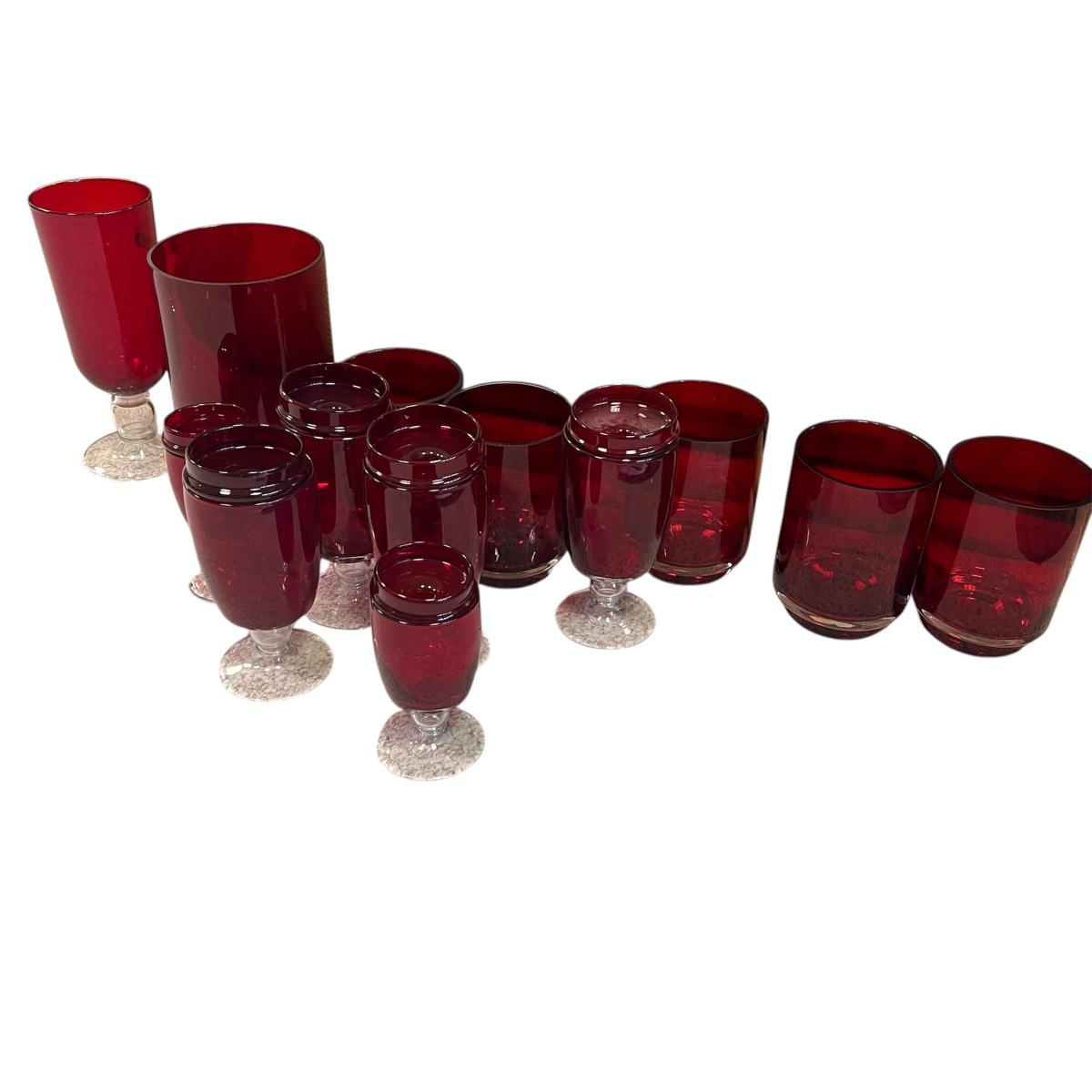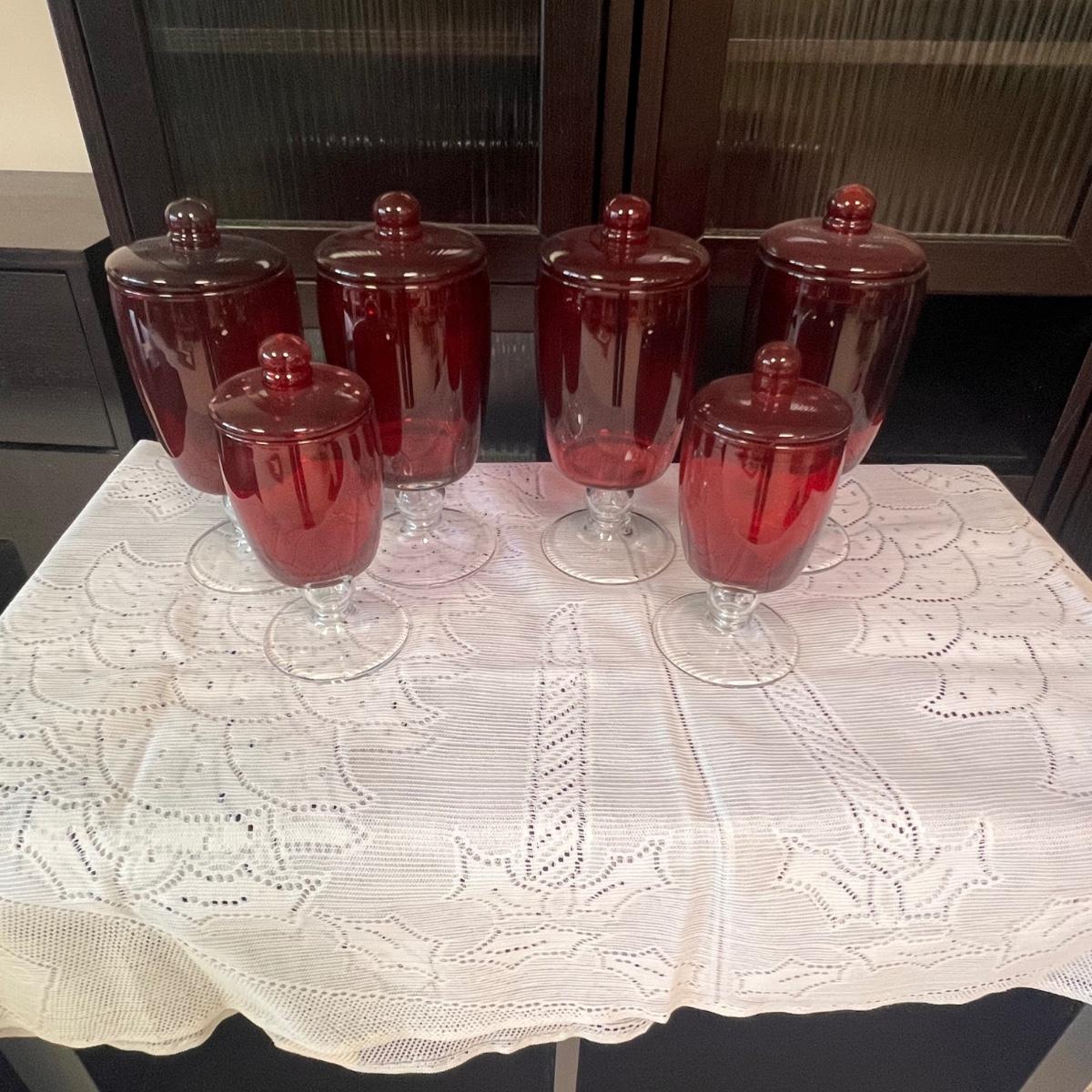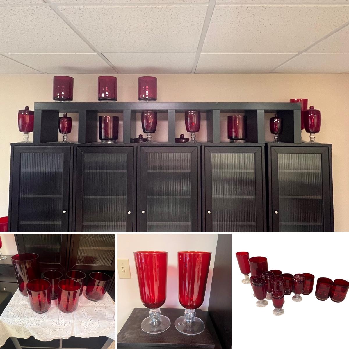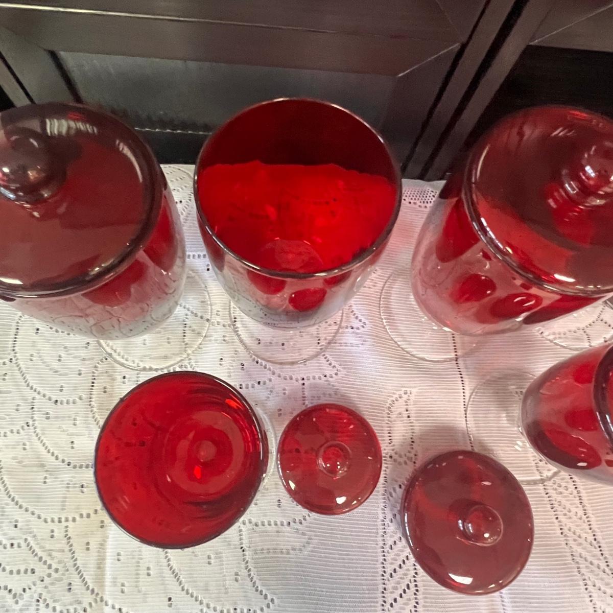 A total of 13 red glass vases. There are seven with clear stems (six of these have lids). The six stemless vases have clear glass bases. Largest vase measures 7”D x 14”H.
