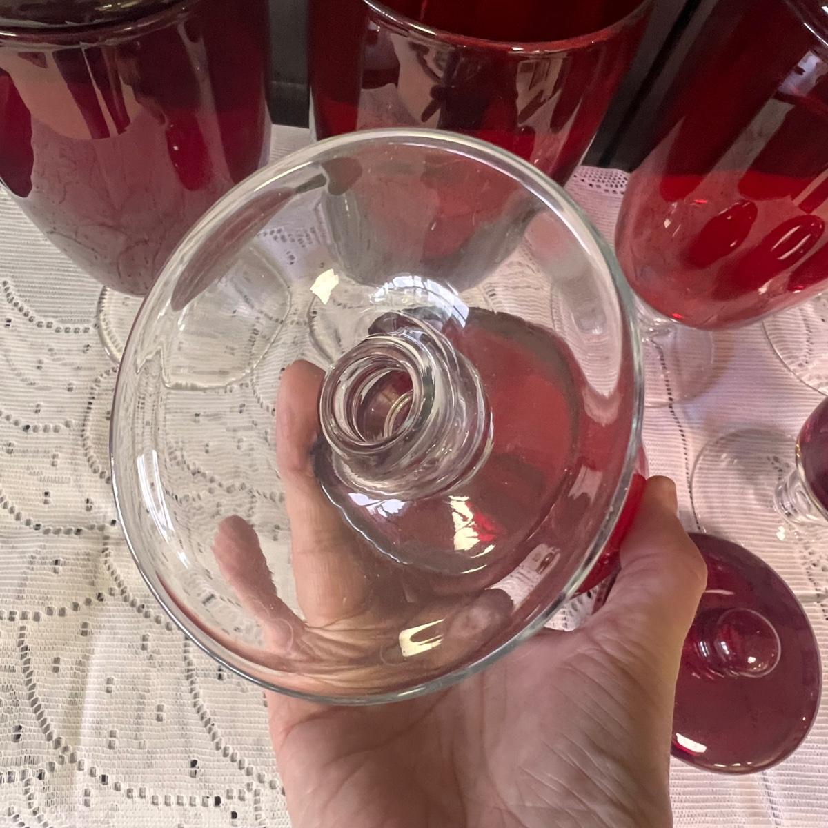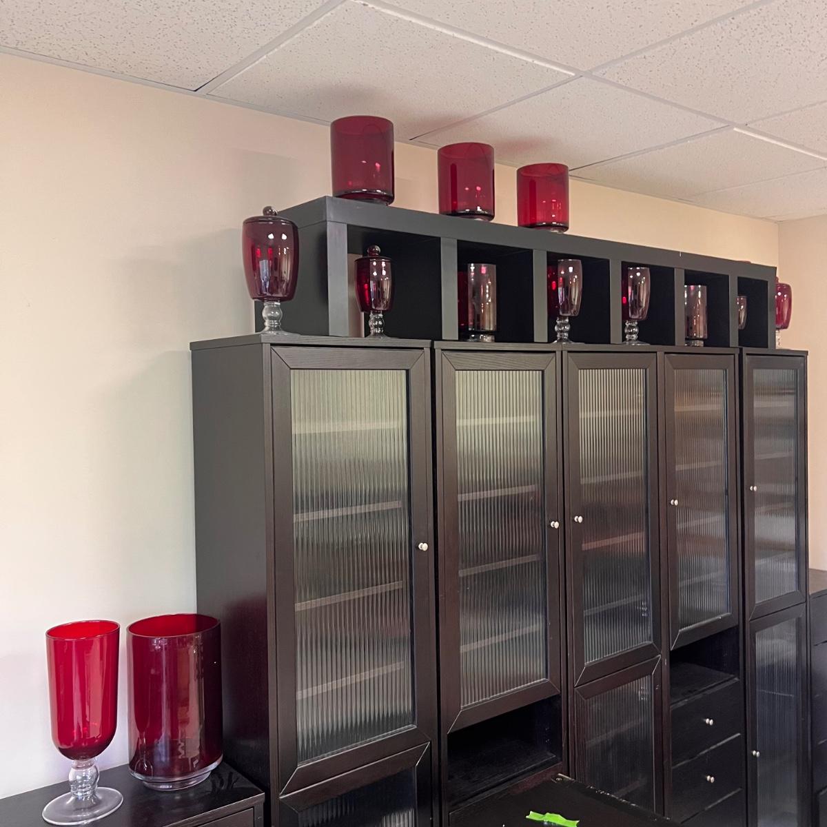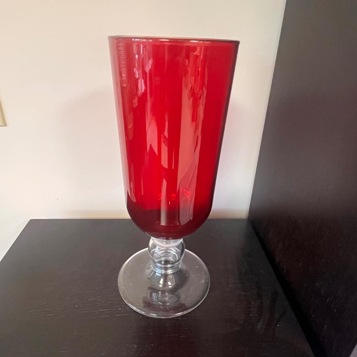 A total of 13 red glass vases. There are seven with clear stems (six of these have lids). The six stemless vases have clear glass bases. Largest vase measures 7”D x 14”H.