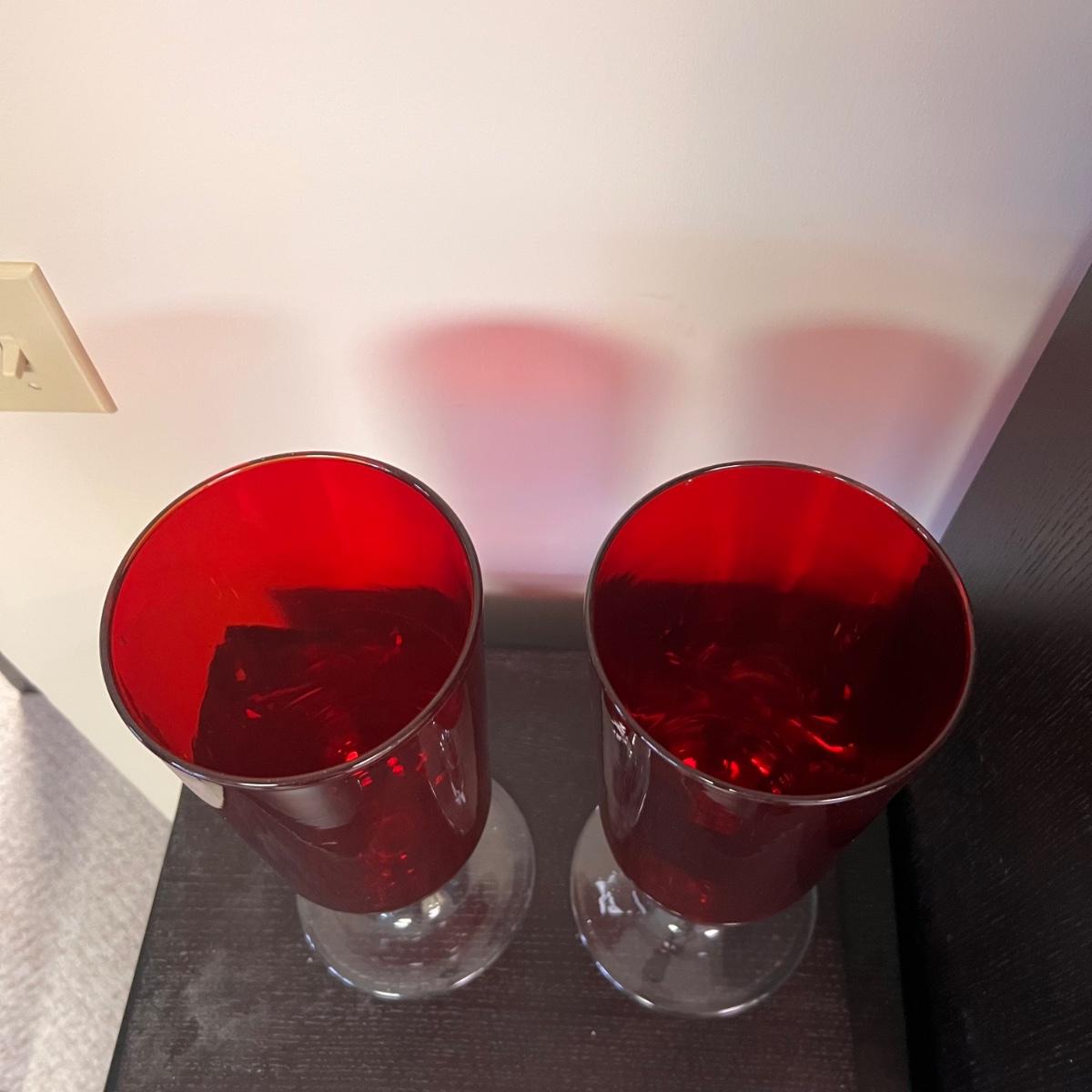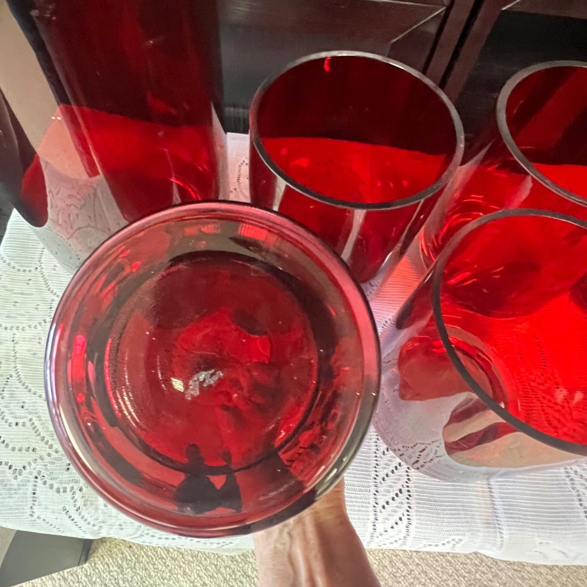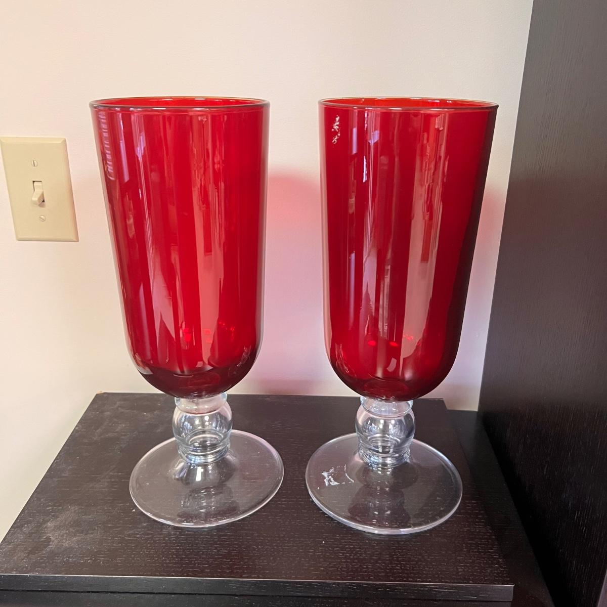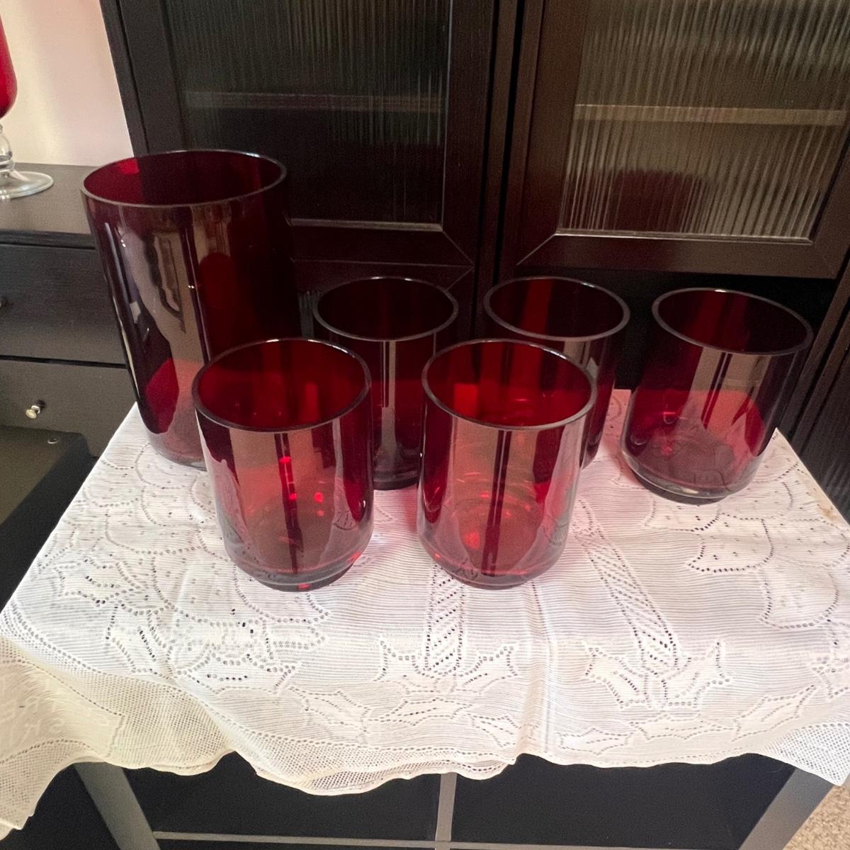A total of 13 red glass vases. There are seven with clear stems (six of these have lids). The six stemless vases have clear glass bases. Largest vase measures 7”D x 14”H.