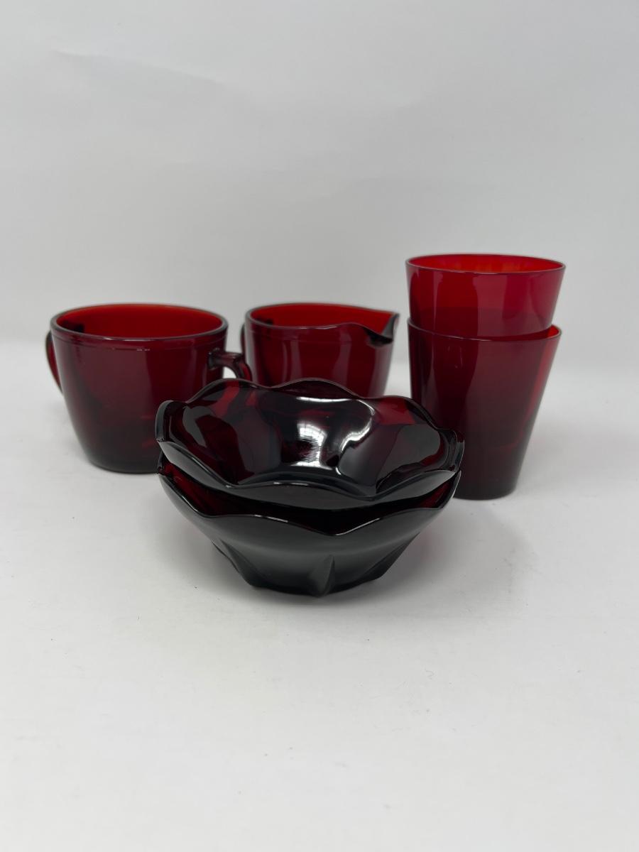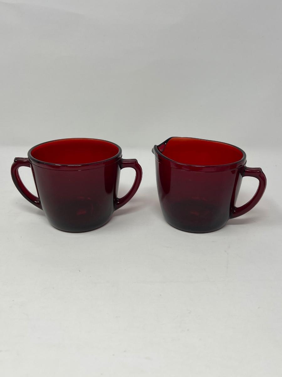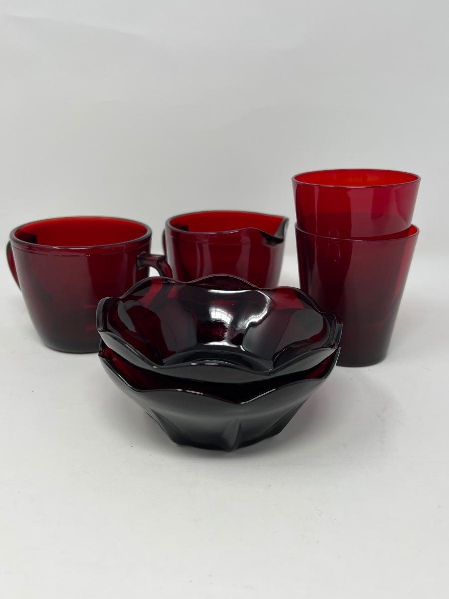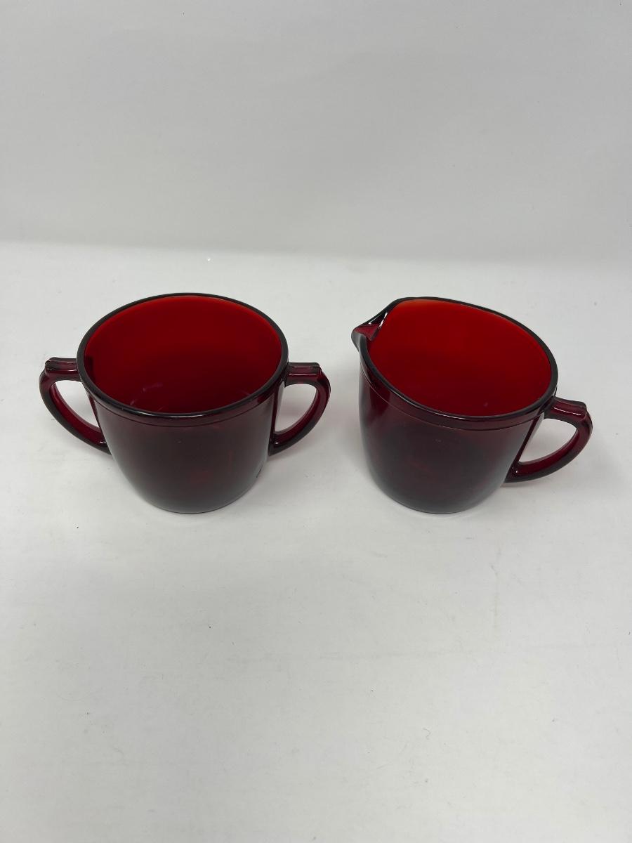 Ruby Red Juice Glass, Tulip Dish & Sugar/Creamer