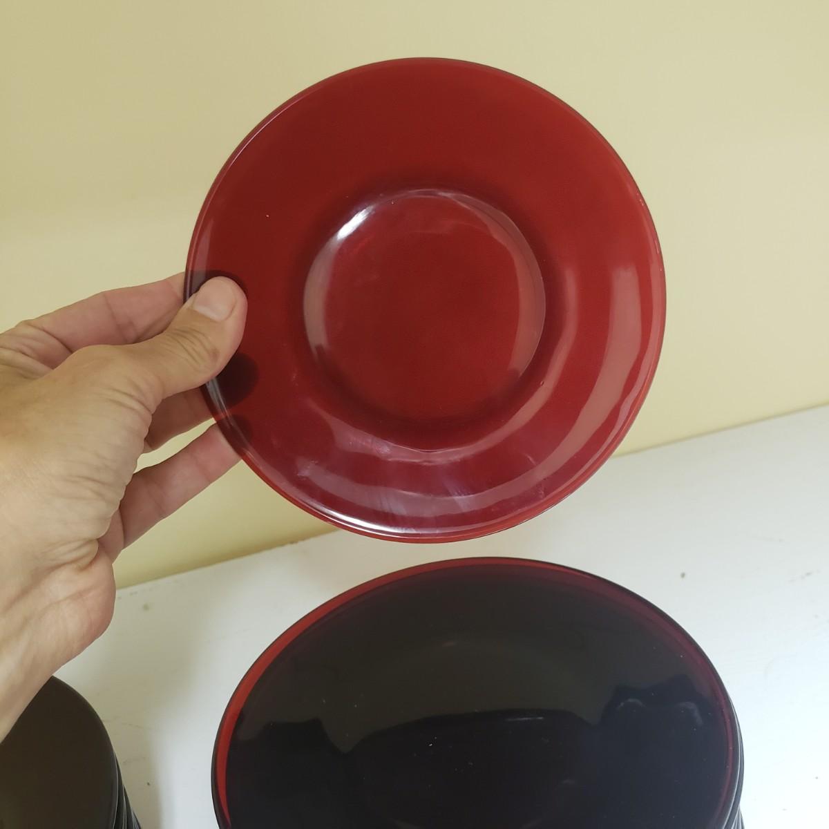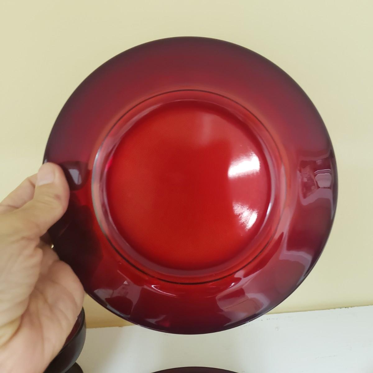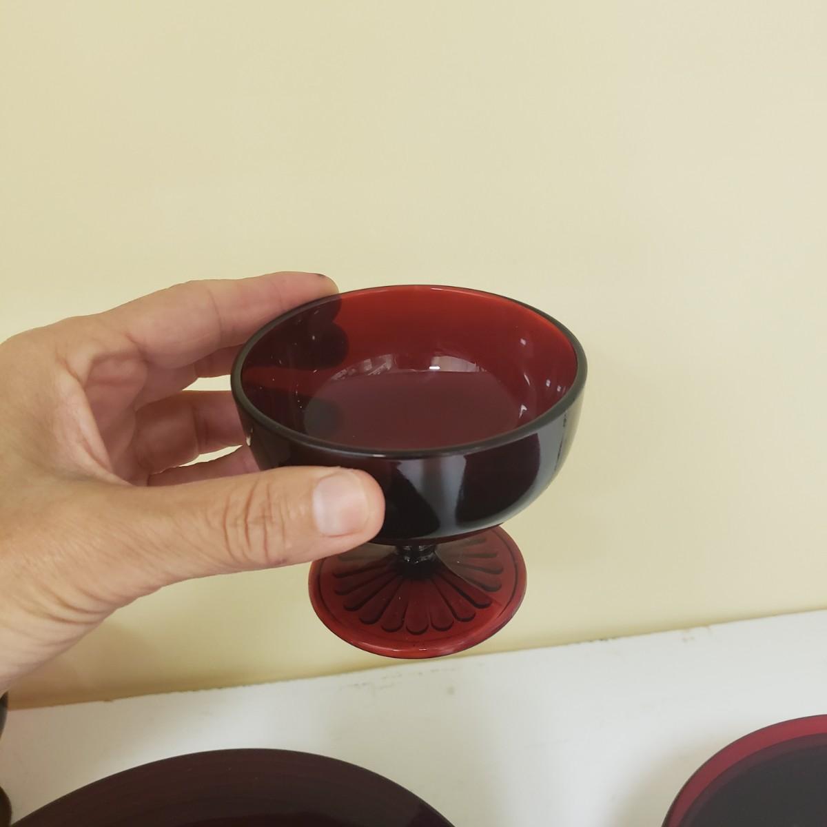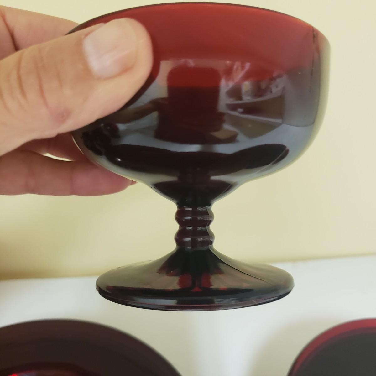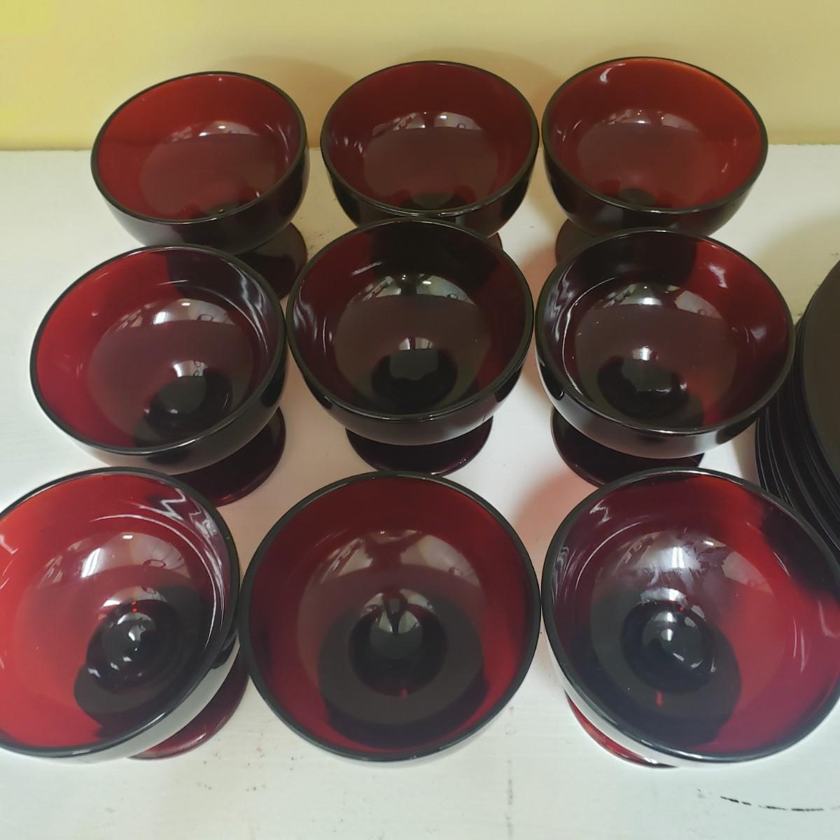 This set of nine sherbert glasses, eight 7" plates and twelve 6" plates is a brilliant ruby red color. The sherbert glasses measure 3.5" x 3"H. All dishes appear to be blemish free.