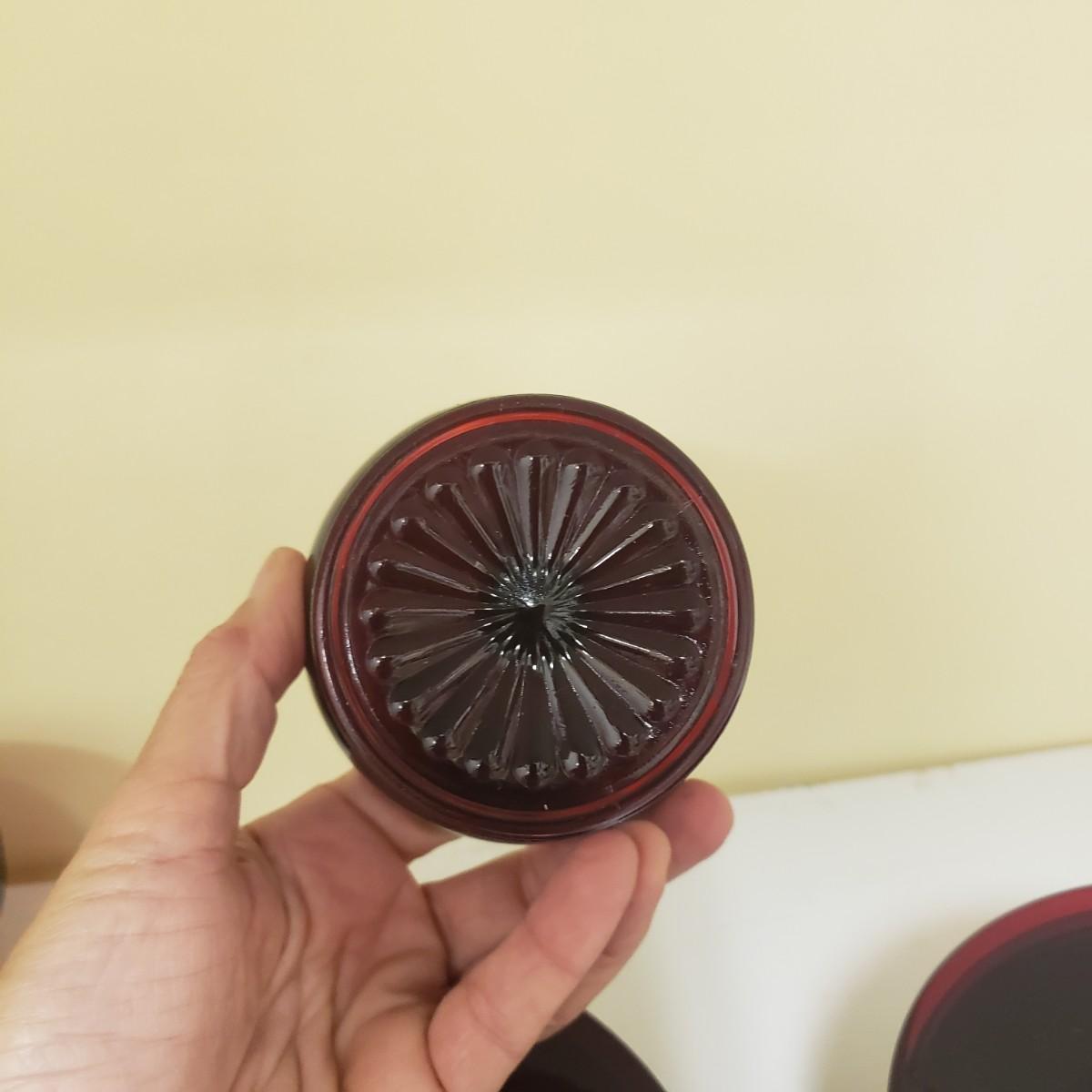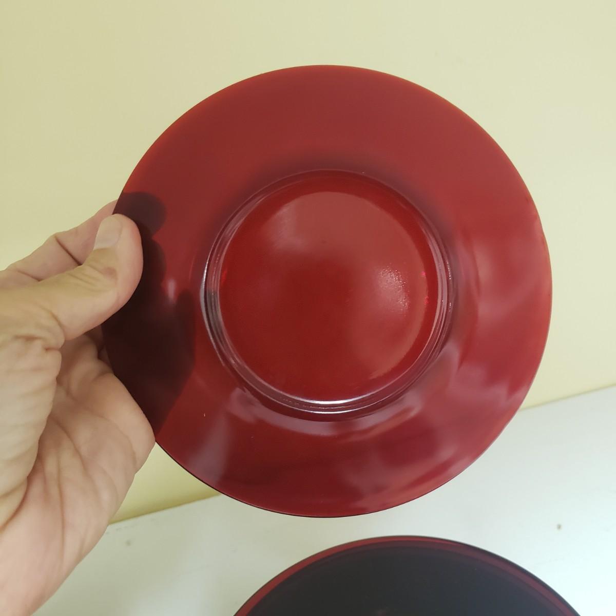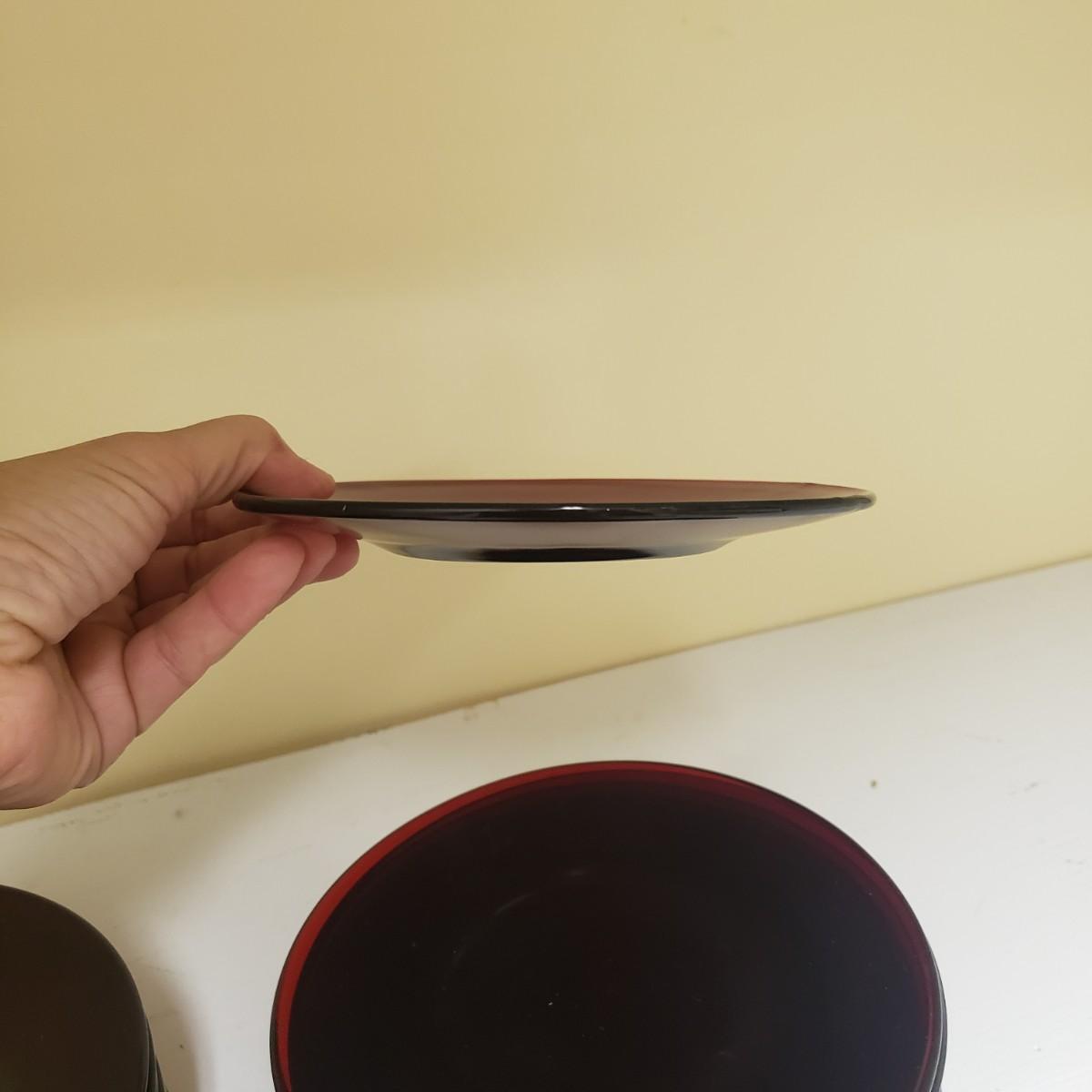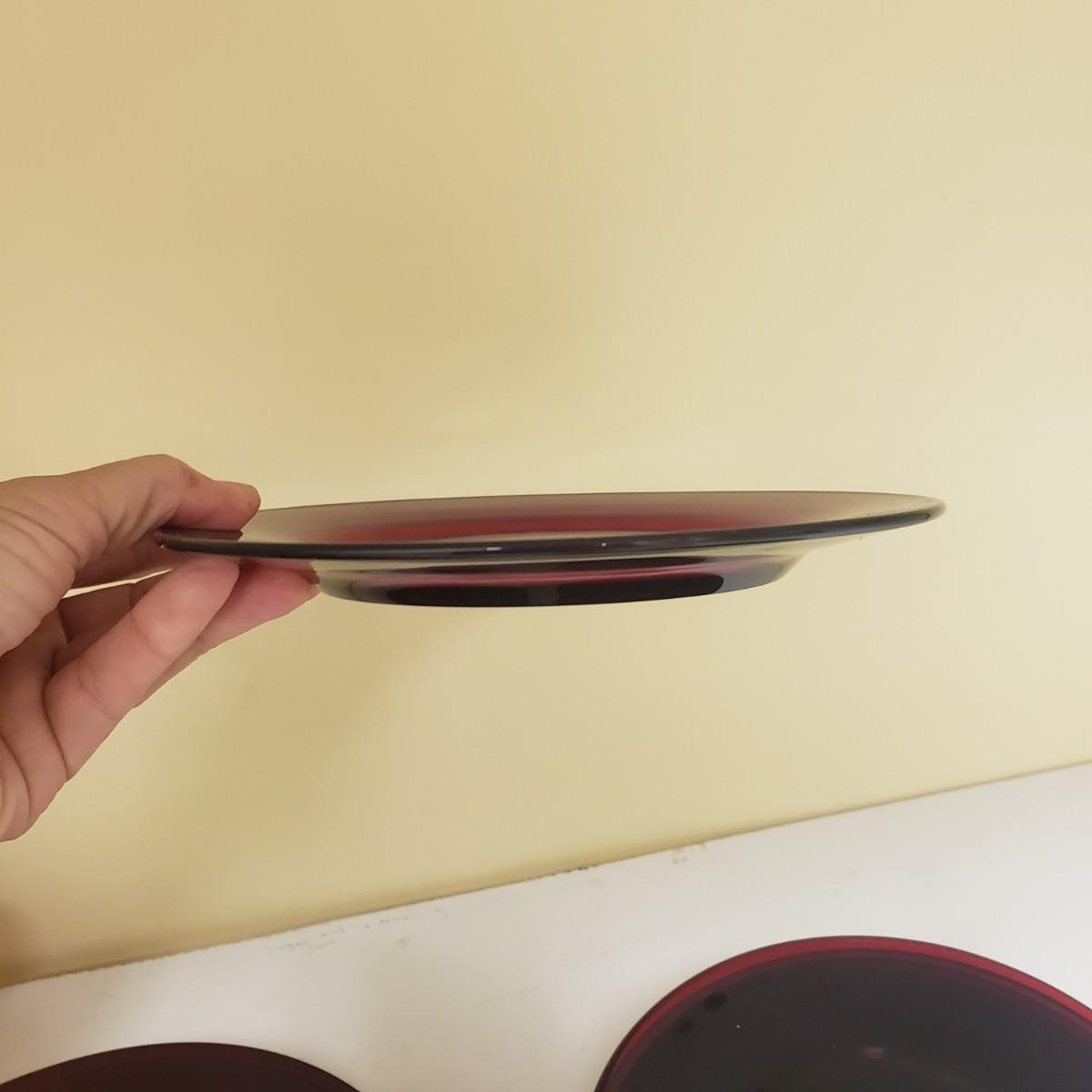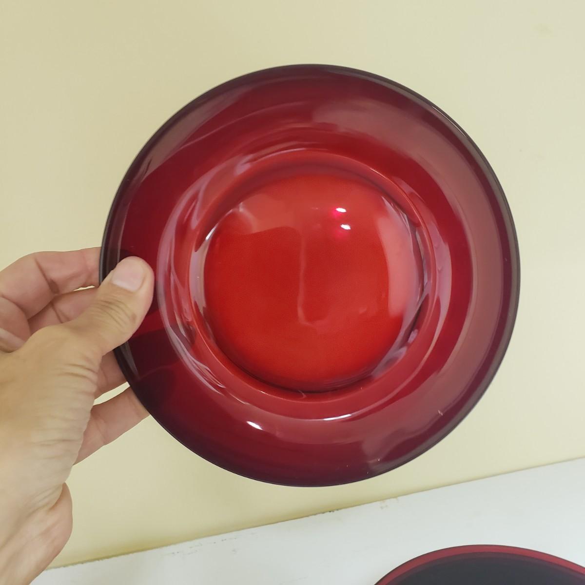This set of nine sherbert glasses, eight 7" plates and twelve 6" plates is a brilliant ruby red color. The sherbert glasses measure 3.5" x 3"H. All dishes appear to be blemish free.
