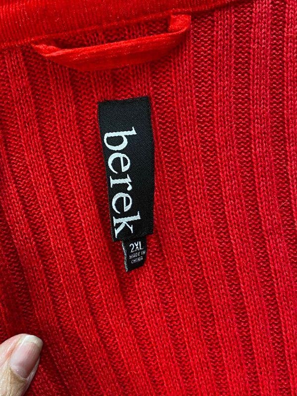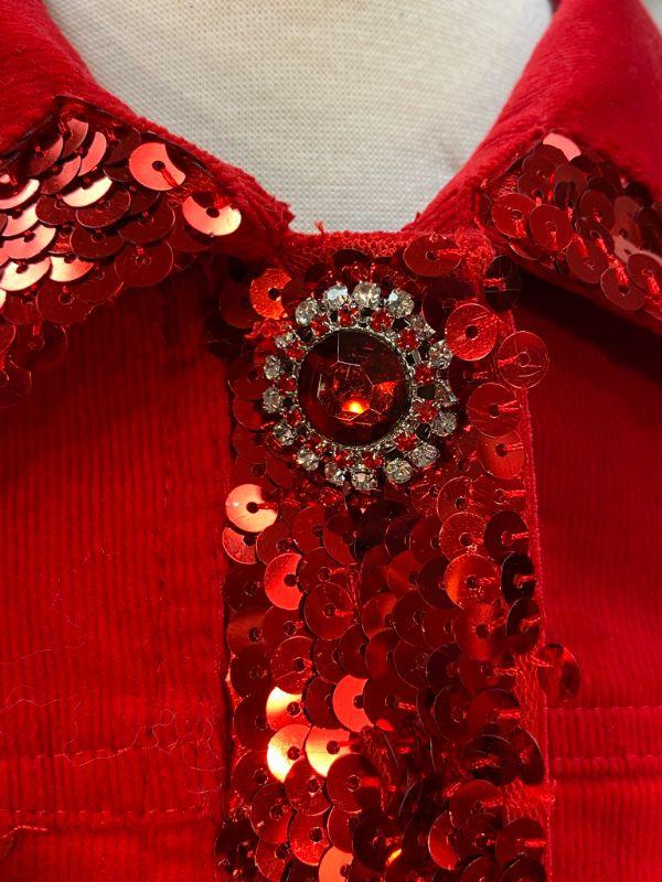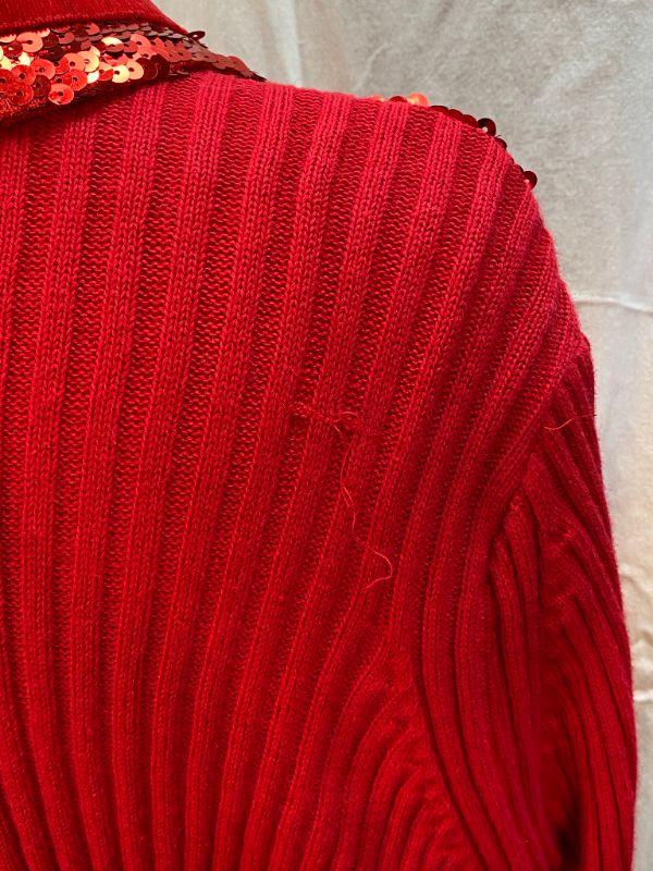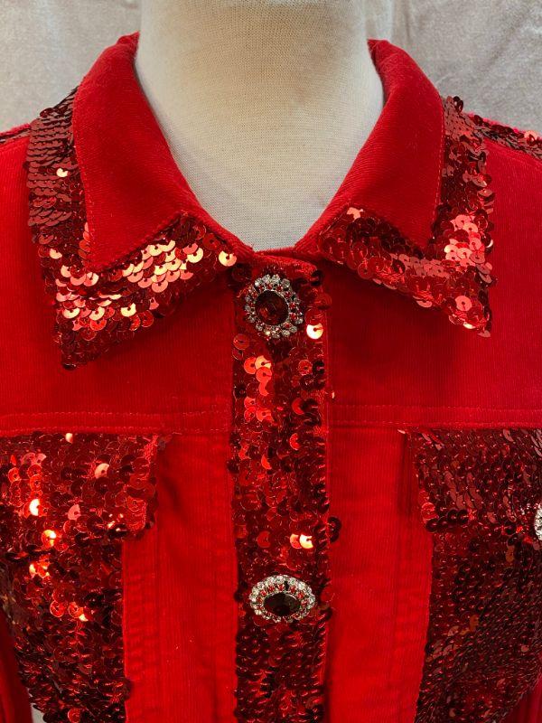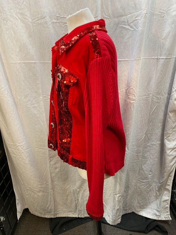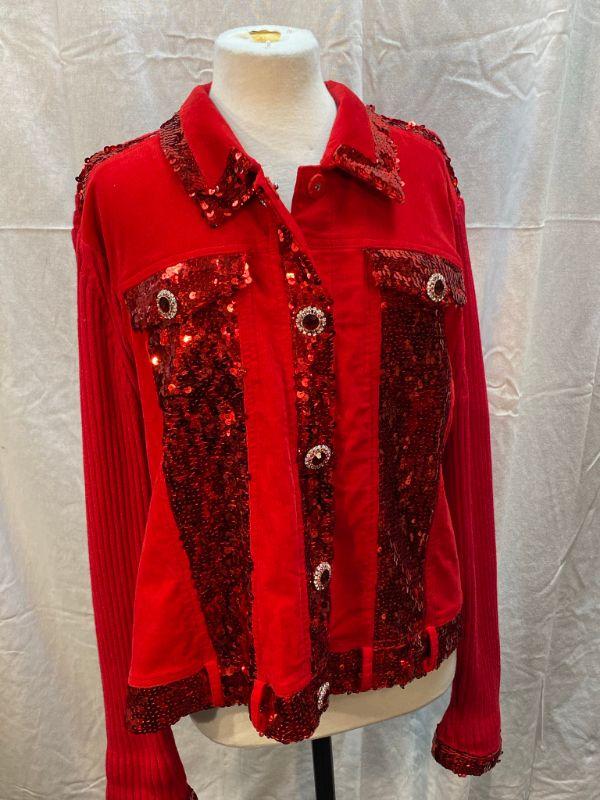 Ruby red sequin and rhinestone sweater by Berek. Snap front closure. A lot of sparkle and shine. Size 2XL, looks like it might run small, its fitted with some stretch. Small snag in the back.