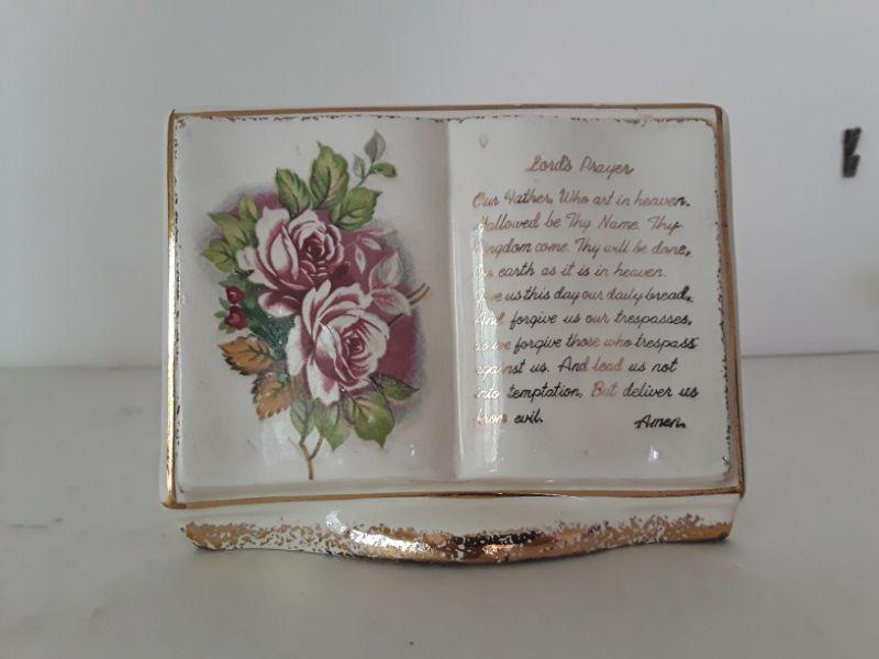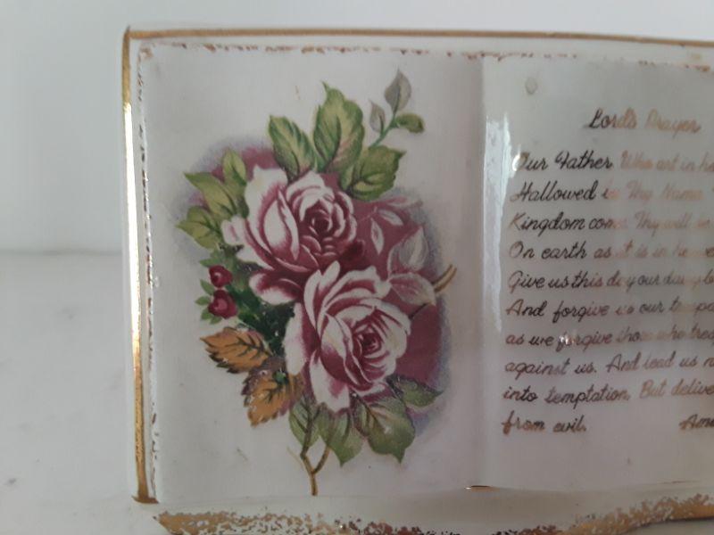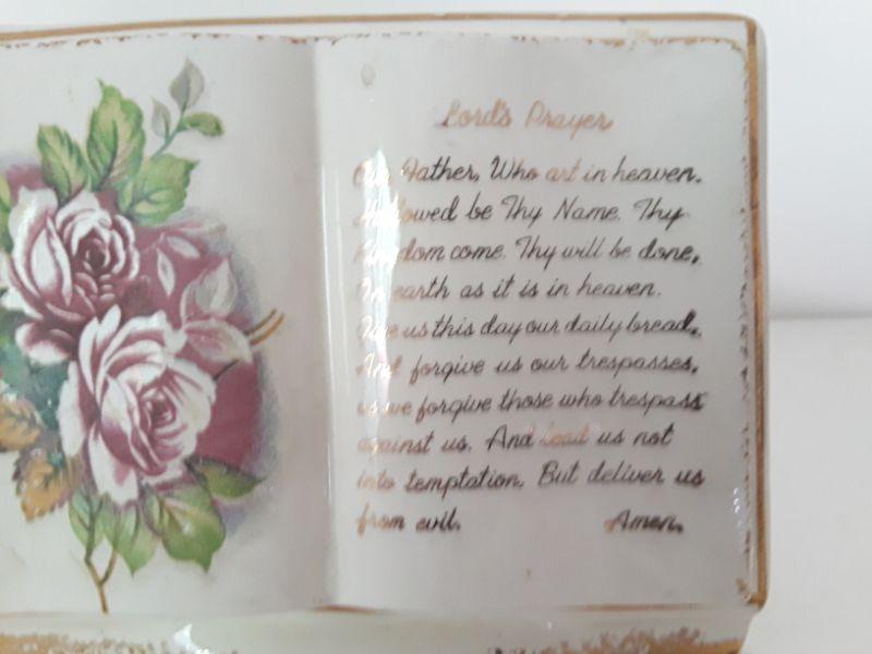 Vintage book shaped table vase, by Ruebens Original. Features the Lords Prayer on one page and a beautiful rose pattern on the other page. No chips.