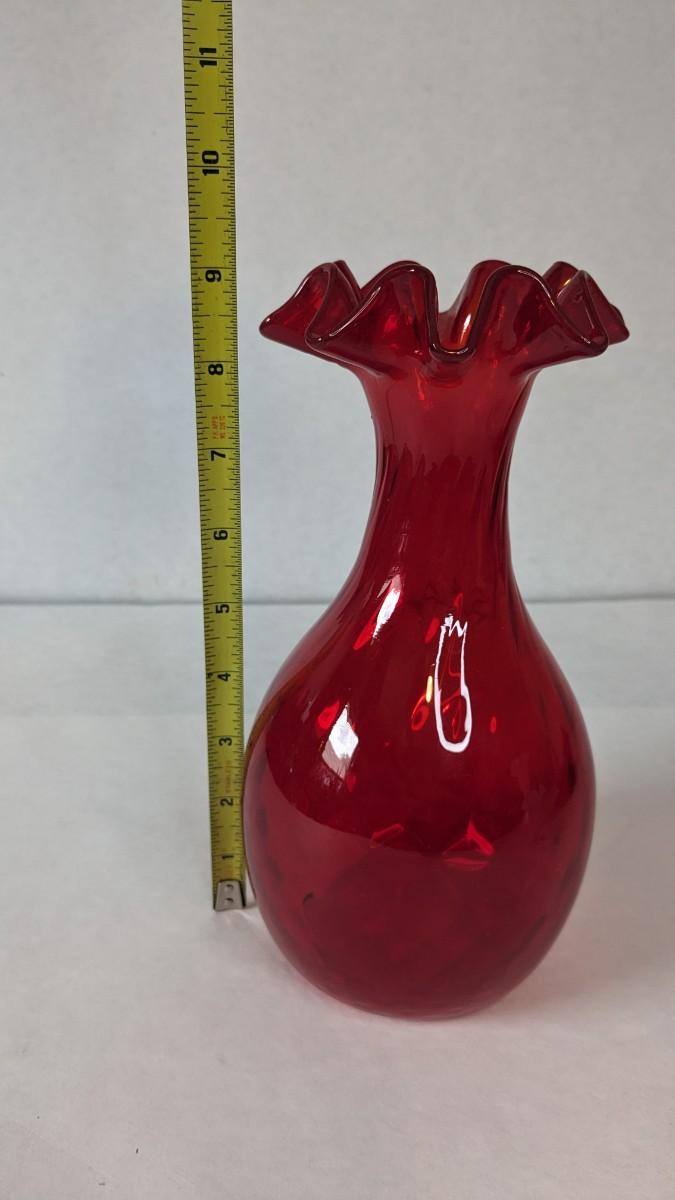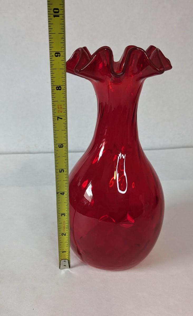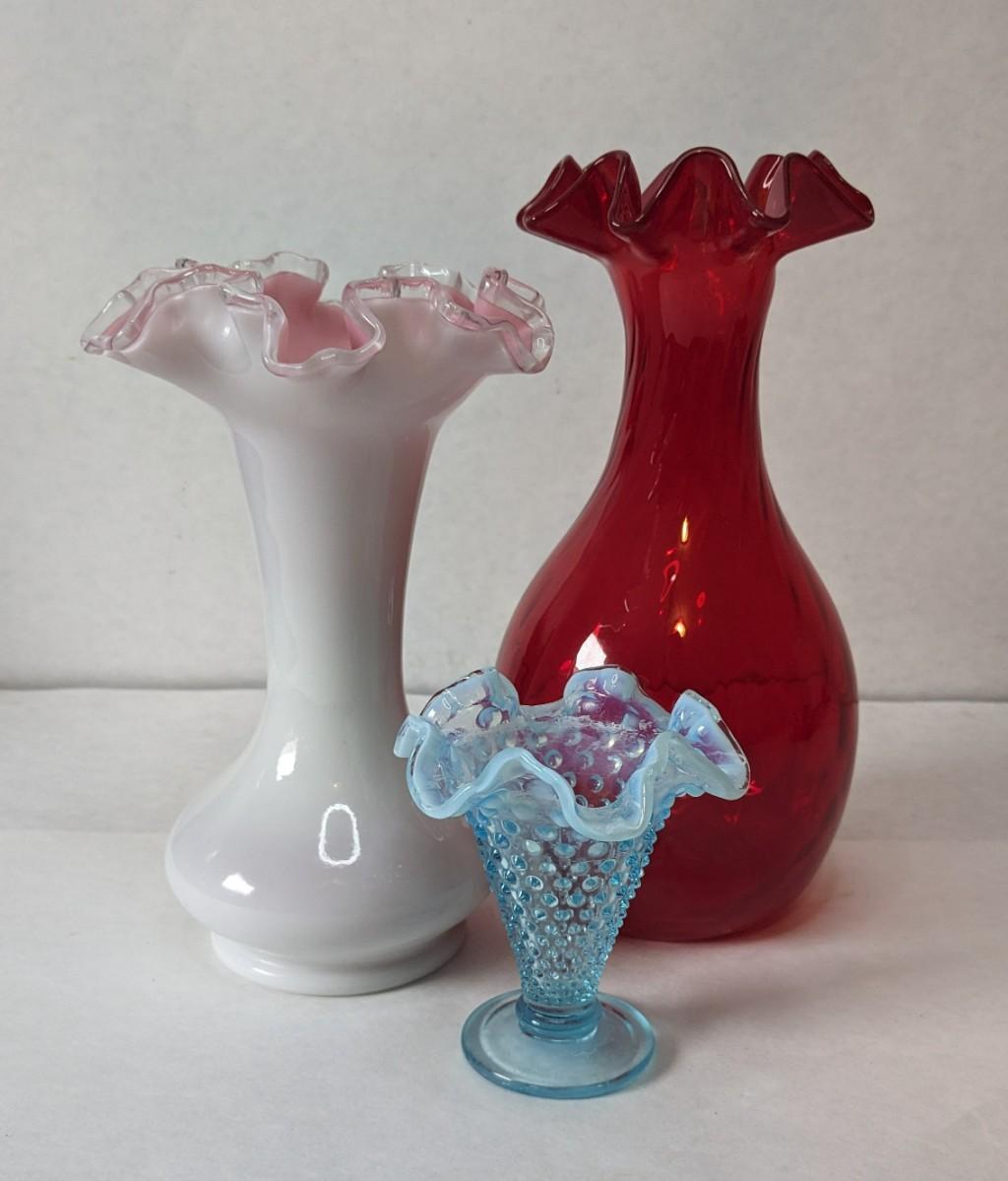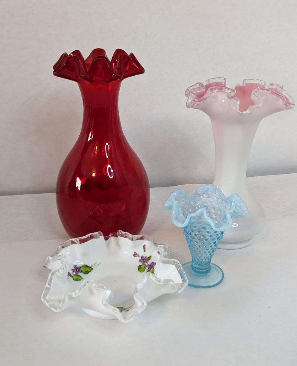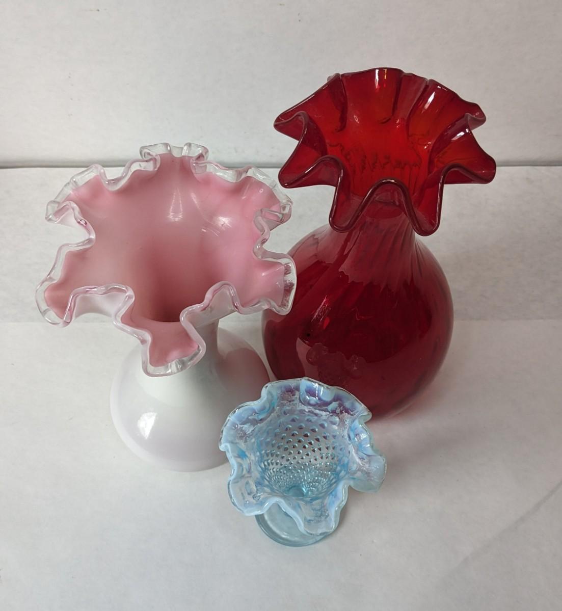 (4) gorgeous ruffle glass pieces varying in size and shape. Includes opalescent blue hobnail presumed Fenton piece. White with inner pink ruffle and solid red ruffle vases, as well as marked Fenton dish from Estes Park. All are in excellent condition with no flaws noted and just SO SO beautiful in person. Extra handling fees will apply.